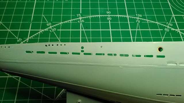 Ковыряю множество недостающих отверстий и шпигатов, врезал трубу выхлопной системы: