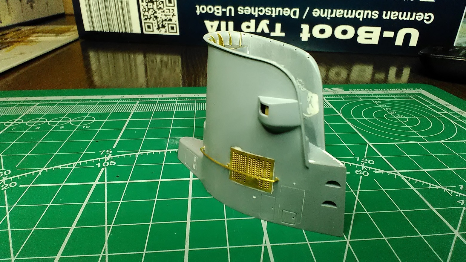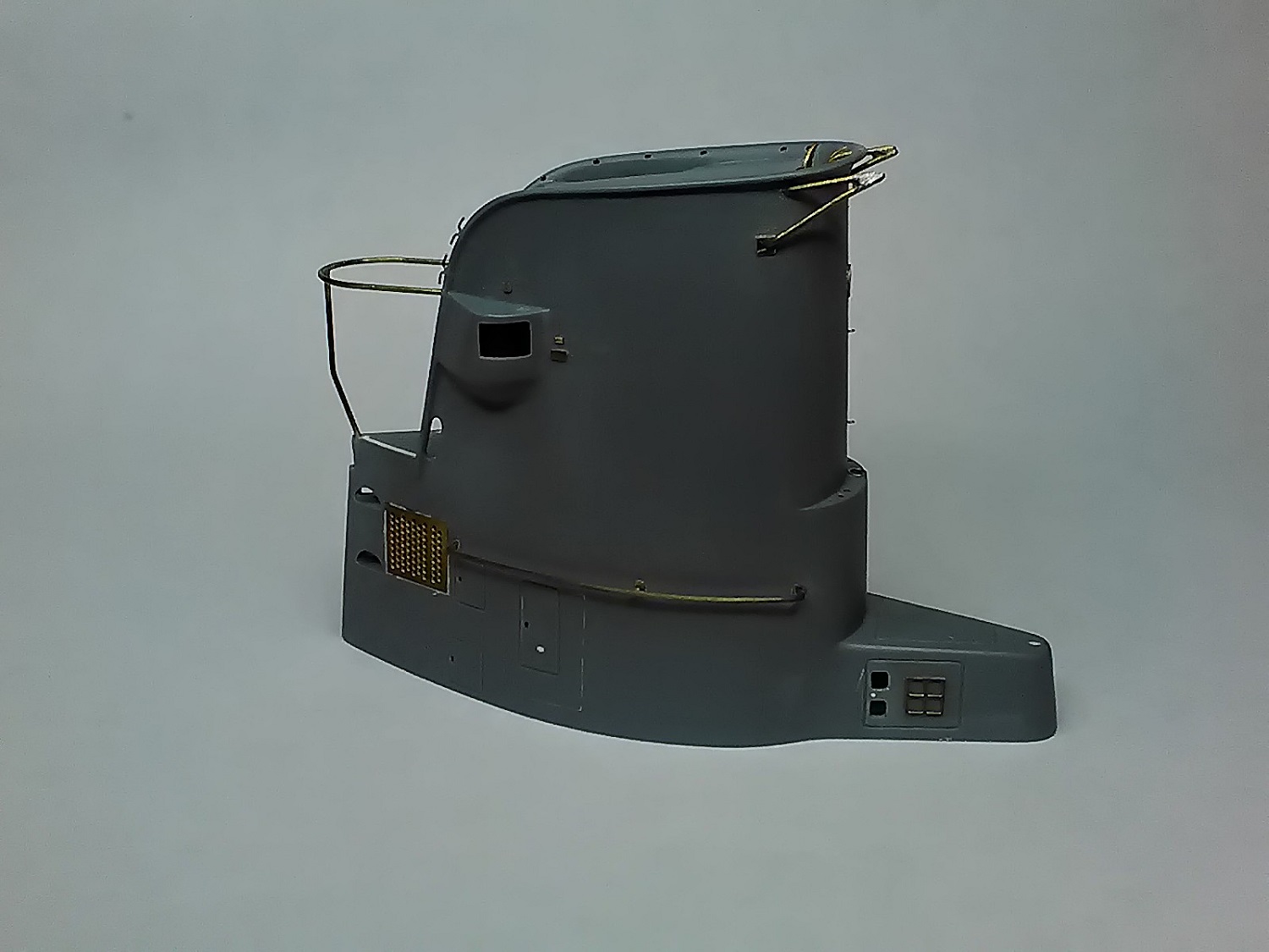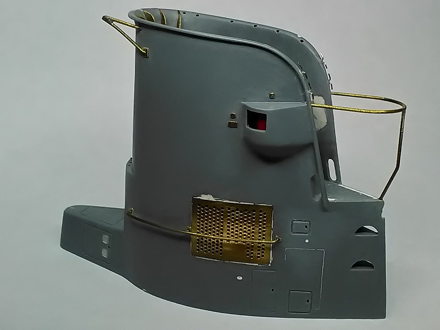 Теперь рубка выглядит так:Затем изготовил закладную "плиту" и впаял в неё шпильки с резьбой 1.6. Чуть ранее нарезал резьбу в алюминиевых перископах и случайно покрыл их хромом