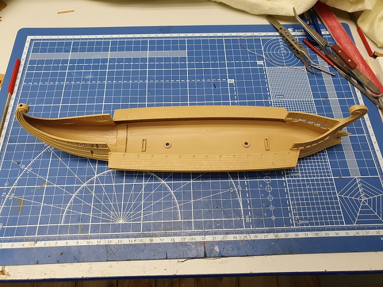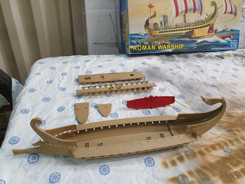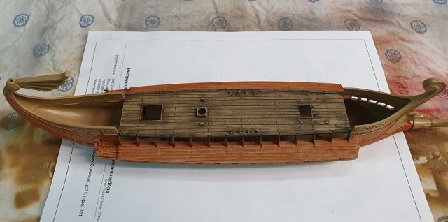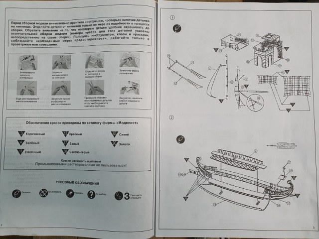 Цветовую гамму Дашулька сама выбирала. Я стараюсь как можно меньше влиять на ход сборки. Моё дело техническое, пока только корпус и подставку помог собрать. В ближайшее время в планах установка вёсел, сборка "крепости" и раскраска щитов.