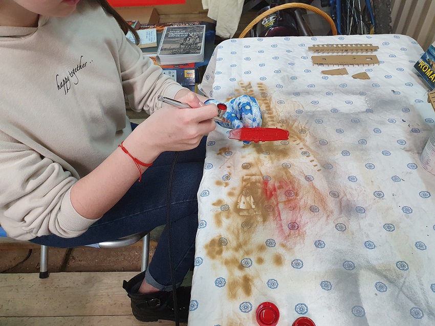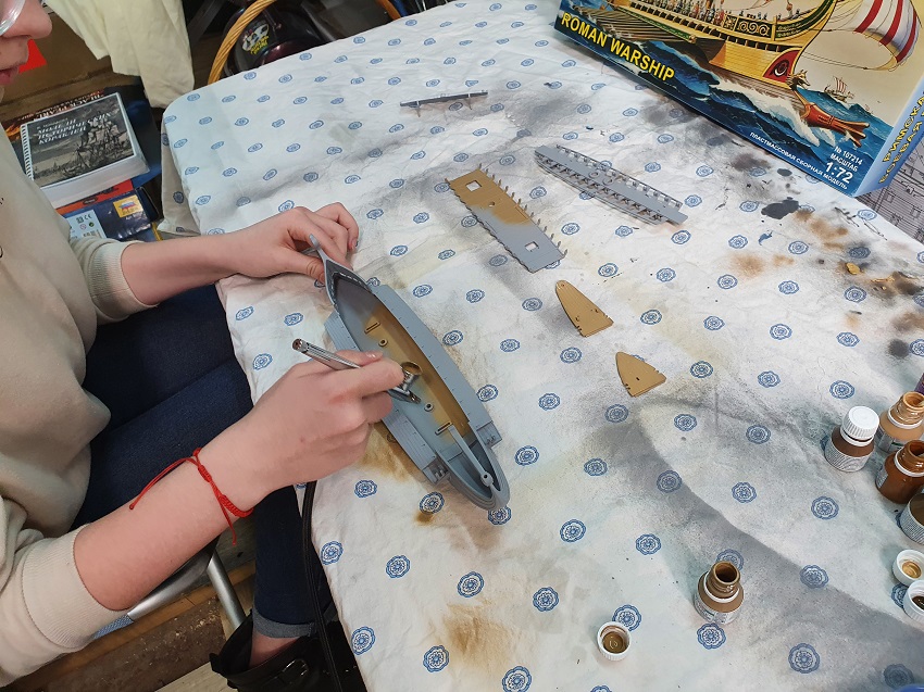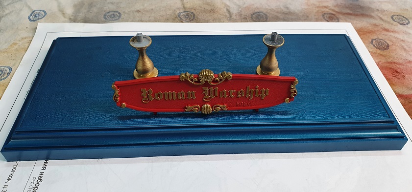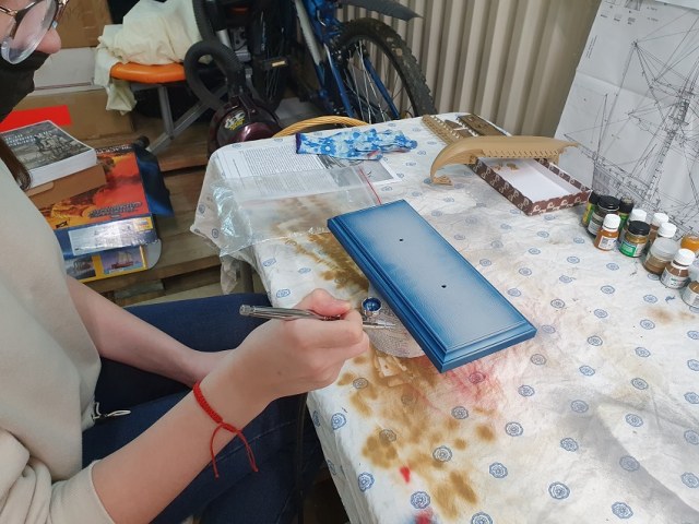 Собрали корпус. Подготовили детали палубы. Всё загрунтовали и покрасили (я, конечно, подгонял собирал корпус) всё остальное дочь делала сама: зачищала остальные детали, грунтовала (балончиком), выбирала цвет краски, красила. Ну и конечно, занялась самымой главной деталью - табличкой... ну это и понятно.