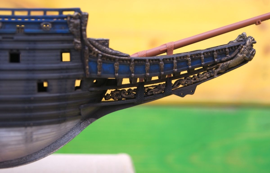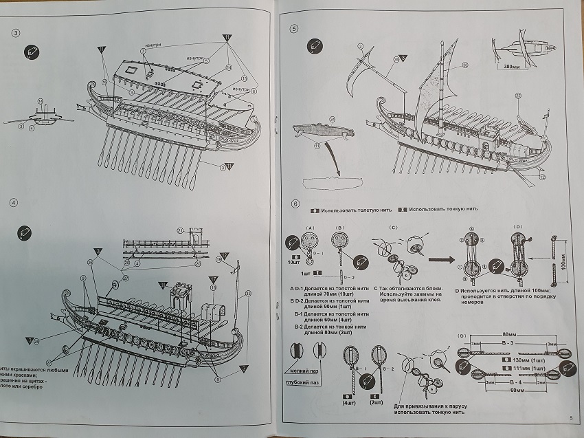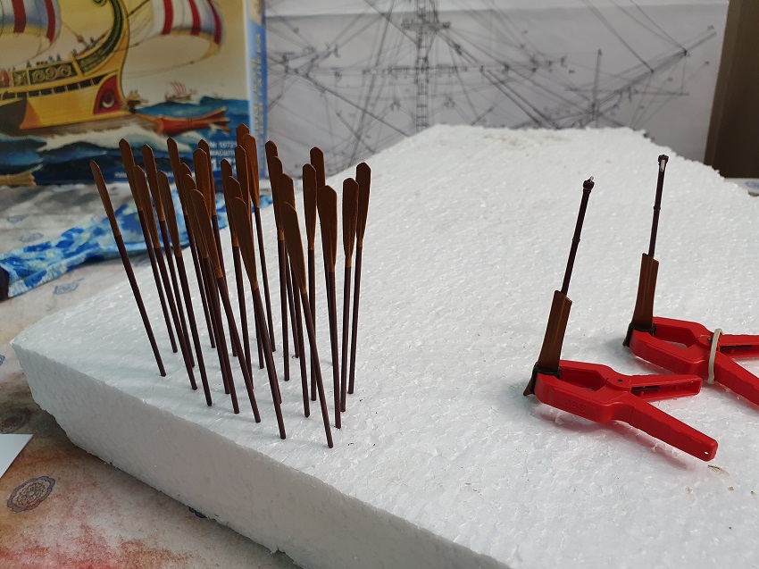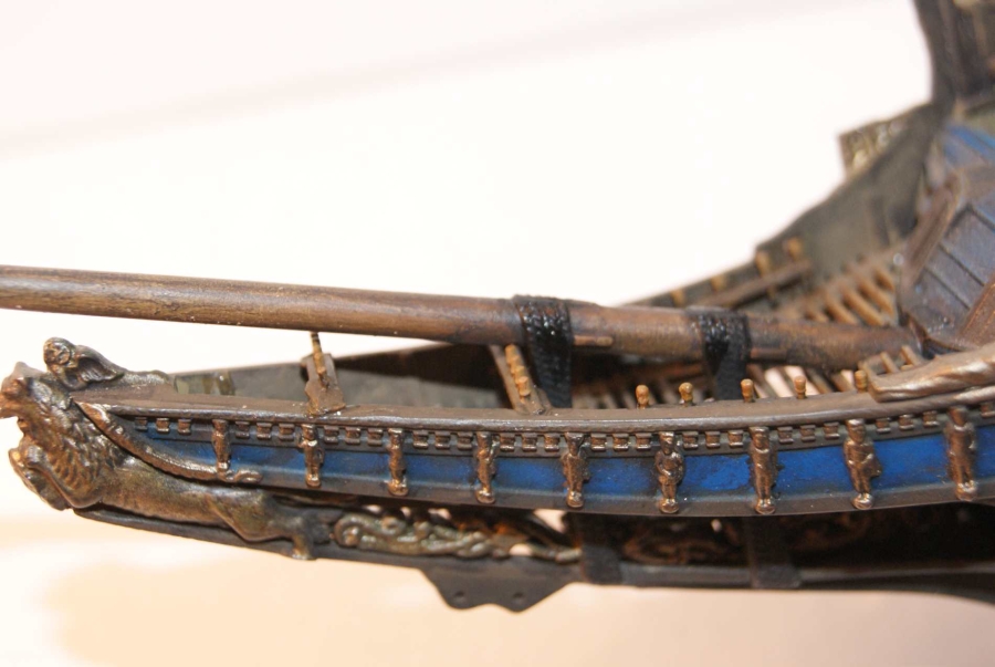Установка вёсел прошла трудновато, пока более-менее выставили их в одной плоскости. Добавили два битенга для проводки такелажа парусов. Паруса решили всё таки оставить из коробки, но немного их "усовершенствовать". Перекрасили таран бронзовым акрилом от Звезды, высохнет ещё смывкой подработаем.