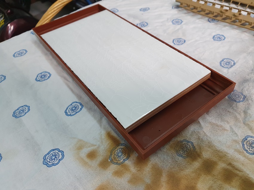 Ну а я, тем временем, ещё утяжелил подставку, а то уж совсем невесомая (вклеил во внутрь кусок керамической плитки, оставшейся от ремонта). Теперь уж точно модель не опрокинется...