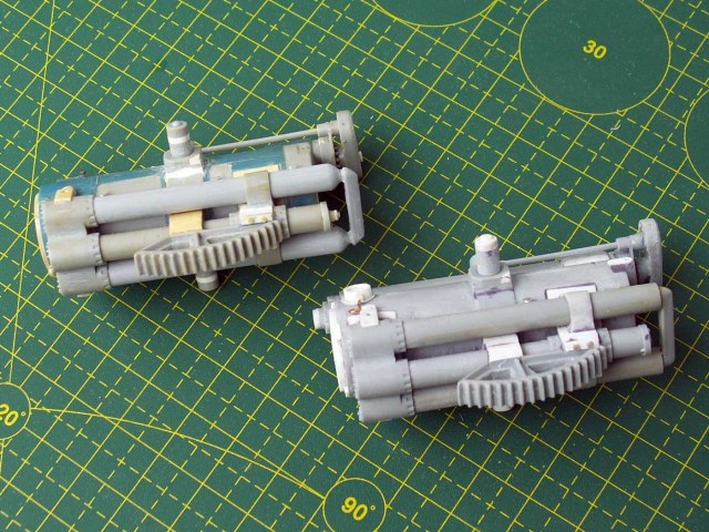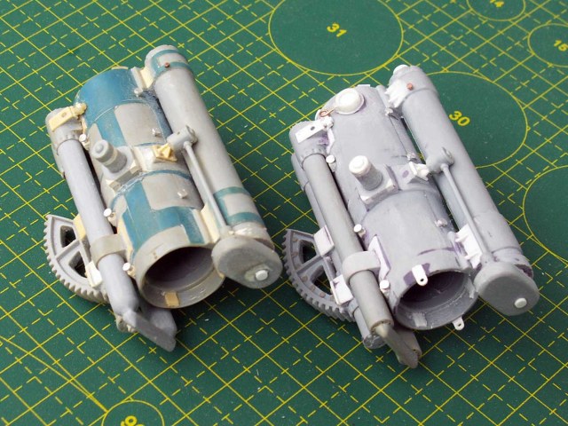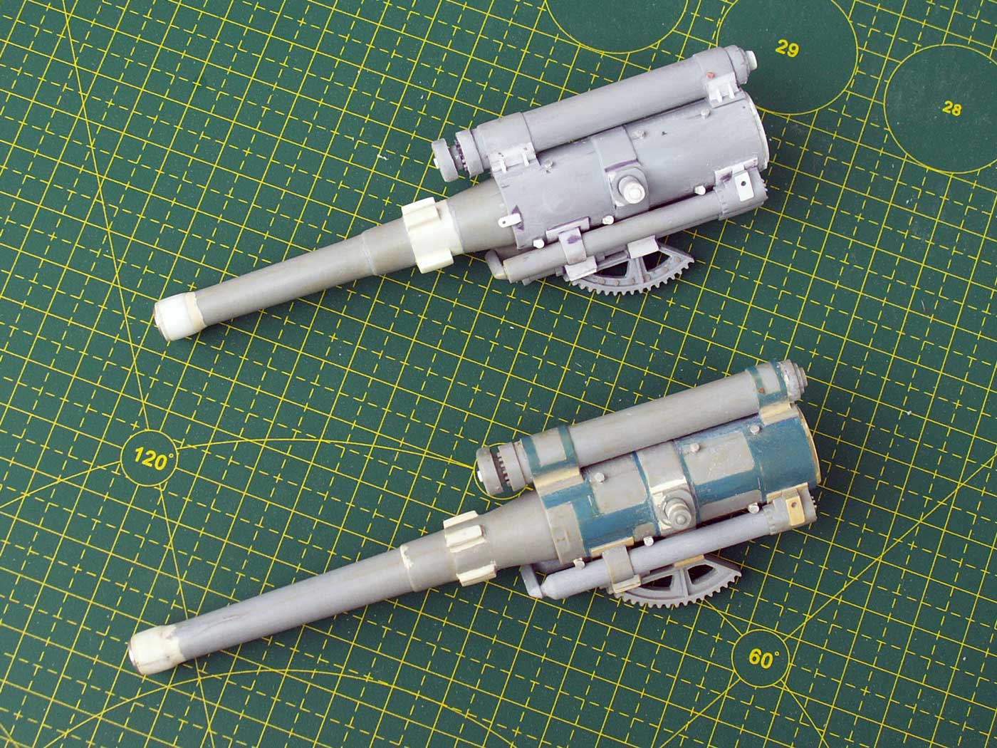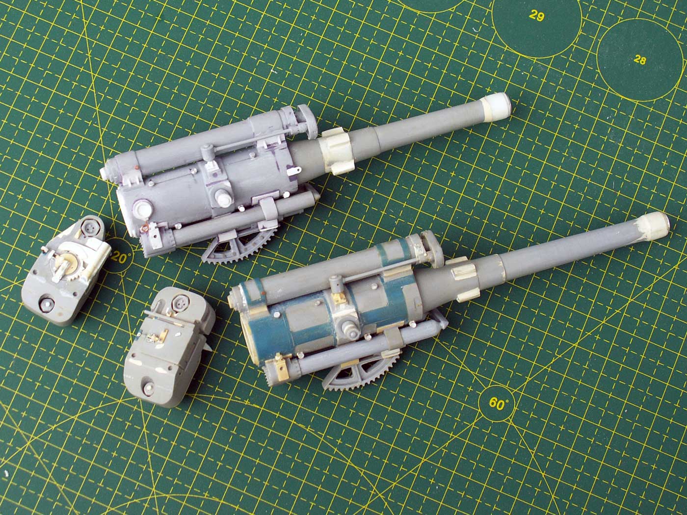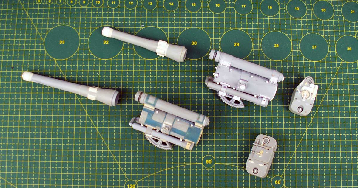 Одинаковые для обоих орудий доработки - масленки (12 штук) для смазки полозьев, масленки на тормозе отката (2 шт. меньшего размера), крепление сектора, крепление тормоза отката и блока накатника с воздушными цилиндрами, удлинены цапфы, имитация полозьев внутри трубы в передней части, подкорректирован защитный кожух механизма автоматической регулировки отката, имитация ствола в казенной части и прочее по мелочи.