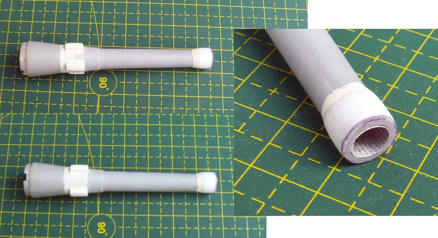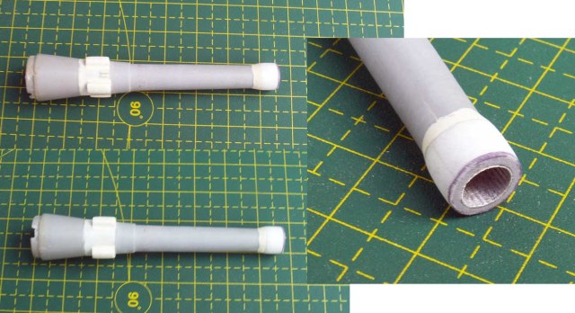 На всех стволах за крестовиной был цилиндрический участок для опорной стойки с поясом от ствольной повозки, а уже после шел конический участок. На модели конический участок идет сразу за крестовиной.