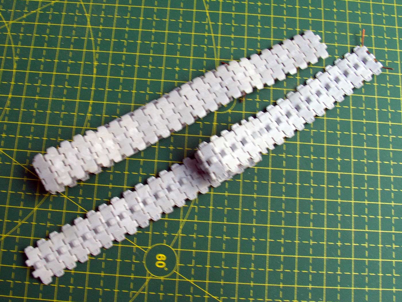 - Собрал гусеничные ленты для ММ (незаюзанные), рабочие. Теперь появилось понимание, что с внешней стороны надо наклеить полоску из тонкого пластика, имитирующую именно ту пластину, которая закрывала полости. На тележке придется двигать ленивец, получилось что по наставлению положено 39 траков, а на модели выходит что 40 мало (лента не замыкается), а 41 много (большой провис).