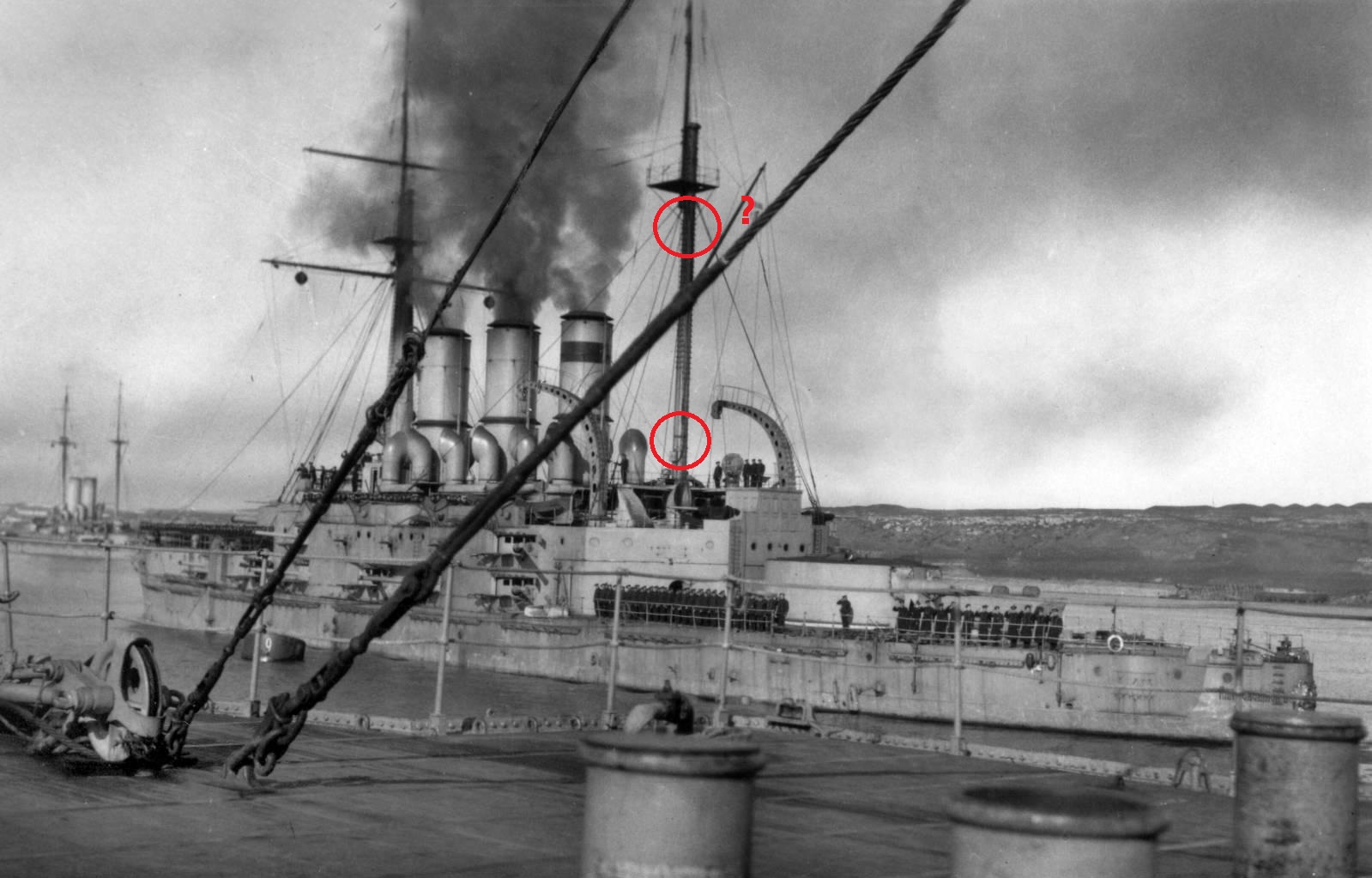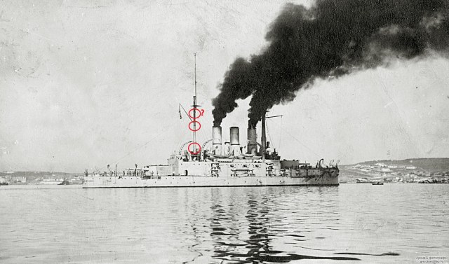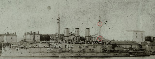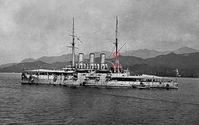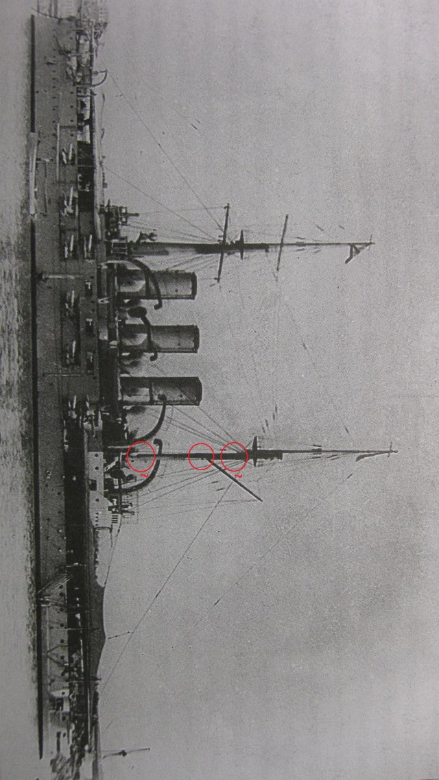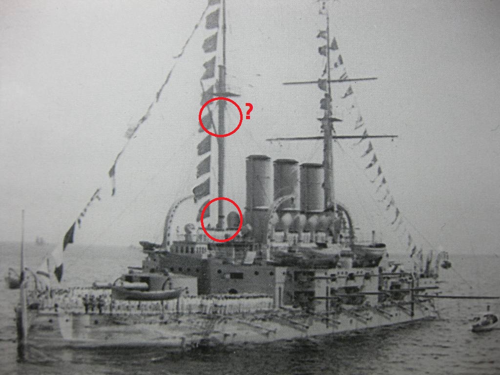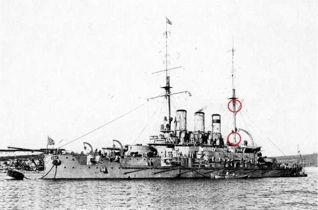 ~ 30 апреля 1912 на грот мачте "Пантелеймона" появляются вот такие, красные марки (для четкого определения дистанции между кораблями в кильватерном строю, во избежание столкновений) . Марок было две и если нижняя постоянно находилась на своем месте, то верхняя иногда "прыгала"- появлялась то выше, то ниже гафеля.. Скорее всего, эти "прыжки" связаны с постоянным закопчением верхушки грот мачты :
