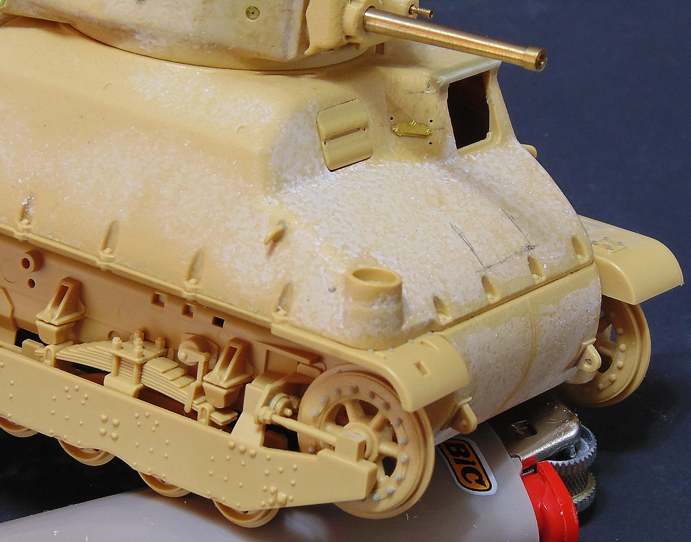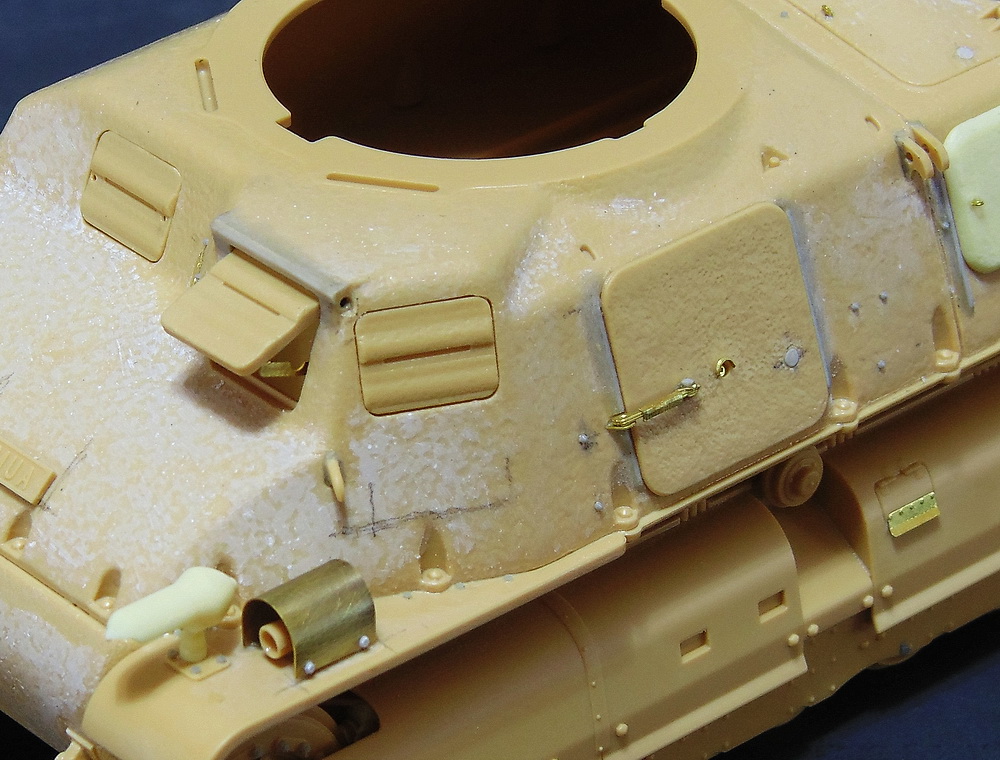 Наростил наплыв над люком мехвода . Пришлось сделать с боков небольшую выямку - ступеньку , просверлить и вставить трубку .