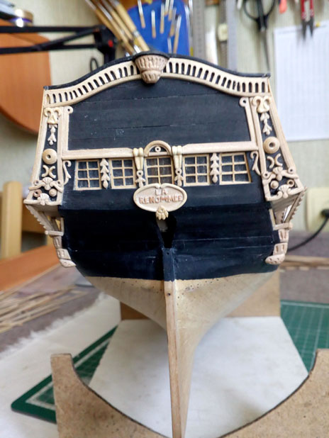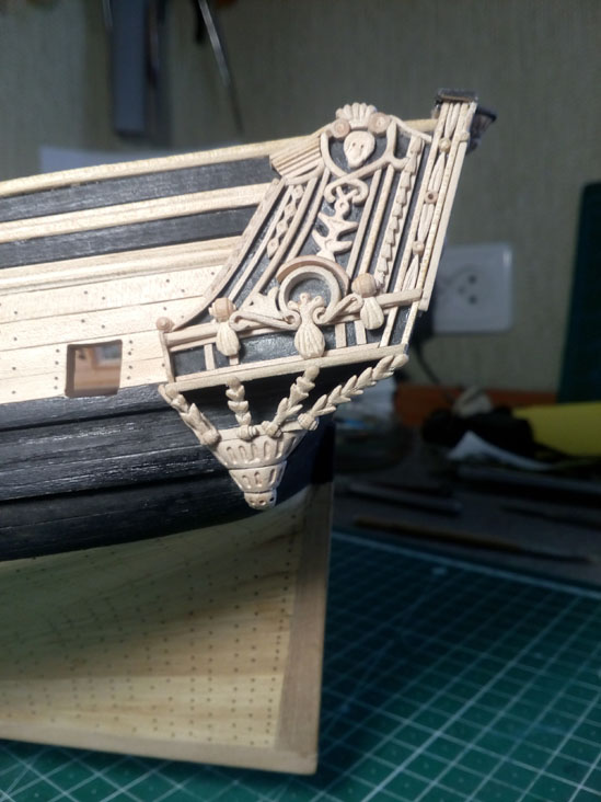 Владимир, хорошо получается! А гакабортное украшение (панно) можно сделать из отдельных элементов - так будет вам удобней, и, кстати, достовернее - ведь именно так и делали мастера-краснодеревщики в те времена декор кораблей.