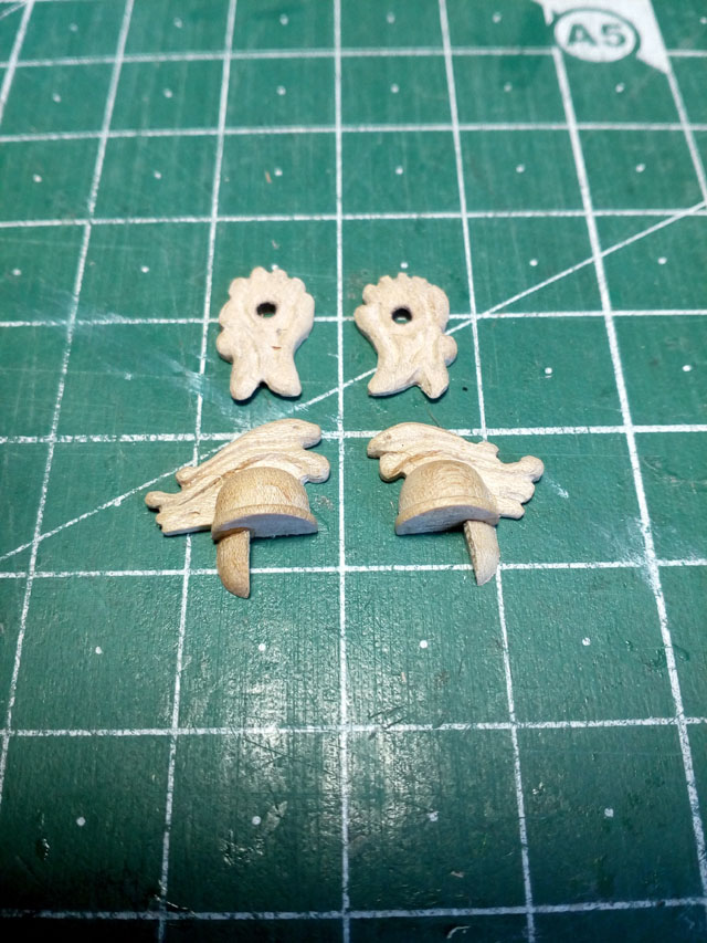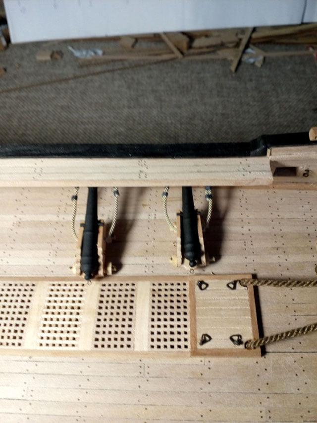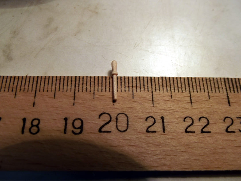 Занялся наполнением орудийной палубы и сразу столкнулся с очередным глюком чертежей. На чертеже рангоута стеньги грот и фок-мачт имеют длину 240 и 210 мм с диаметрами 6 и 5 мм соответственно. А запасные стеньги показаны абсолютно одинаковыми длиной 200 мм. Ещё раз добрым словом вспомнил ремарку Игоря Тараканова про чертежи Будрио.