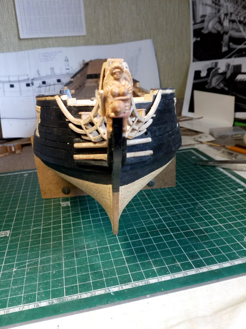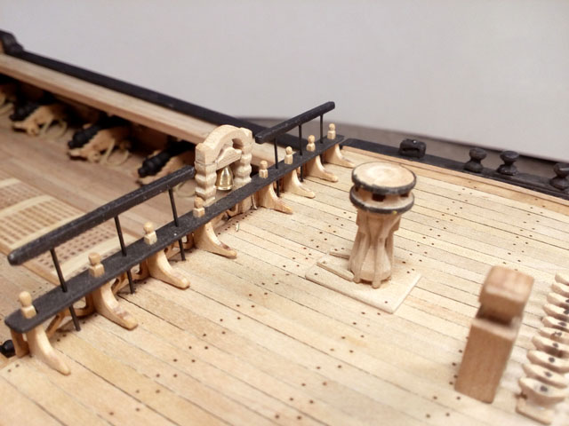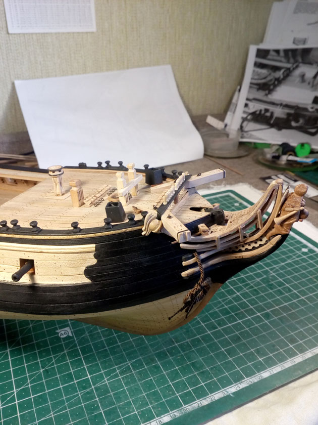 Володя, есть смысл шпиль, кат-балки (крамболы), примачтовые битенги и фал-кнехт выделить тонировкой - они делались из дуба, морились, а потом тщательно окрашивались железным суриком (у англичан немного по-другому). В коллекции Парижского музея, если окраска суриком на модели отсутствует, то перечисленные дельные вещи обязательно темно-коричневые, сильно отличаются от элементов обшивки, палубного настила и проч.