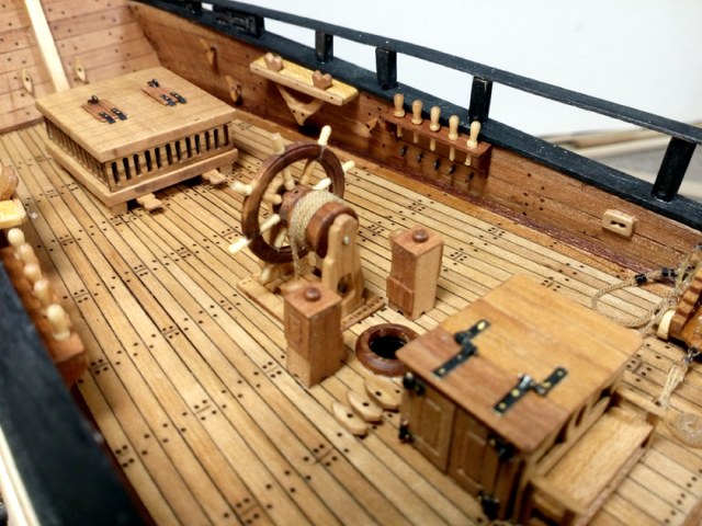 Я заметил, что шкив-гаты на бортах сделаны выступающими за плоскость обшивки борта, что снаружи, что изнутри. Шкив-гаты выполнялись заподлицо с обшивкой. Так делали во избежание излишнего диаметра шкива - он не должен быть малым, иначе тросы будут перетираться, и, наоборот, слишком большой шкив был так же нежелателен - он стоил дорого, это же бронза или цельный дуб - и то, и то дорогое удовольствие, плюс излишняя длина шкив-ата - это сознательное ухудшение шпангоутов.