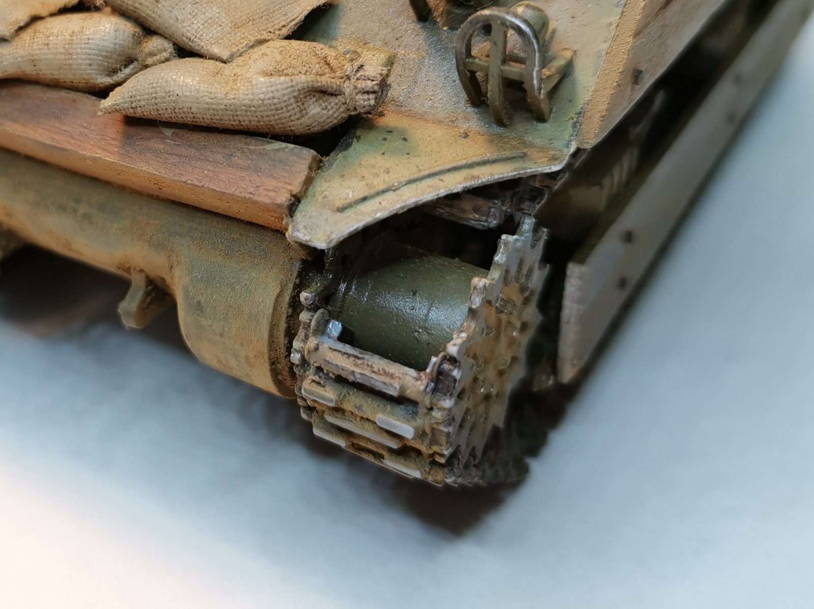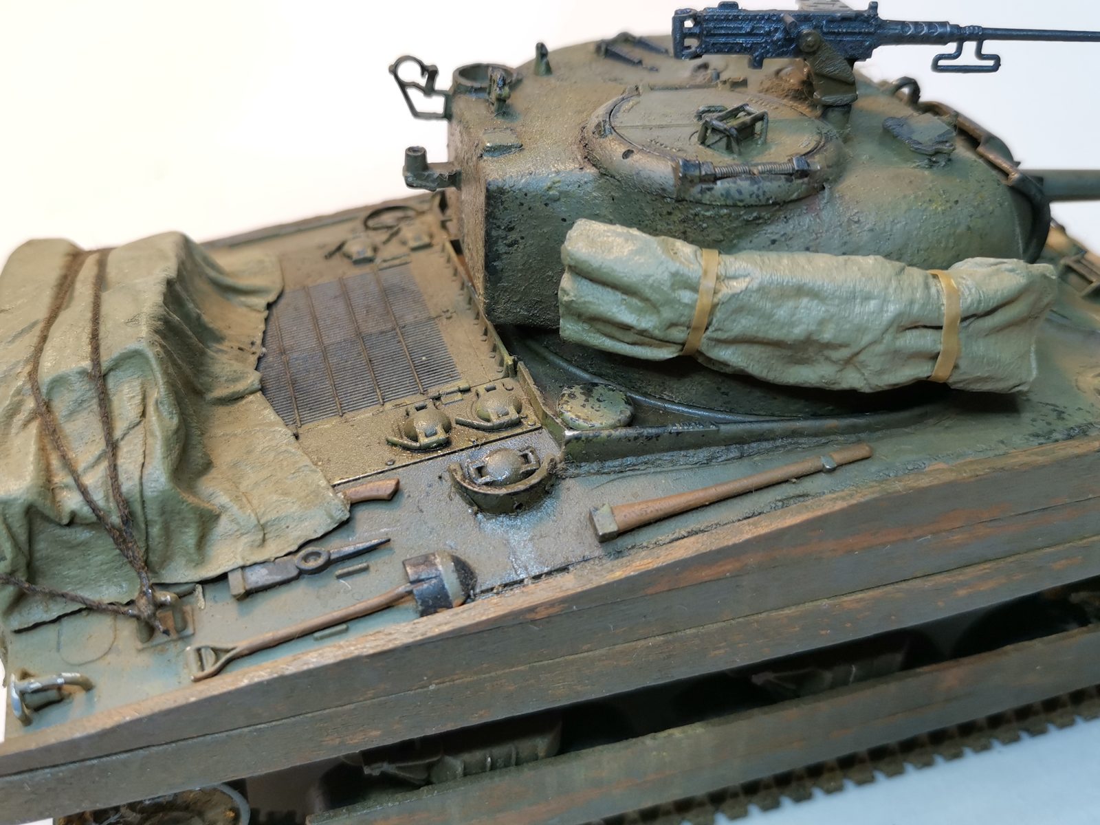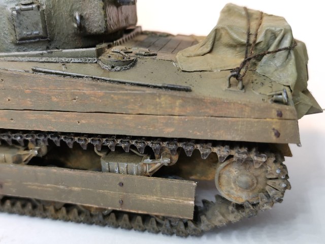 У меня сейчас период "становления", я до сих пор сделал только БТ-5 (он ужасен), так что учусь. Sherman от Звезды - это мой второй танк. И я иду к совершенству постепенно, на данный момент для меня важно красиво раскрасить и запогодить модель, а не достоверность конструкции и копийность. Поэтому ОГРОМНАЯ просьба не указывать на неправильную толщину прутьев вокруг фар и не тот угол наклона пулемета. Просто посочувствуйте молча