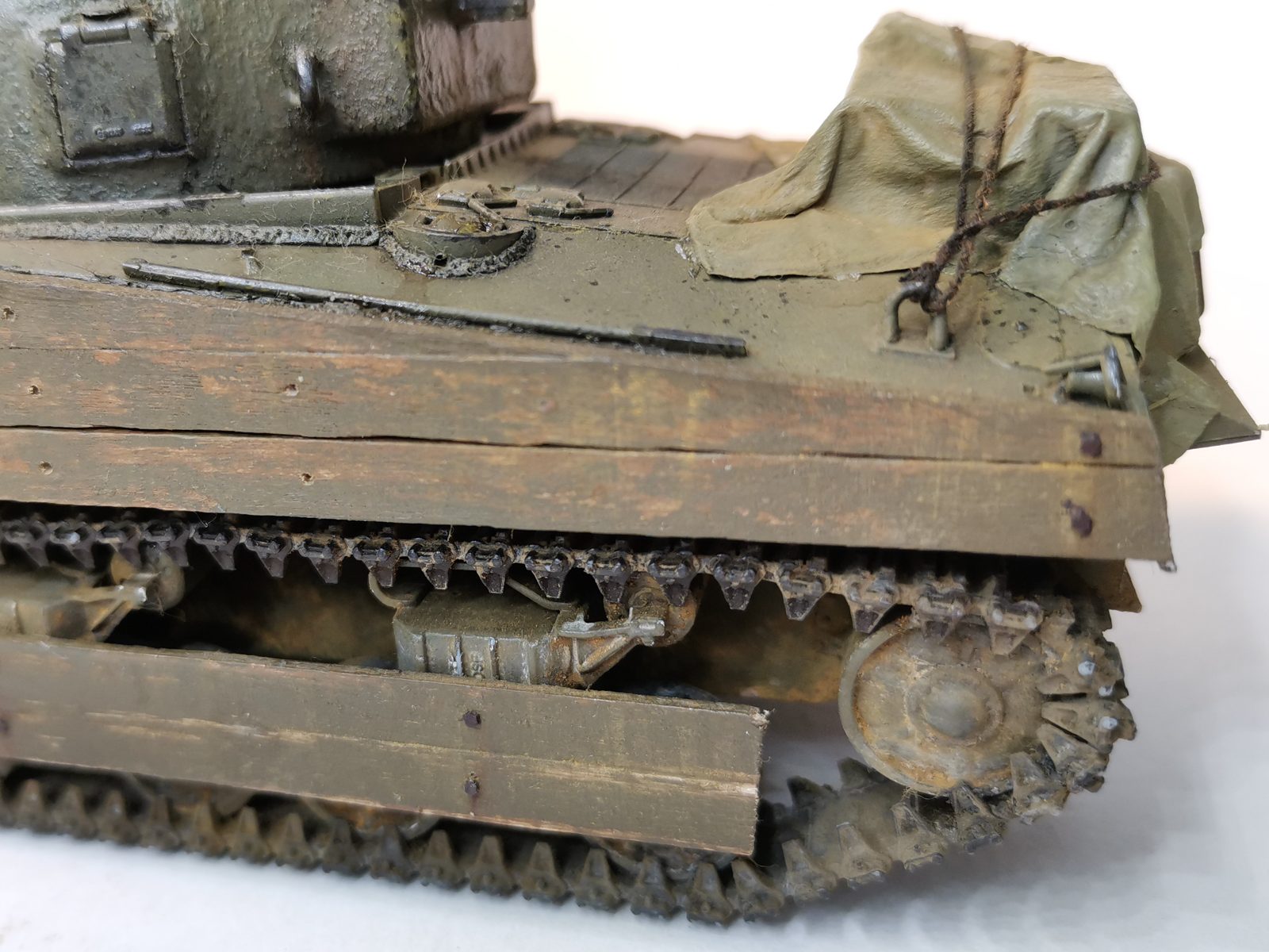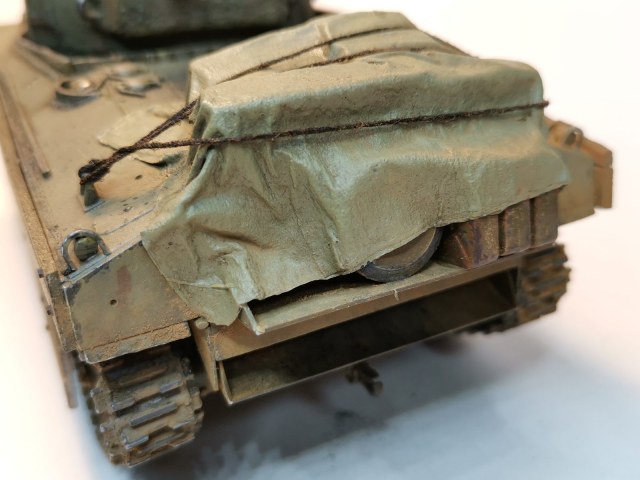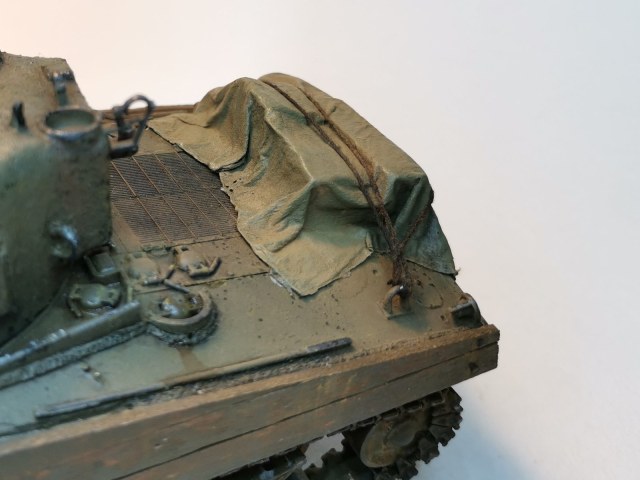 Брезент сделан из бумажного носового платка, пропитанного ПВА, разведенного с водой до консистенции довольно жидкой сметаны. Покрашен Tarpaulin Khaki от Pacific88, серия Color Force. Мне понравился цвет. Поверх пролил жидко-жидко разведенным Olive Drab Base, оставил его только в складках, а потом прошелся сухой кистью c Olive Drab Highlights. Ну и запылил немного пигментом. Ну как «немного»