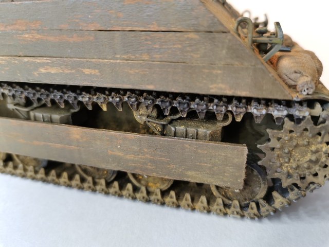 Да, решил попробовать сделать дощатую «броню», увидел фоточки, понравилось. Доски стырил в Старбаксе, в стакане с мешалками сахара. Покрасил в слегка разведенный «Древесный» от Звезды, брызнул лаком для волос, потом покрасил Olive Drab base, тоже слегка разведенным, чтобы текстуру дерева не залить. Когда высохло, прошелся мокрой-премокрой жесткой кистью, местами даже «углами» кисточки. Вроде ничего вышло.