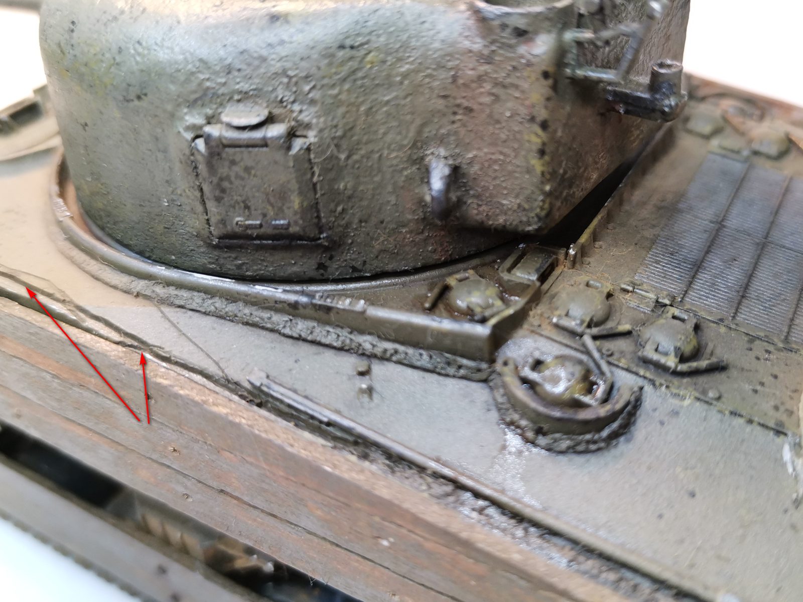 Начитался приемов с жидким клеем и шпаклевкой. Сначала протыкал ее кистью с тамиевским текучим клеем, а потом развел шпаклевку от Zip им же и тоже начал тыкать. Не учел, что эта шпаклевка весьма быстро сохнет, да и сама по себе очень грубая. В общем, смотрите по стрелочкам на фото – волосы, какие-то кривые текстуры повылезали, ужасно, короче. Буду-таки искать Mr.Surfacer 500, если кто подскажет где купить НЕ аэрозольный, буду признателен. Или попробую второй заход, но только со шпаклевкой Basic от Тамии.Теперь доски. Считаю, вполне удачный заход вышел.