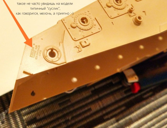 Ванна корпуса - сразу же легкий повод быть удовлетворенным покупкой, если и дальше так пойдет – строительство модели обещает быть увлекательным и приятным: в районе направляющих колес выполнены имитации заводских надписей. Я видел подобное на бандажах катков Т-90МС от Тайгер Моделс и от Звезды, хотя после грунтовки и покраски практически ничего не видно; а здесь, на Абрамсе, участки брони с этими надписями вообще наглухо спрятаны под бортовыми экранами, типичные «суслики»… Но - "мелочь, а приятно"!