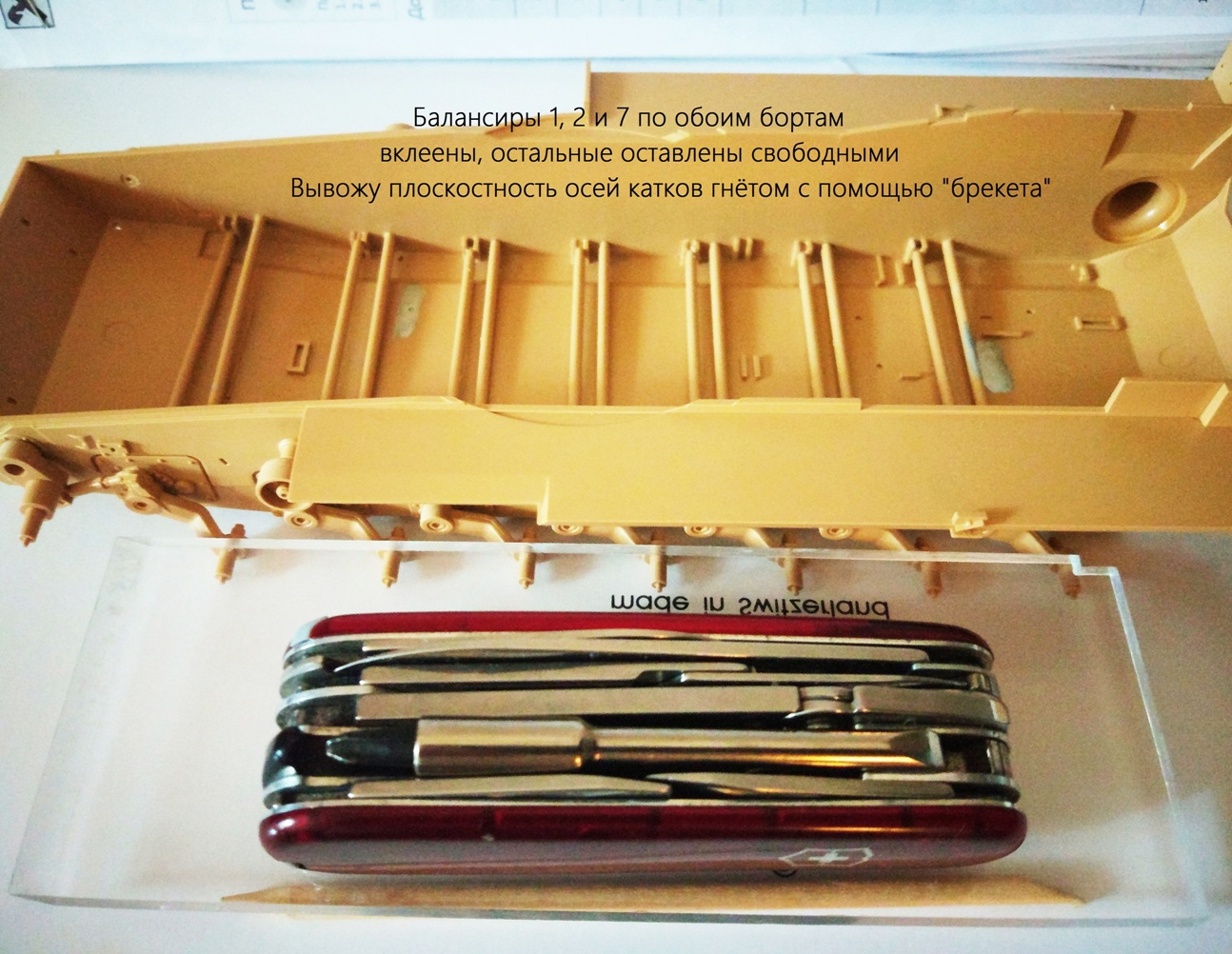Там я вставлял катки и направляющие колеса на места на уже практически готовый и открашенный в базу танк, подсовывая их под приклеенные наглухо бортовые экраны...