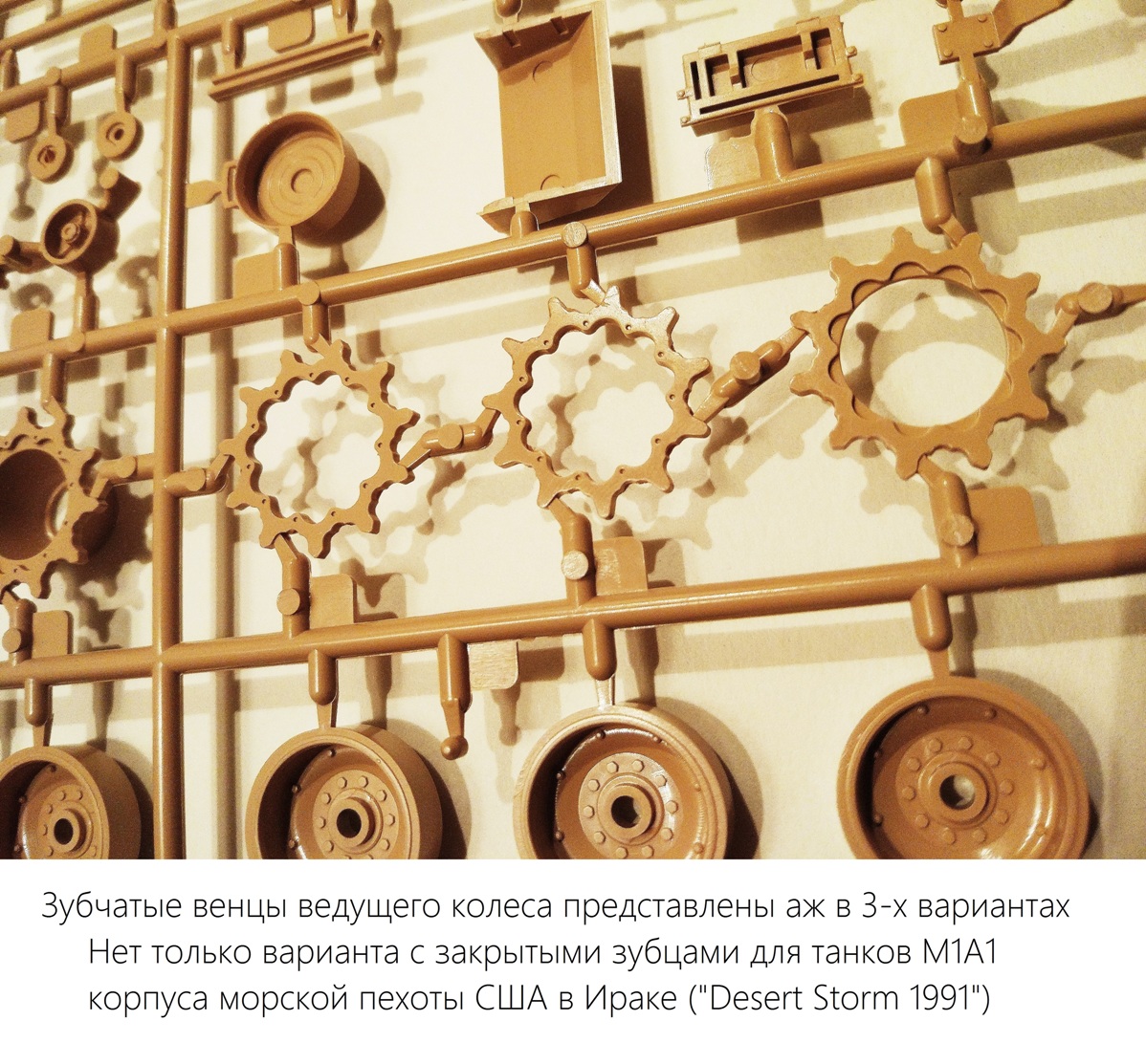 Идем дальше: зубчатые венцы ведущих колес отлиты в трех вариантах, вероятно, с прицелом на различные модификации машин; до полноты картины здесь не хватает только варианта с защитным кольцом, который можно увидеть на фотографиях танков М1А1/А2 корпуса морской пехоты США в Ираке в 1991.
