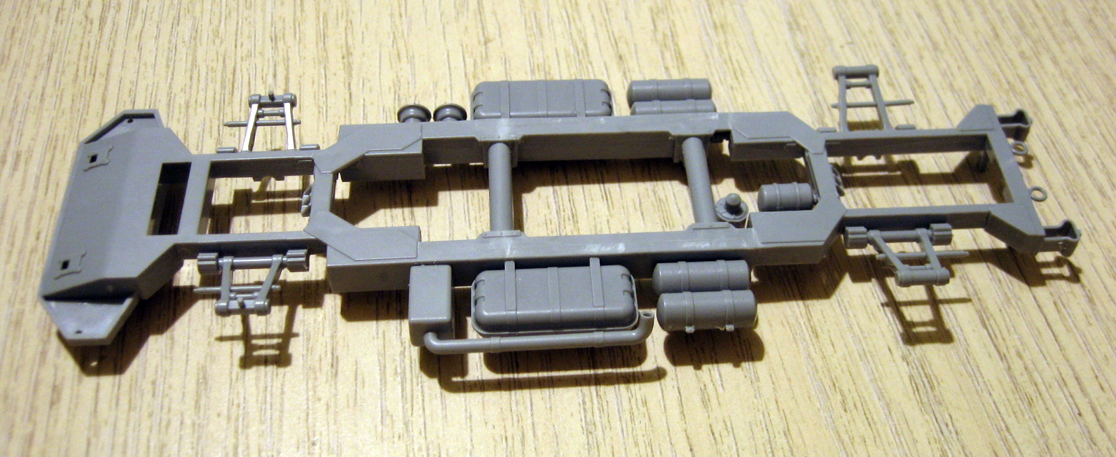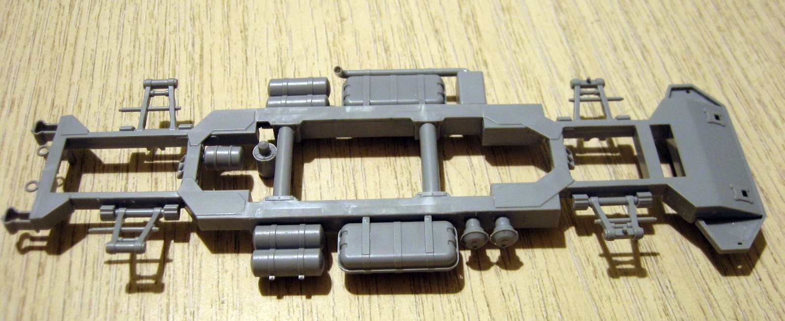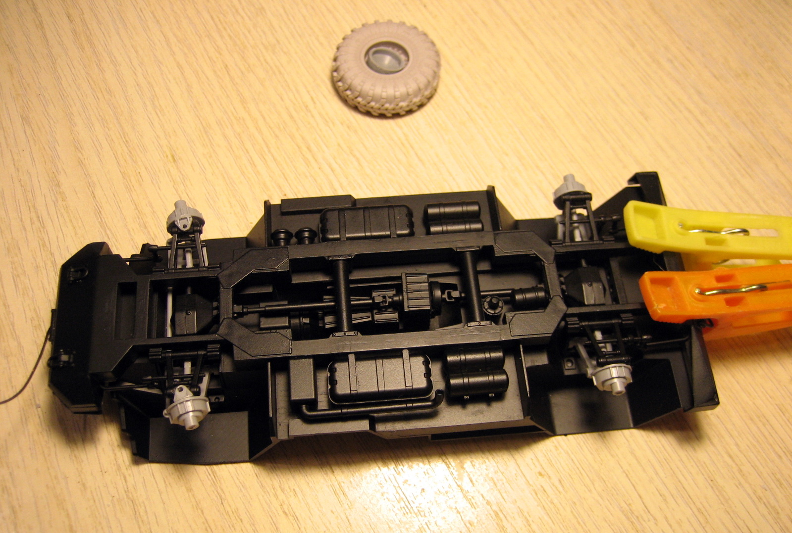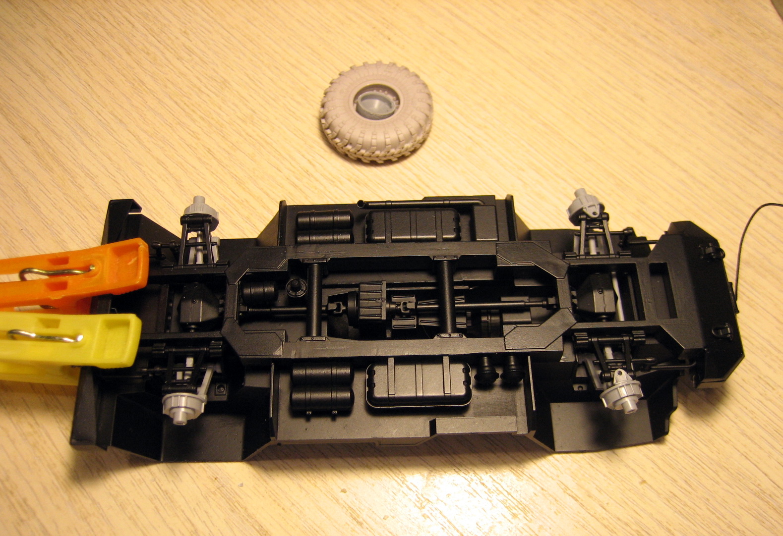 Итак, дособрал раму и днище кузова, обрызгал грунтовкой... Вроде ничего криминального, можно склеивать в кучку. Склеил. Подсборки не совсем ровно прилегали друг к дружке. Попросил помощи у прищепок.