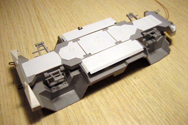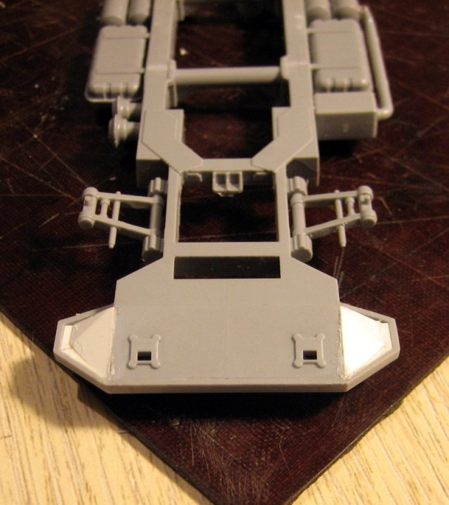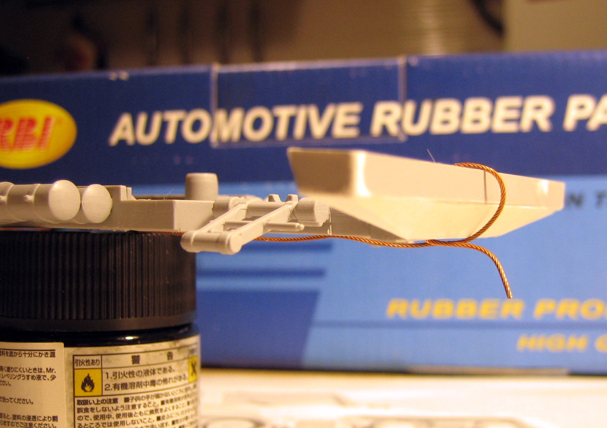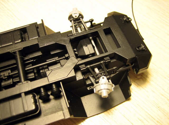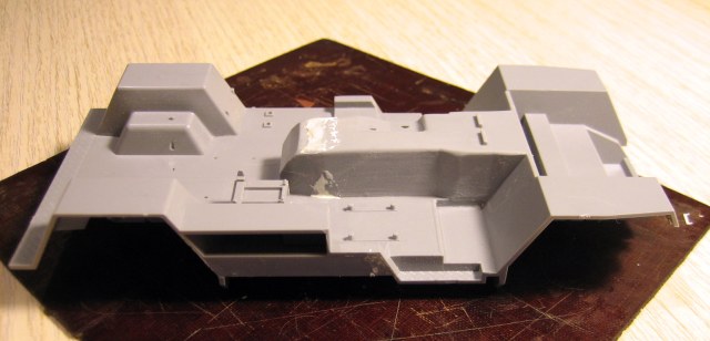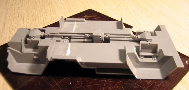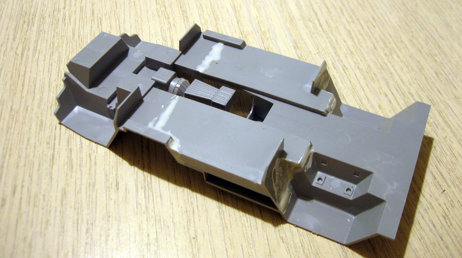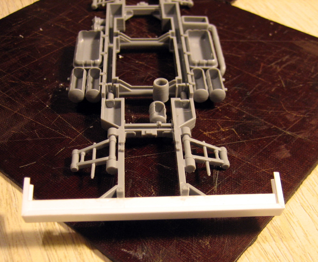 Итак, дособрал раму и днище кузова, обрызгал грунтовкой... Вроде ничего криминального, можно склеивать в кучку. Склеил. Подсборки не совсем ровно прилегали друг к дружке. Попросил помощи у прищепок.