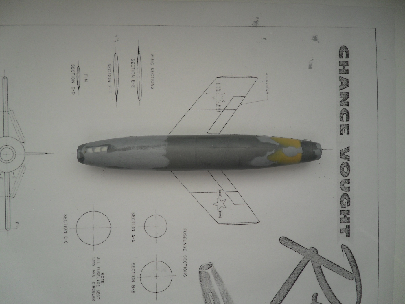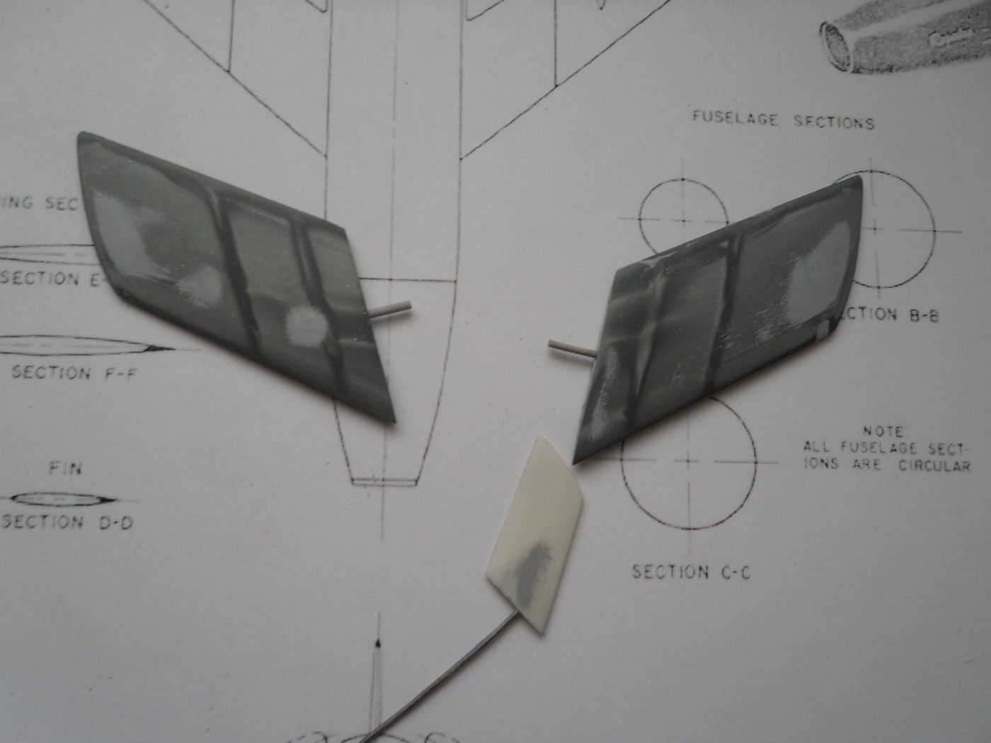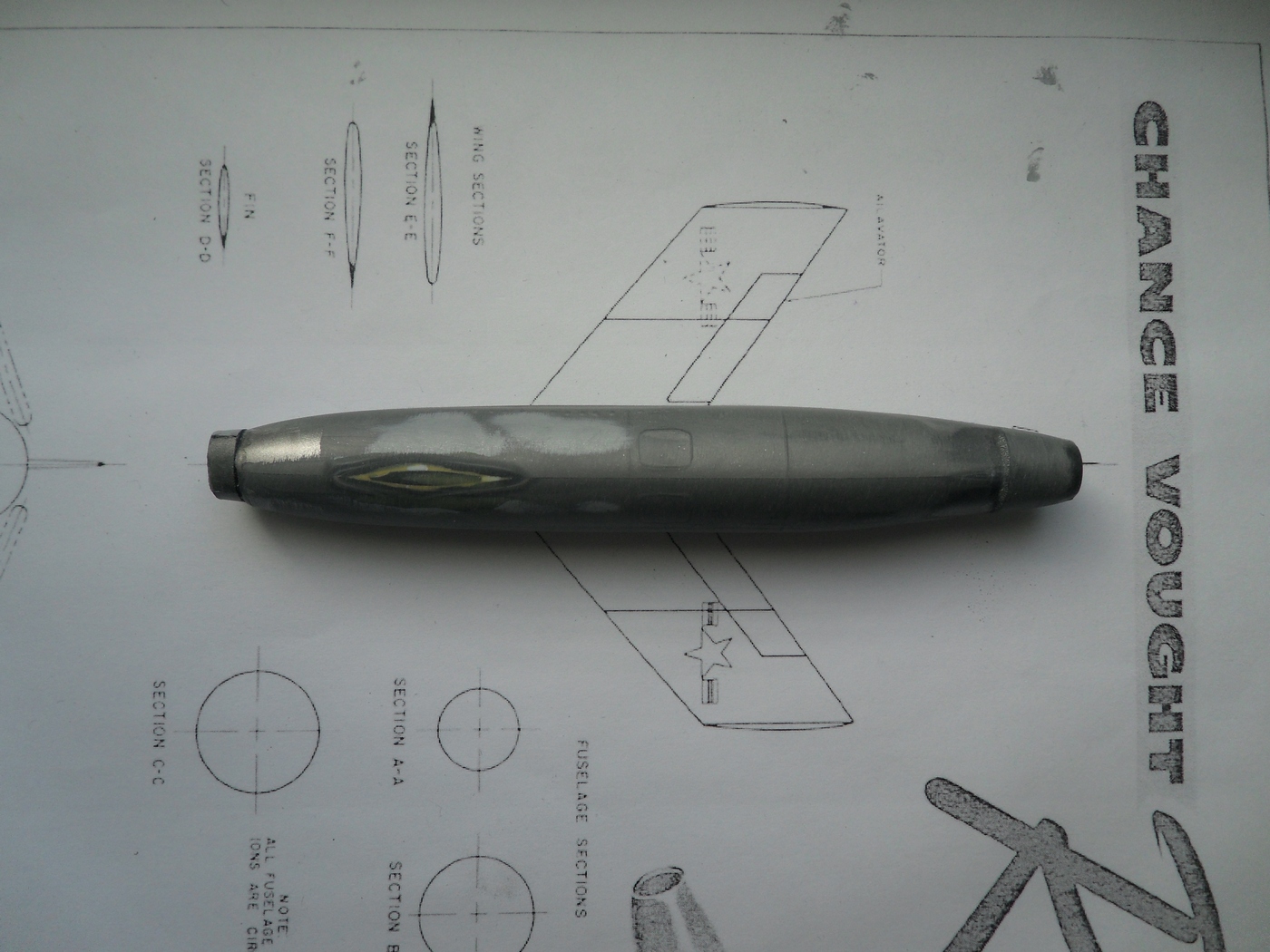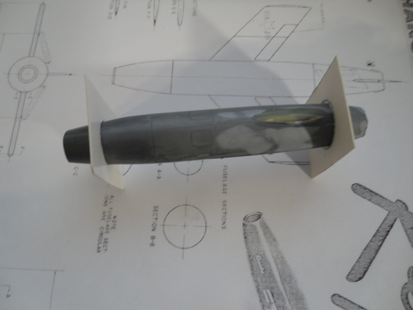 Зашкурил корпус, просверлил отверстия для штифтов, крепление крыльев и киля, отмасштабировал и распечатал чертежи из МК, они более подробны...