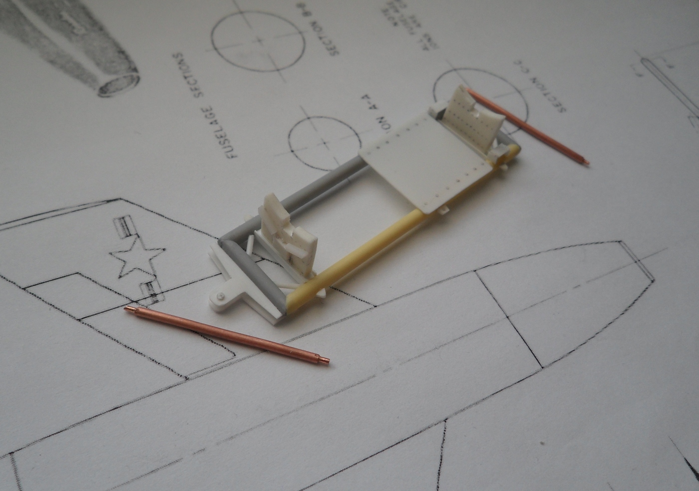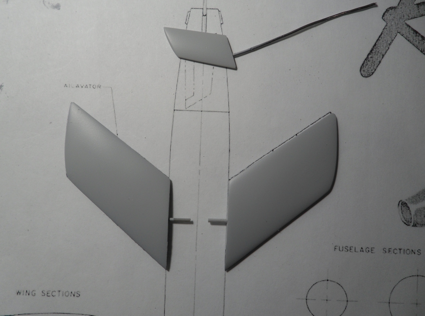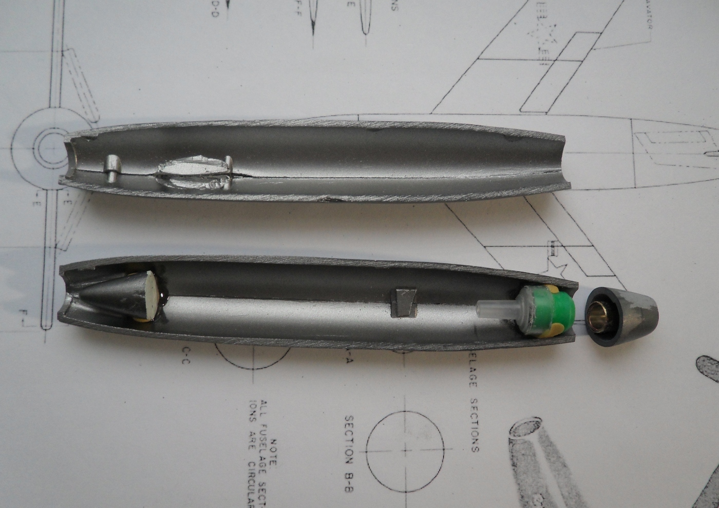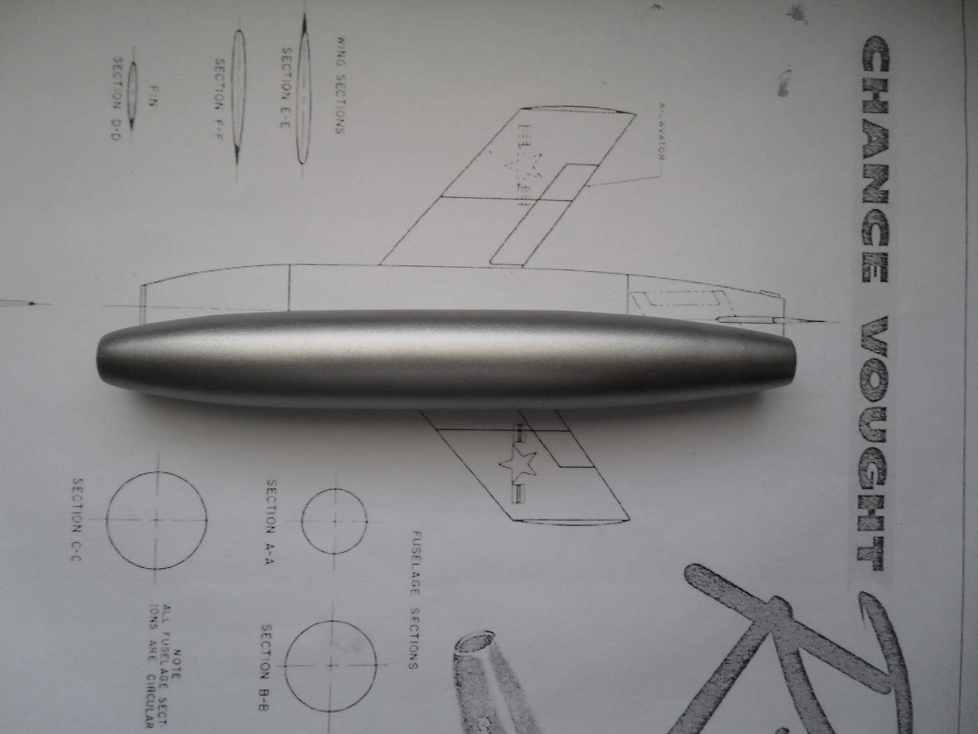 Зашкурил корпус, просверлил отверстия для штифтов, крепление крыльев и киля, отмасштабировал и распечатал чертежи из МК, они более подробны...