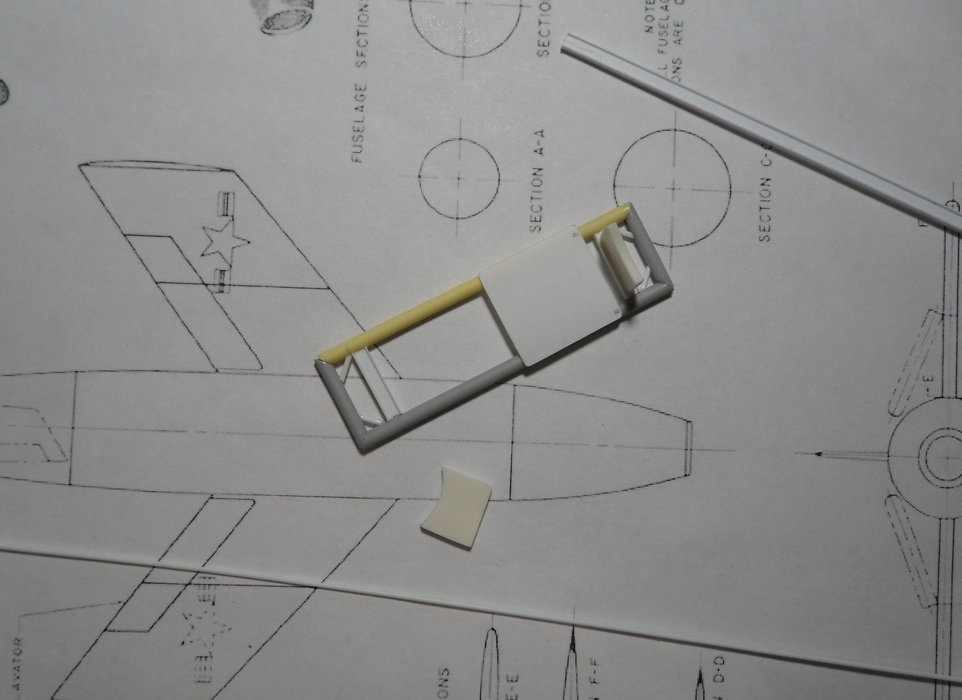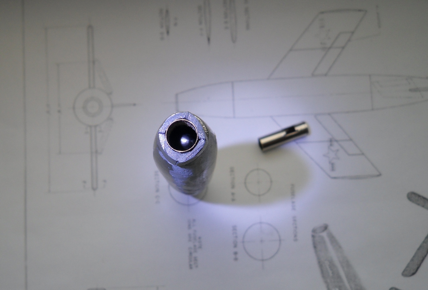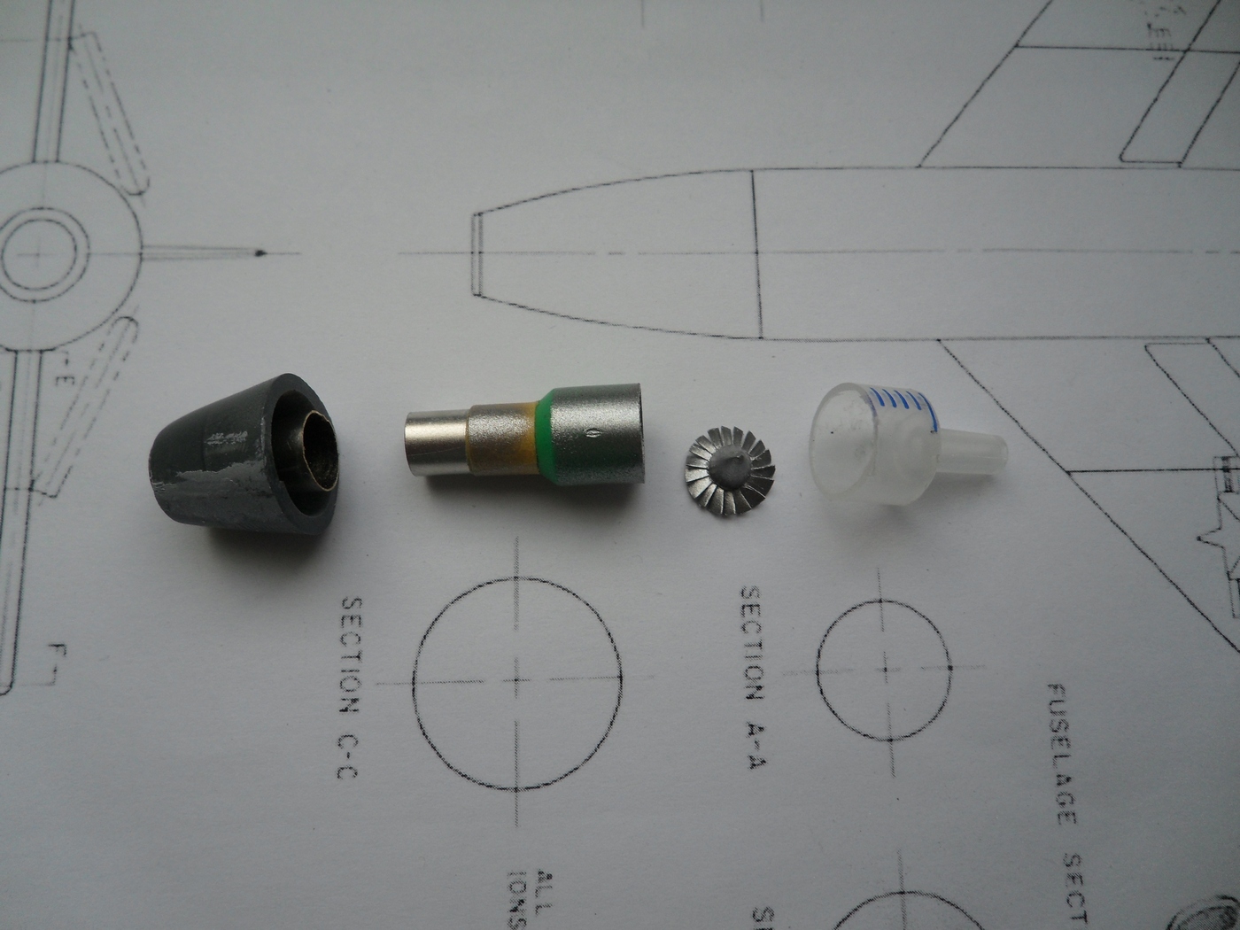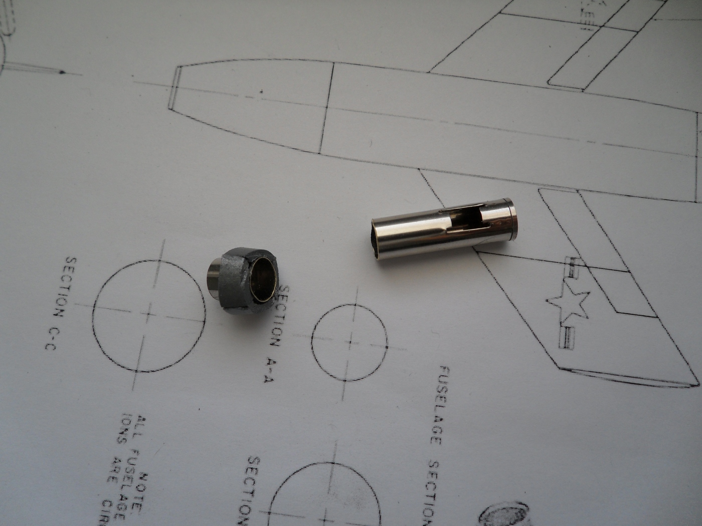 Зашкурил корпус, просверлил отверстия для штифтов, крепление крыльев и киля, отмасштабировал и распечатал чертежи из МК, они более подробны...