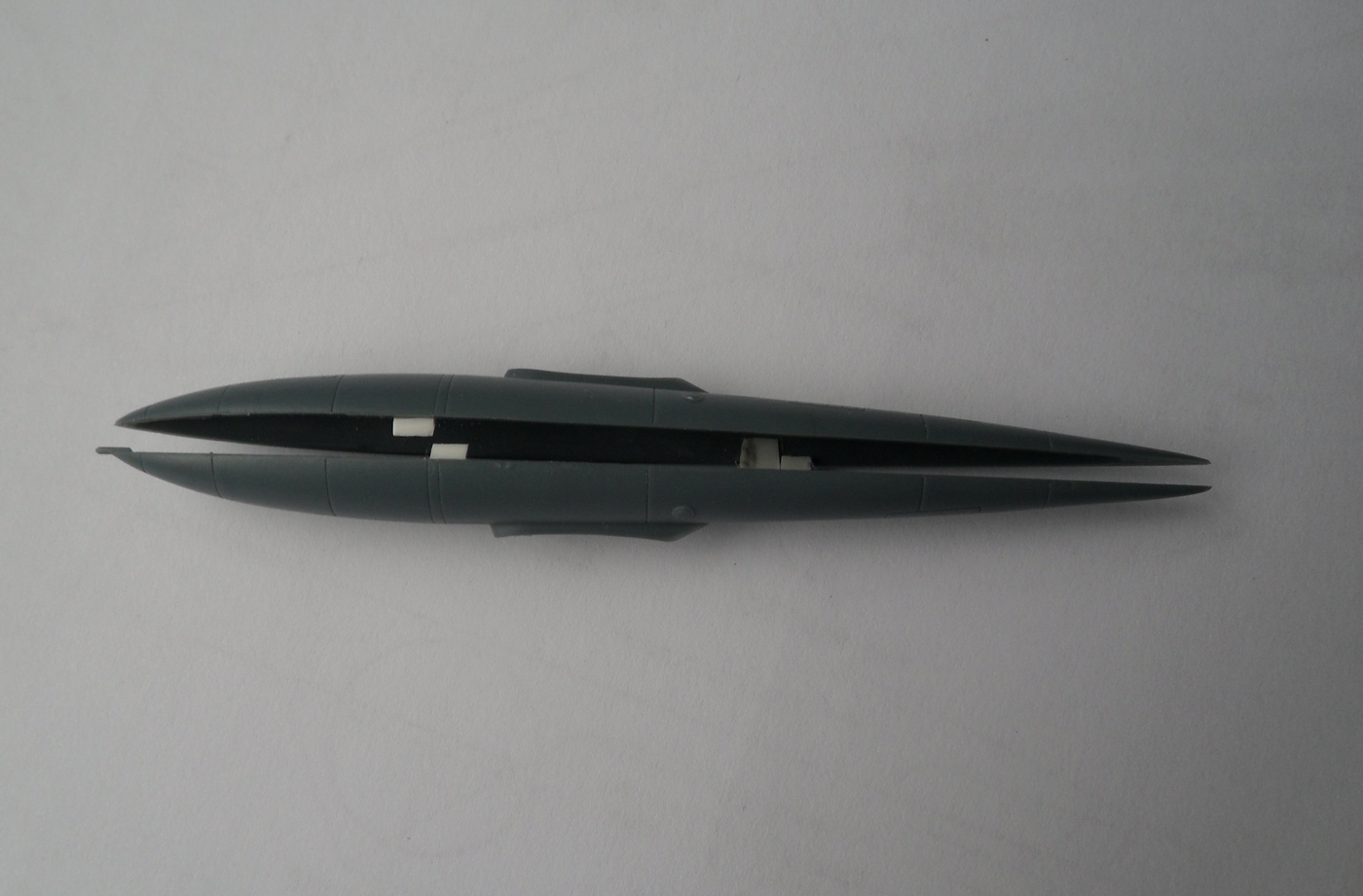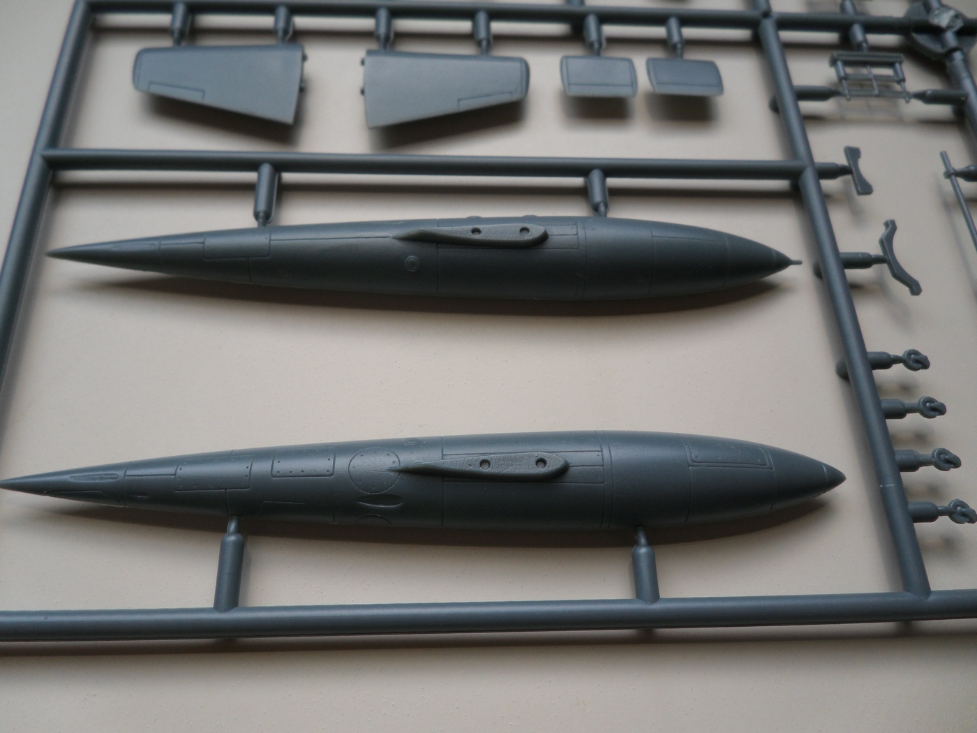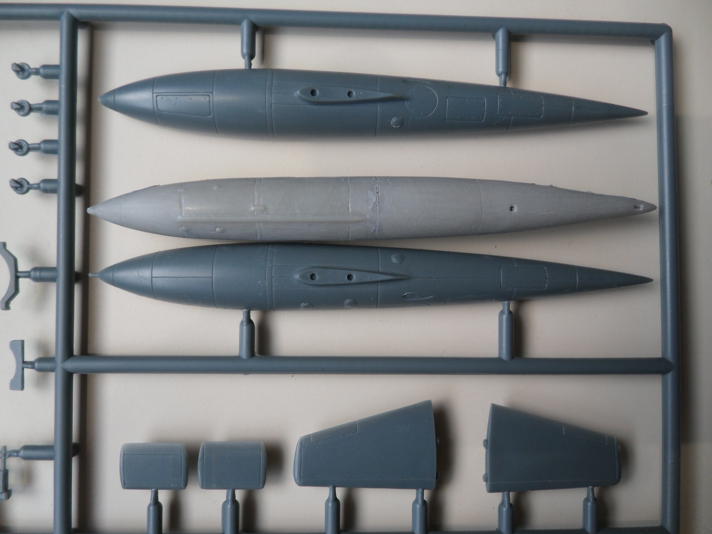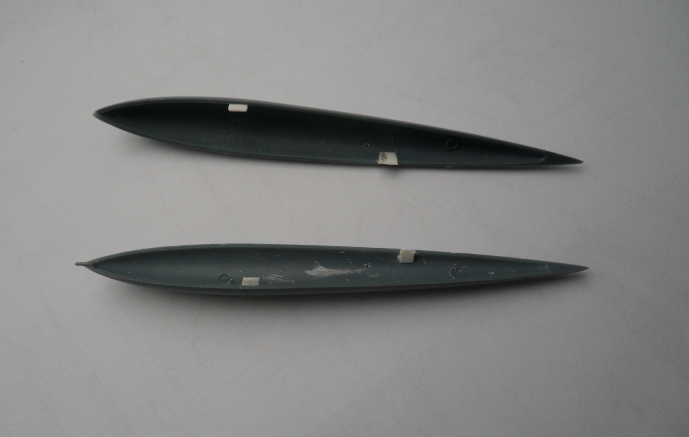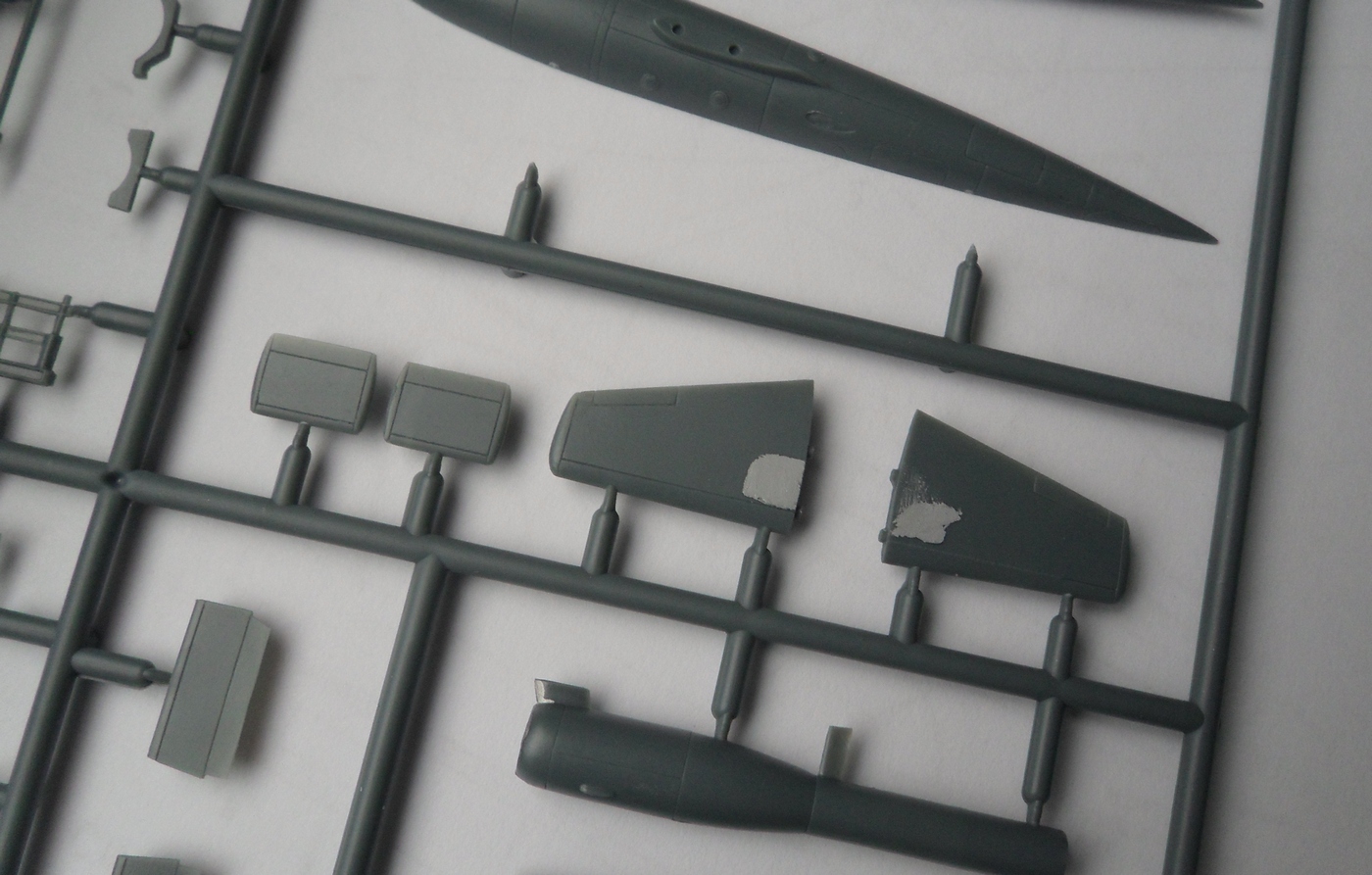 Детали с литников приходиться отпиливать, а не откусывать... Сейчас склеил корпус, сделал пропил, на поведенной половинке и распилил крылья...