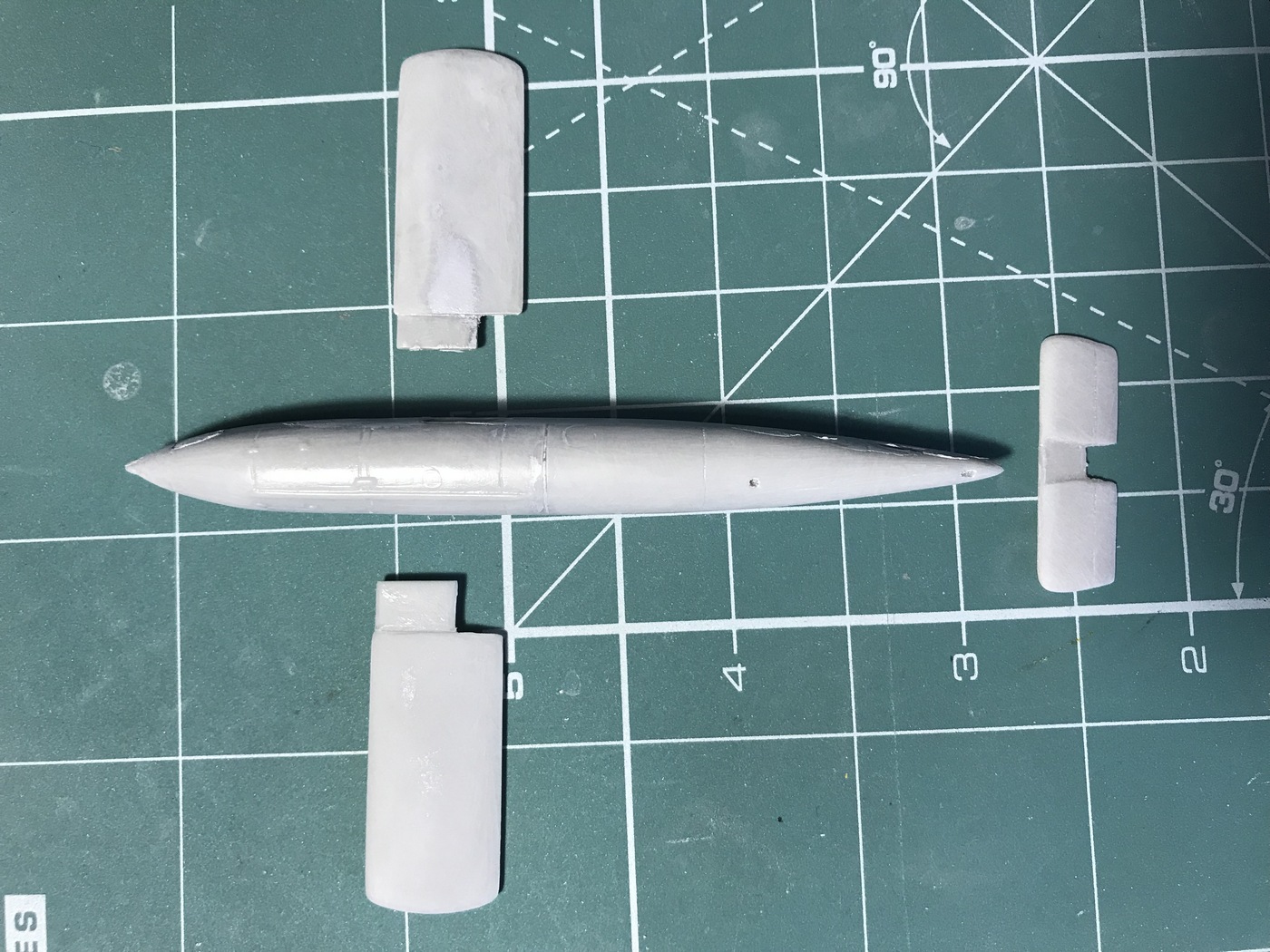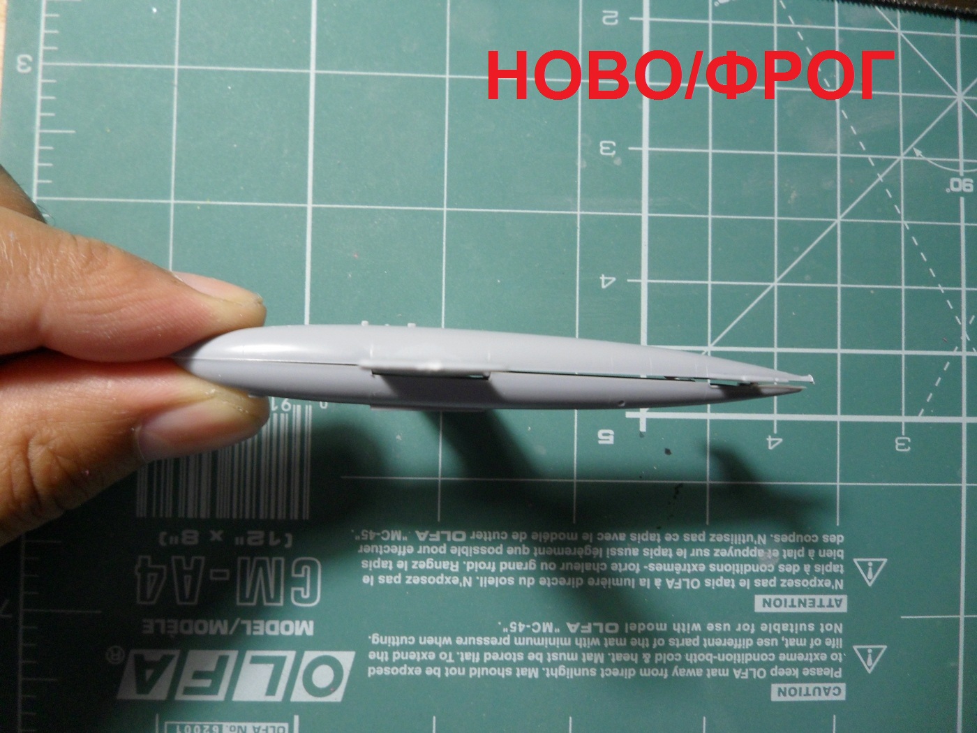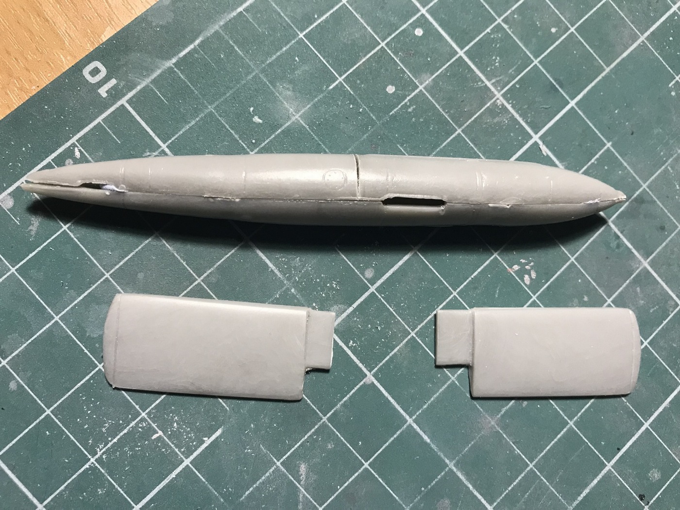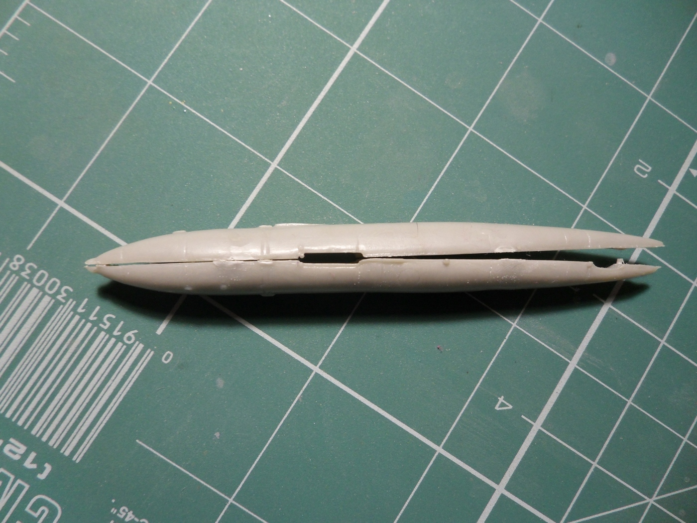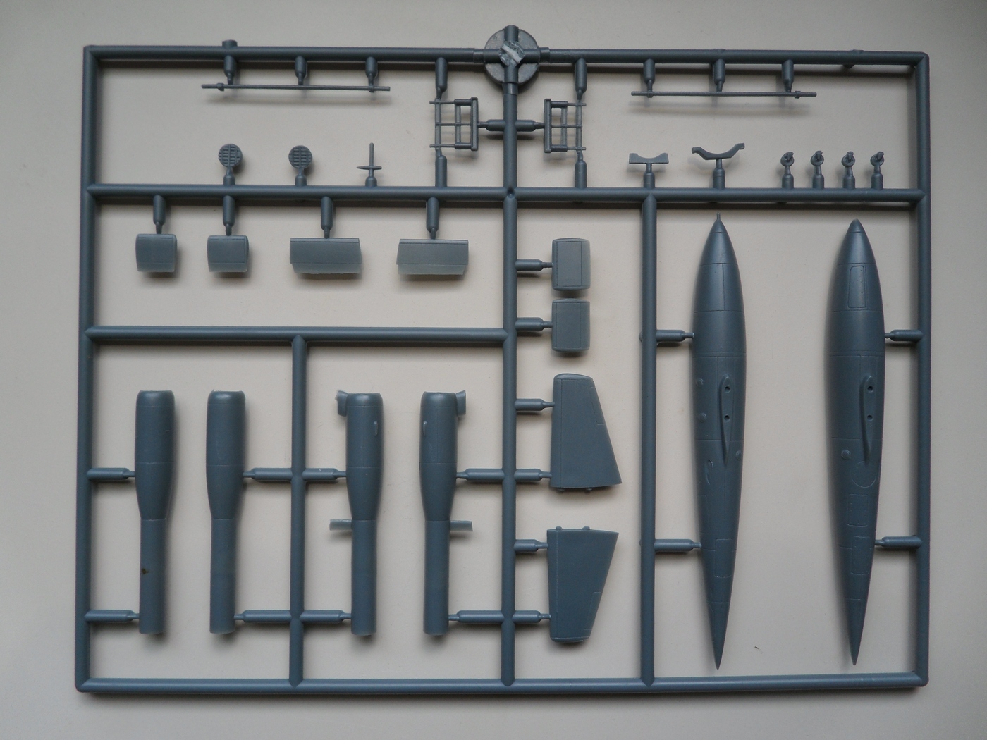 Детали с литников приходиться отпиливать, а не откусывать... Сейчас склеил корпус, сделал пропил, на поведенной половинке и распилил крылья...