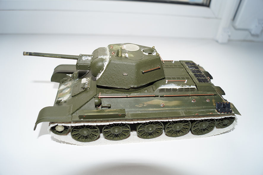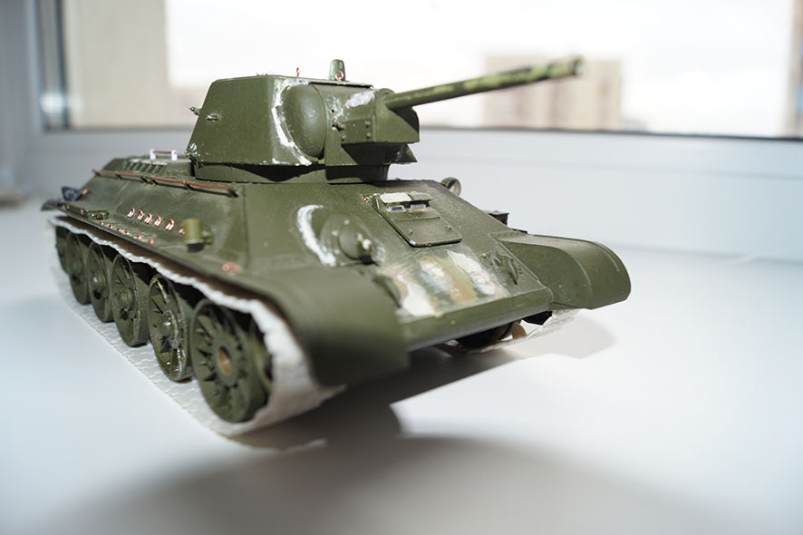 В этом то и смысл довести старую гайку близко к виду новой, чтобы очертаниями напоминала ЧКЗ весны 43. Я понимаю, что чтобы сейчас собрать модель надо 10тр, купить смоляную башню, купить гусеницы фриул, и трафление эдуард и фару обязательно черную и обязательно эльф, я забыл про катки из смолы и ствол орудия и пулеметов из латуни. Но у меня идея была малой кровью за 3 недели сборки и 1 недели покраса сделать что то похожее на т-34/76, не вкладывая денег кроме химии. У меня есть БТ-7 ВЭ наполовину собранный с мастерклабовскими гусеницами, и башней комплект зип и катками комплект зип, и травлением всего от эдуарда и лежит он в таком виде уже года 4, и еще много пролежит. Меня пугают подобные долгострои. Это песочная работа изначально. Про т-34 85 я не понял если честно... если броне колпаки смущают, то фигурные все хвалят обычно))