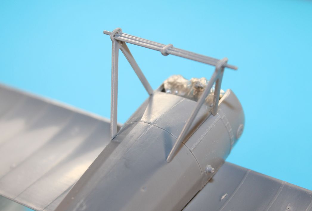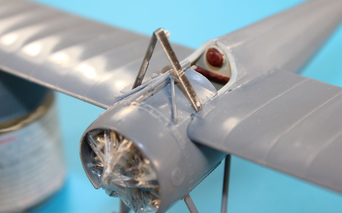 Сегодня появилось время на модель. И я приклеил пулемет, а так же из жести сделал V образную стойку для крепления расчалок, родная из пластика мне показалась хилой.