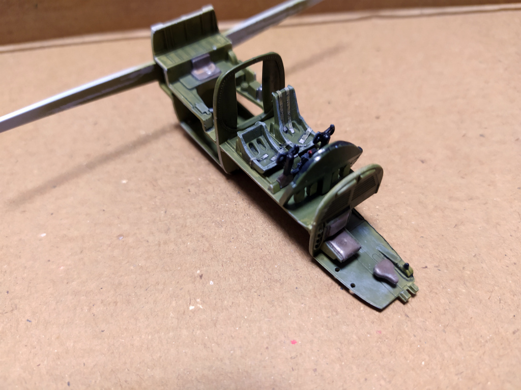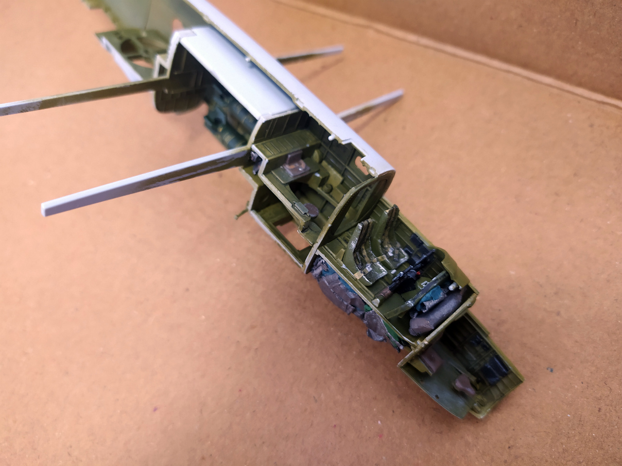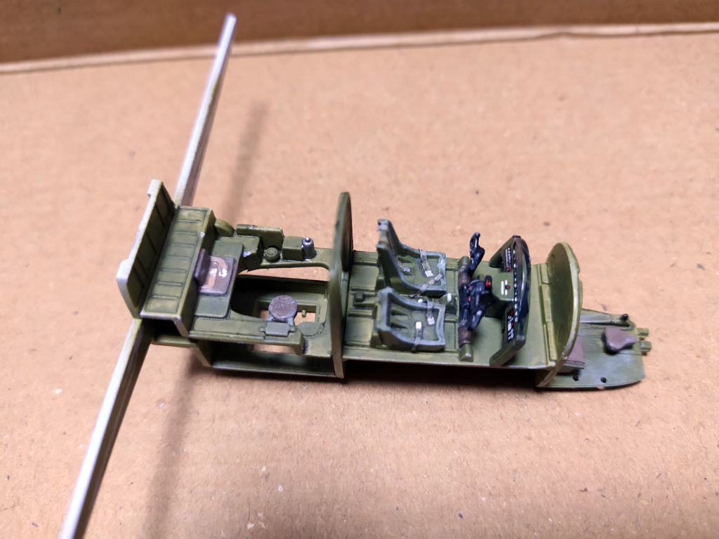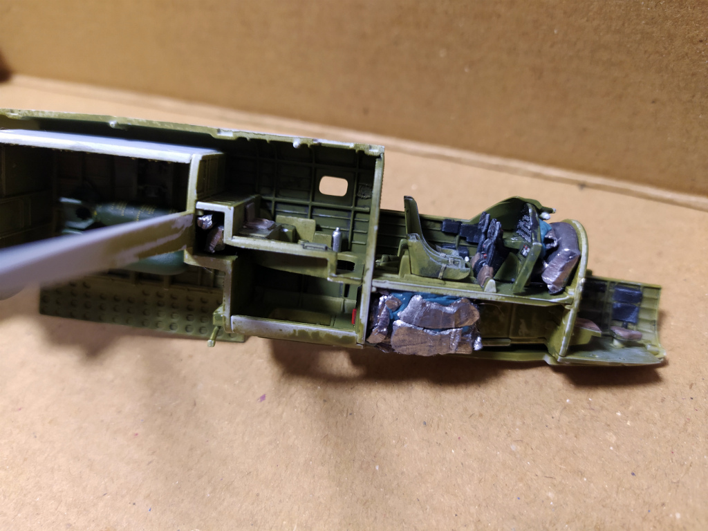 Всем доброго времени суток! Потихоньку собрал и покрасил внутрянку. Задул базовым цветом Interior Green от Vallejo Model Air. Мелочевку как обычно водорастворимым АКАНом. Затонировал маслом на уайт-спирите. Кинул на кресла пилотов ремни из модельного скотча. Разместил по укромным местам кусочки свинца на пластилине. Вопрос к коллегам, уже собиравшим этот самолёт - столько груза достаточно? Если нет, то куда еще размещать? По моему мнению, если в кабине груза мало, то остаются только мотогондолы