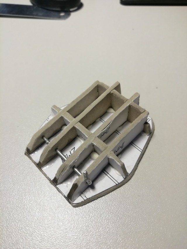 При разработке шпангоутов, сразу позаботился об обшивке. Так как собираюсь обшивать тем же 2мм переплетным картоном(потом под автомобильную шпатлевку), нарисовал подклейки под шпангоуты, на которые будет ложиться обшивка. Вот на фото они уже наклеены.