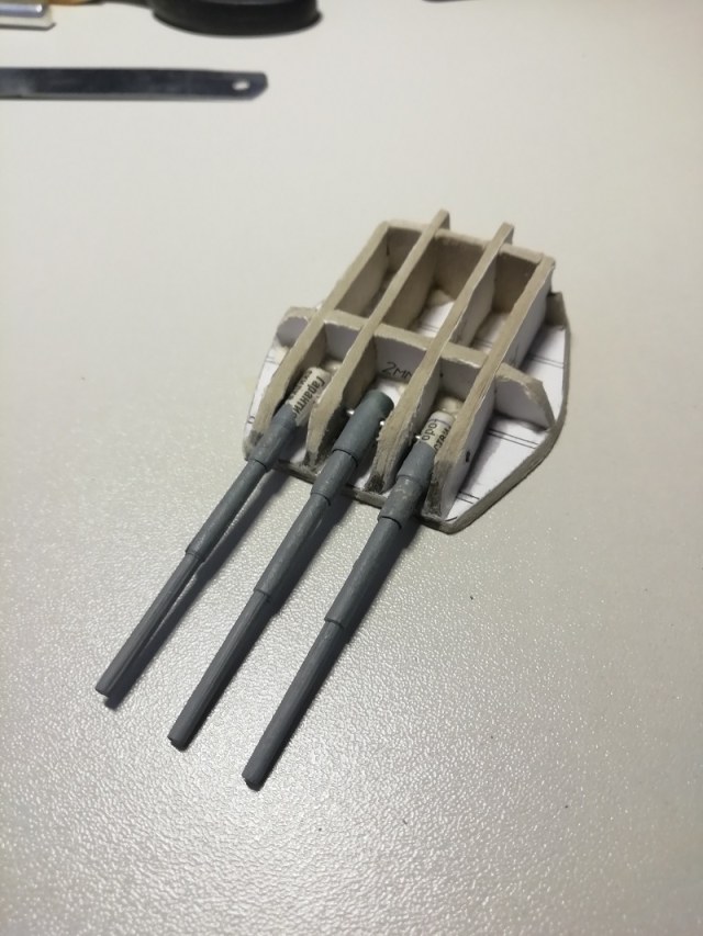 Вчера примерил на корпусе, почти все сошлось, на четырех орудиях только палуба верхняя немного не попала, буду думать как исправить.