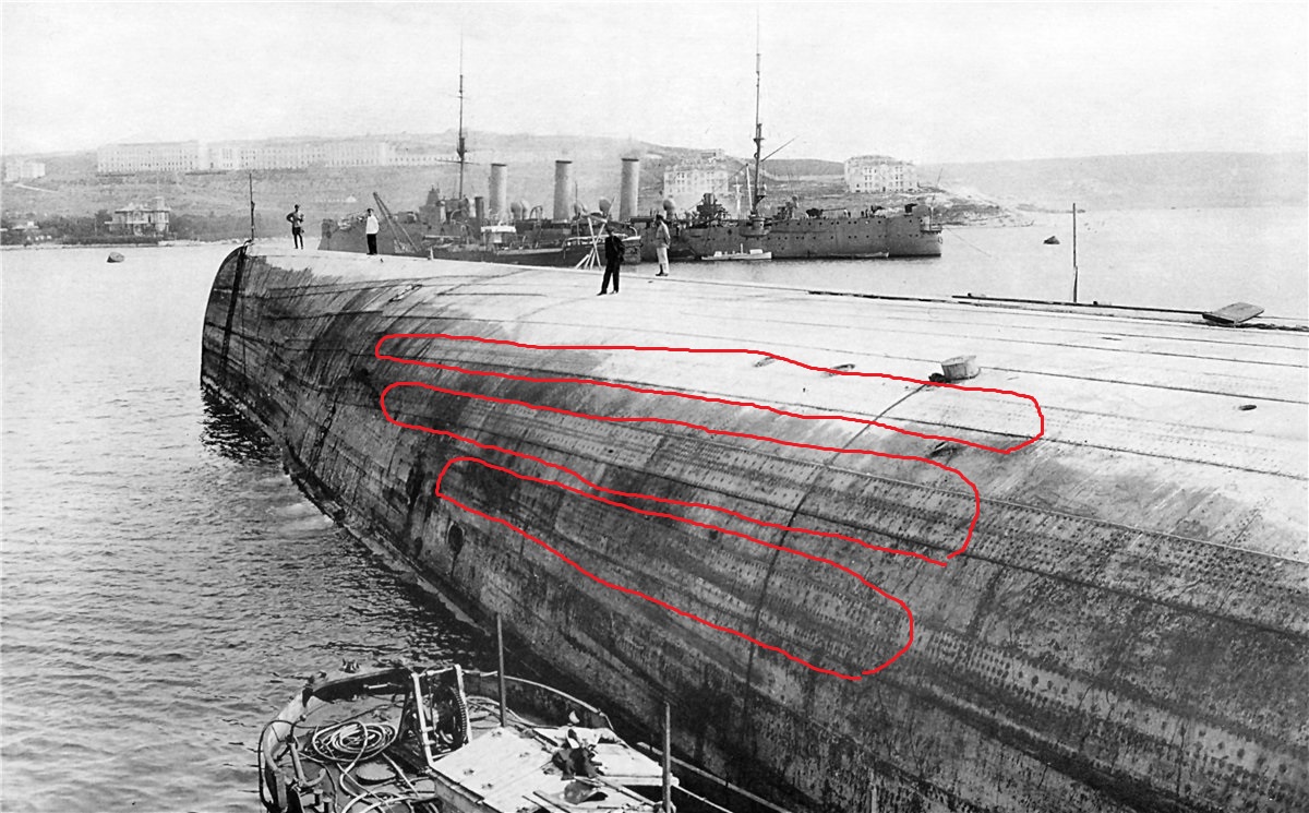 Нету там никаких "скрепляющих полос" по стрингерам.,То,что у Вас на фото Марии обведено-выступающие пояса обшивки,которые шли практически по всей длине корпуса.Весь корпус обшивался продольно,от киля вверх к бортам.Ряды обшивки укладывались с перехлестом и как бы в шахматном порядке.Поэтому корпус ,в подводной части,выглядит как бы состоящим из выступающих и утопленных полос.В случае с Севастополем такой еще момент-он на Балтийском заводе строился ,а у них пояса обшивки выглядели иначе,чем на черноморских императрицах-без выступающих поясов.Там был свой способ крепления листов к набору "с высадкой кромки по пазам".