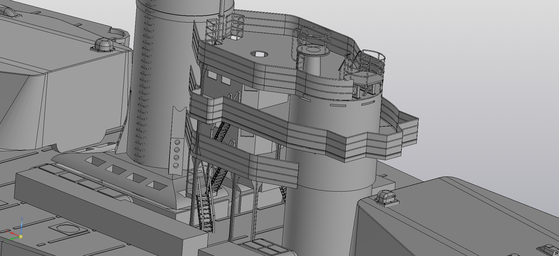 Но есть один нюанс: на втором ярусе носовой надстройки в месте примыкания к дымовой трубе был выступ.