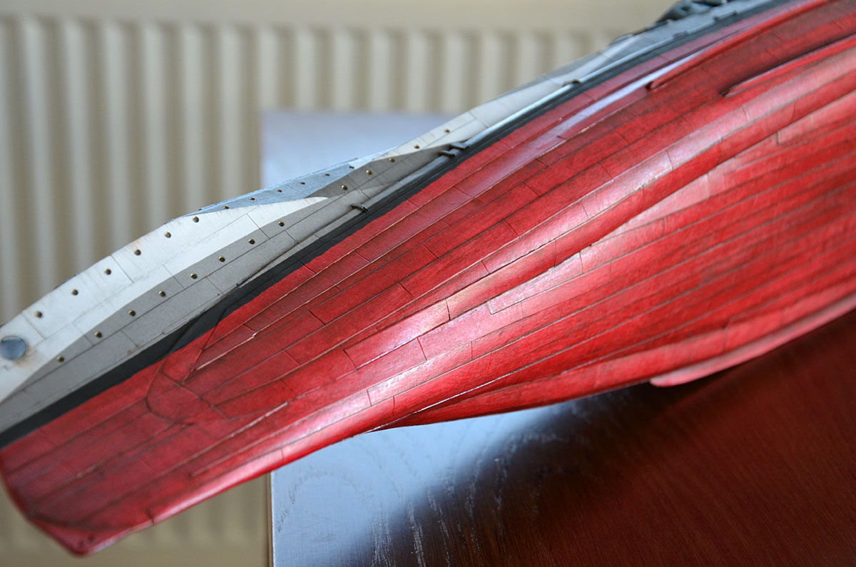 На данном этапе остановился на расшивке корпуса ниже бронепояса, а конкретнее хочу показать скрепляющие полосы вдоль стрингеров.
