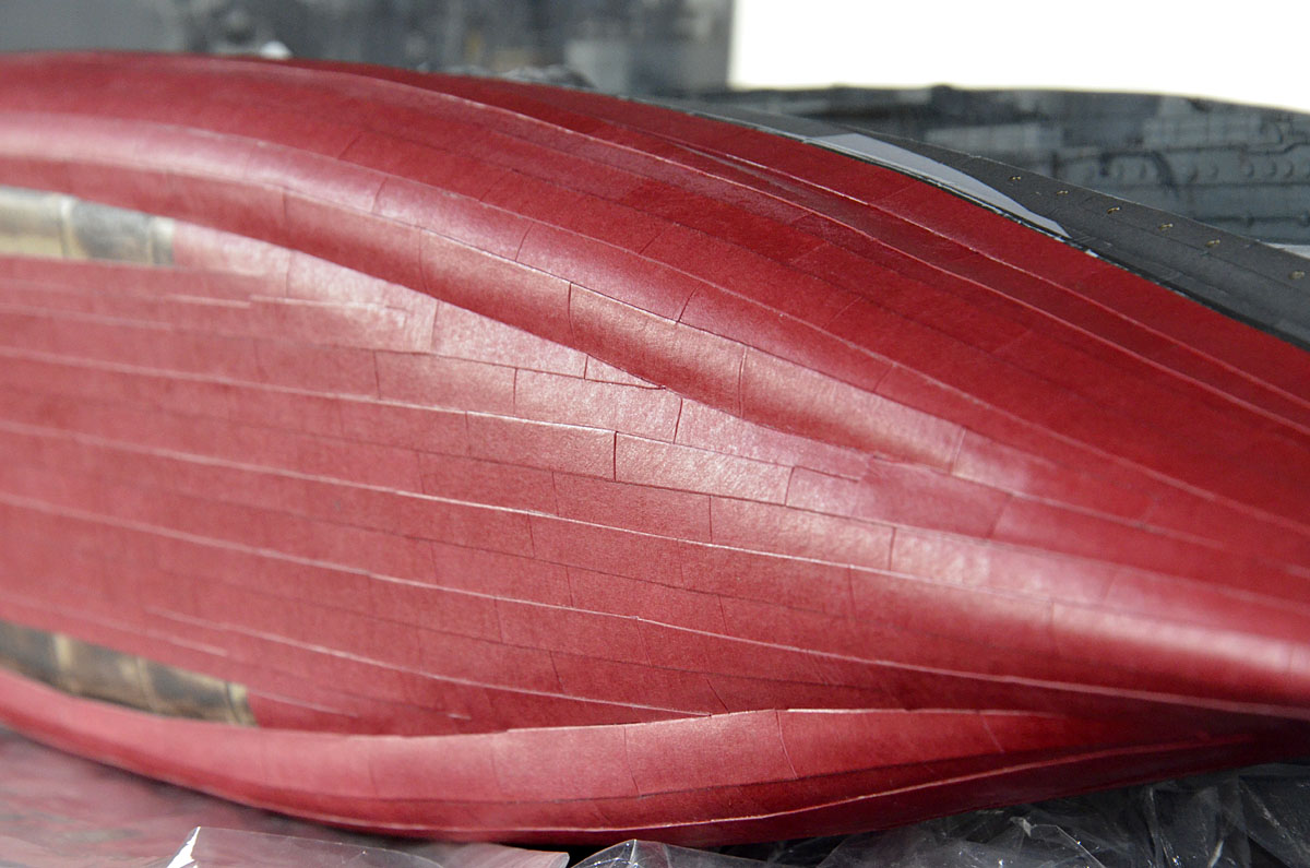 Вот на фото видно как идут скрепляющие полосы по обшивке, вдоль стрингеров. Полосы идущие до самой носовой оконечности, имеют переход на стык обшивок (тонкая полоса):