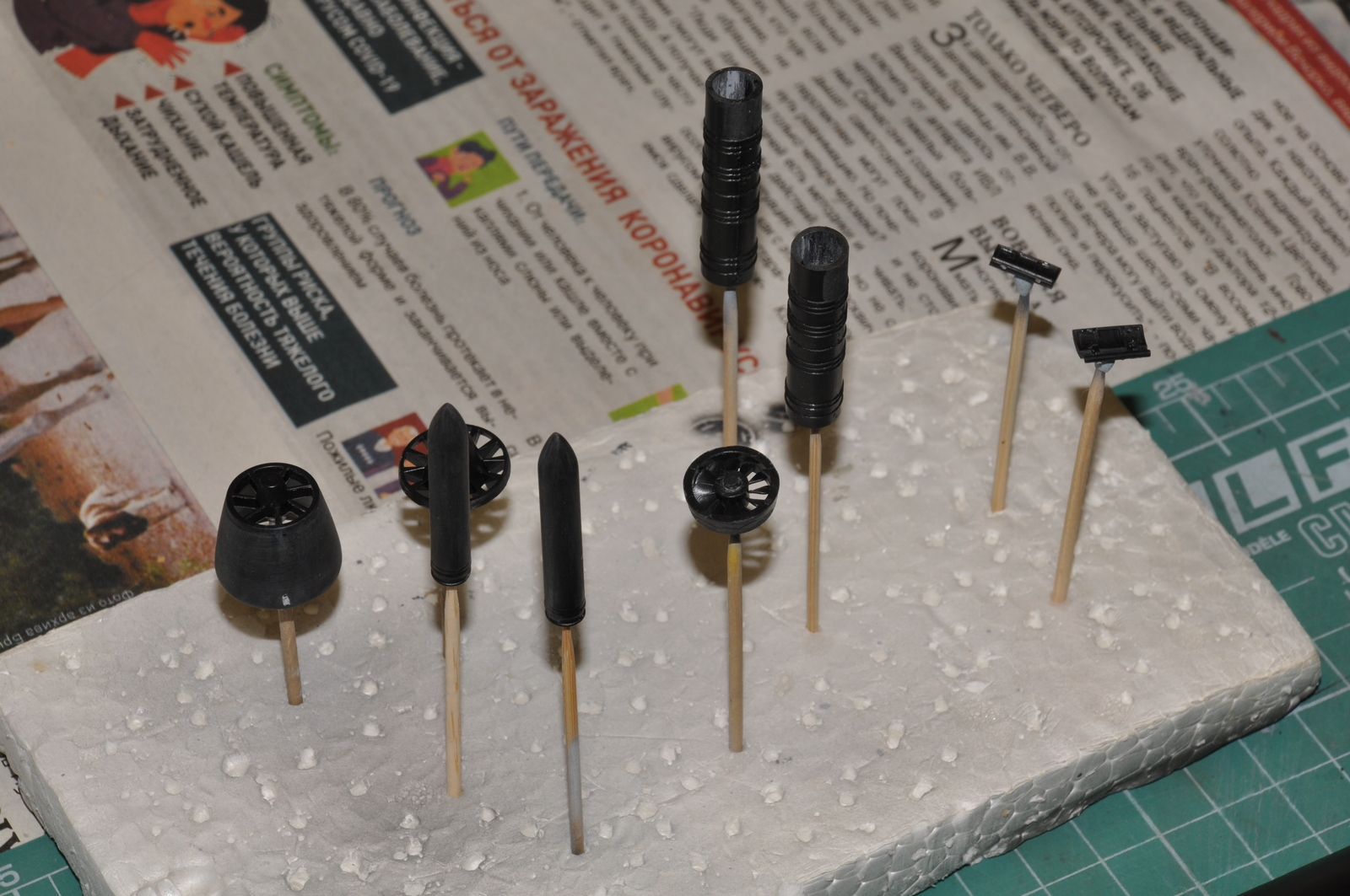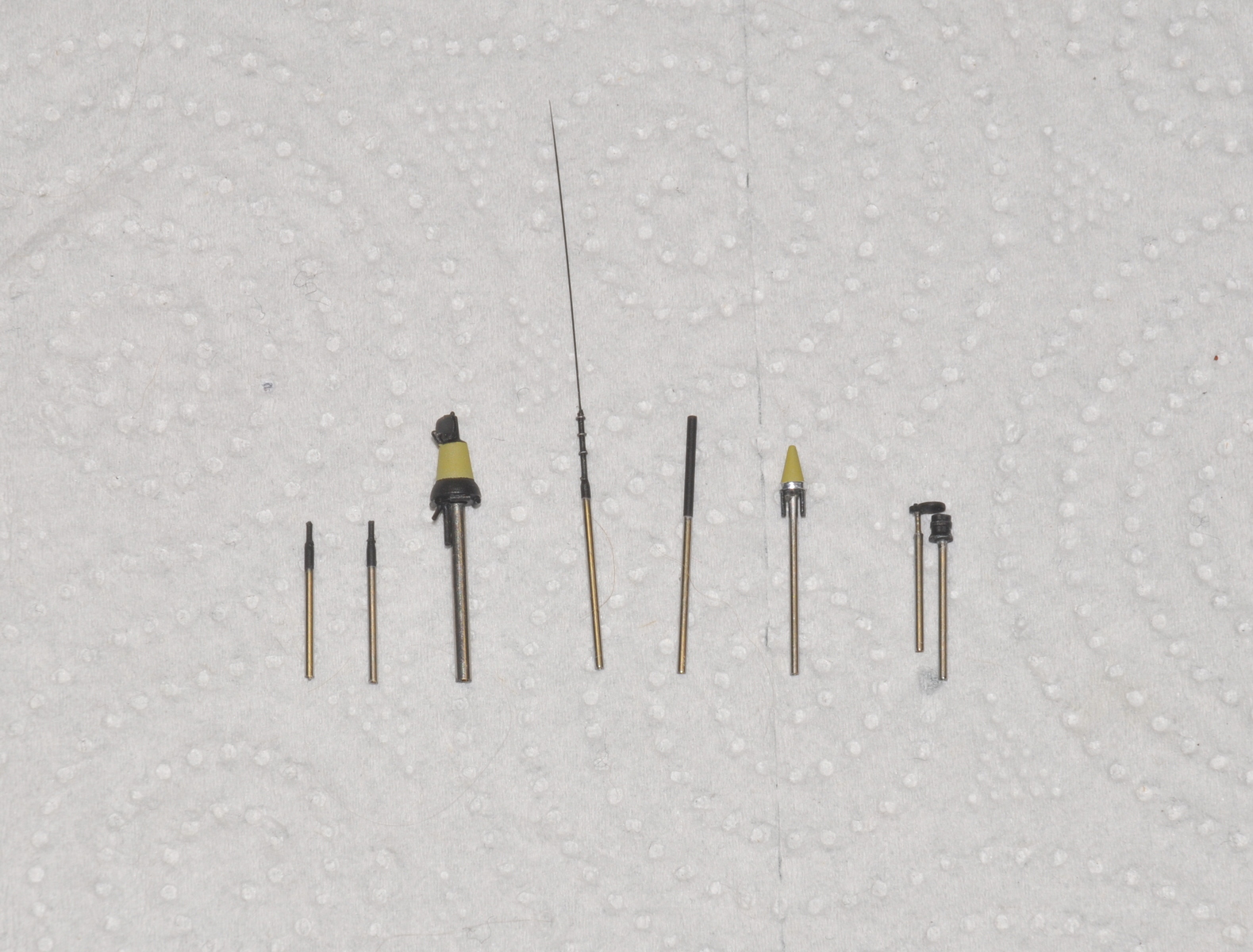 Закончил с выдвижными устройствами. "Головы" от "Радиана", "Синтеза" и РКП остались звездовские - качество вполне хорошее. Я Чуть-чуть доработал только "Радиан". Перископы и антенны связи - из медицинских иголок, проволоки и трубок из запасов.