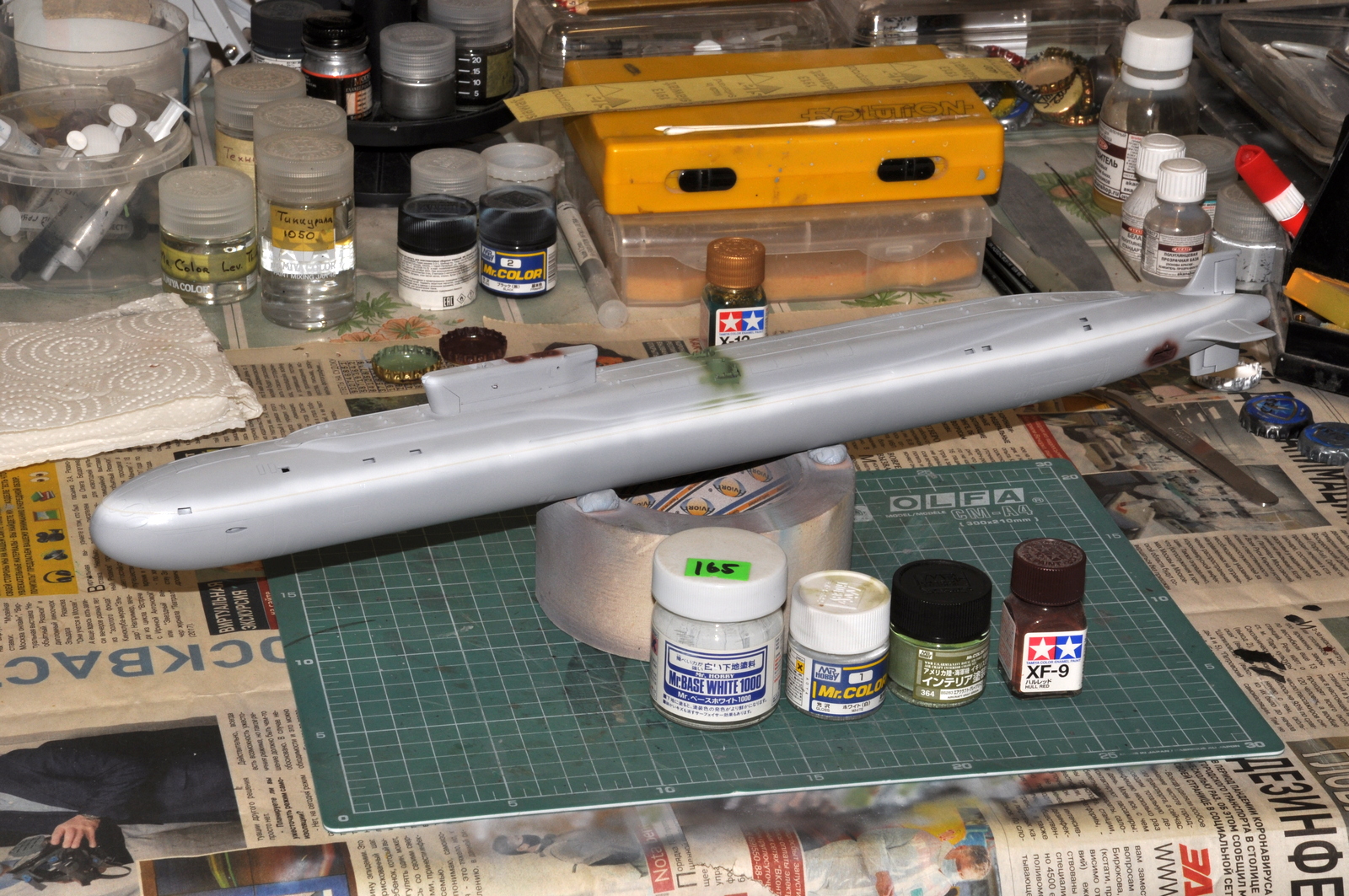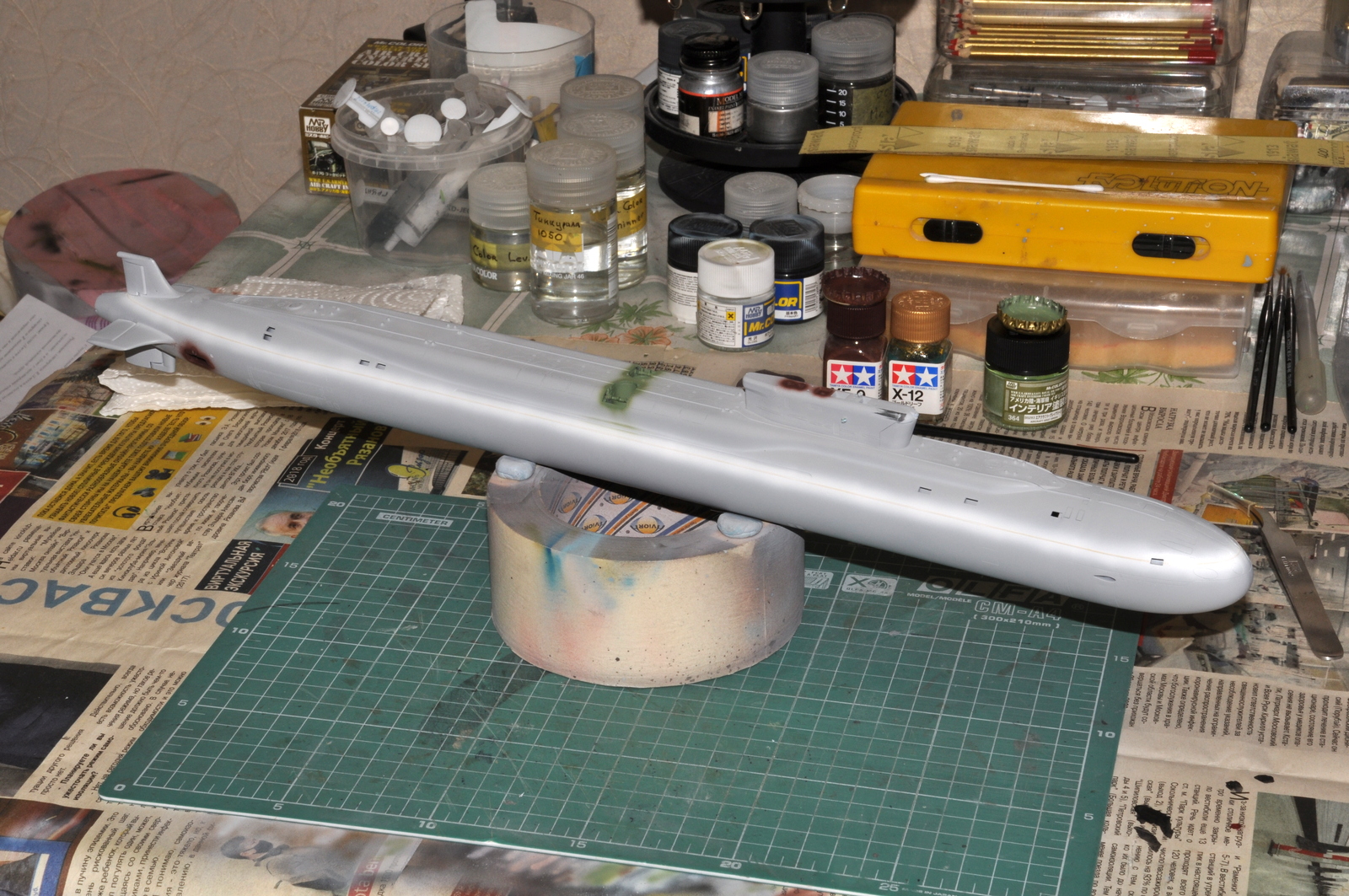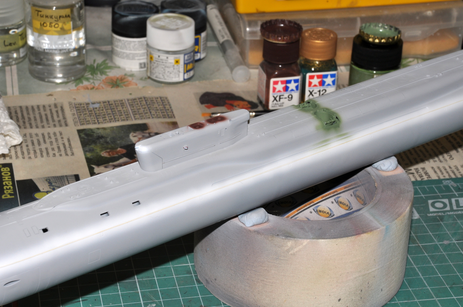Закончил работу с корпусом. Зашлифовал проблемный стык надстройки и корпуса - сейчас значительно лучше. Кроме того, накрасил и замаскировал WL, веду мелкие окрасочные работы: