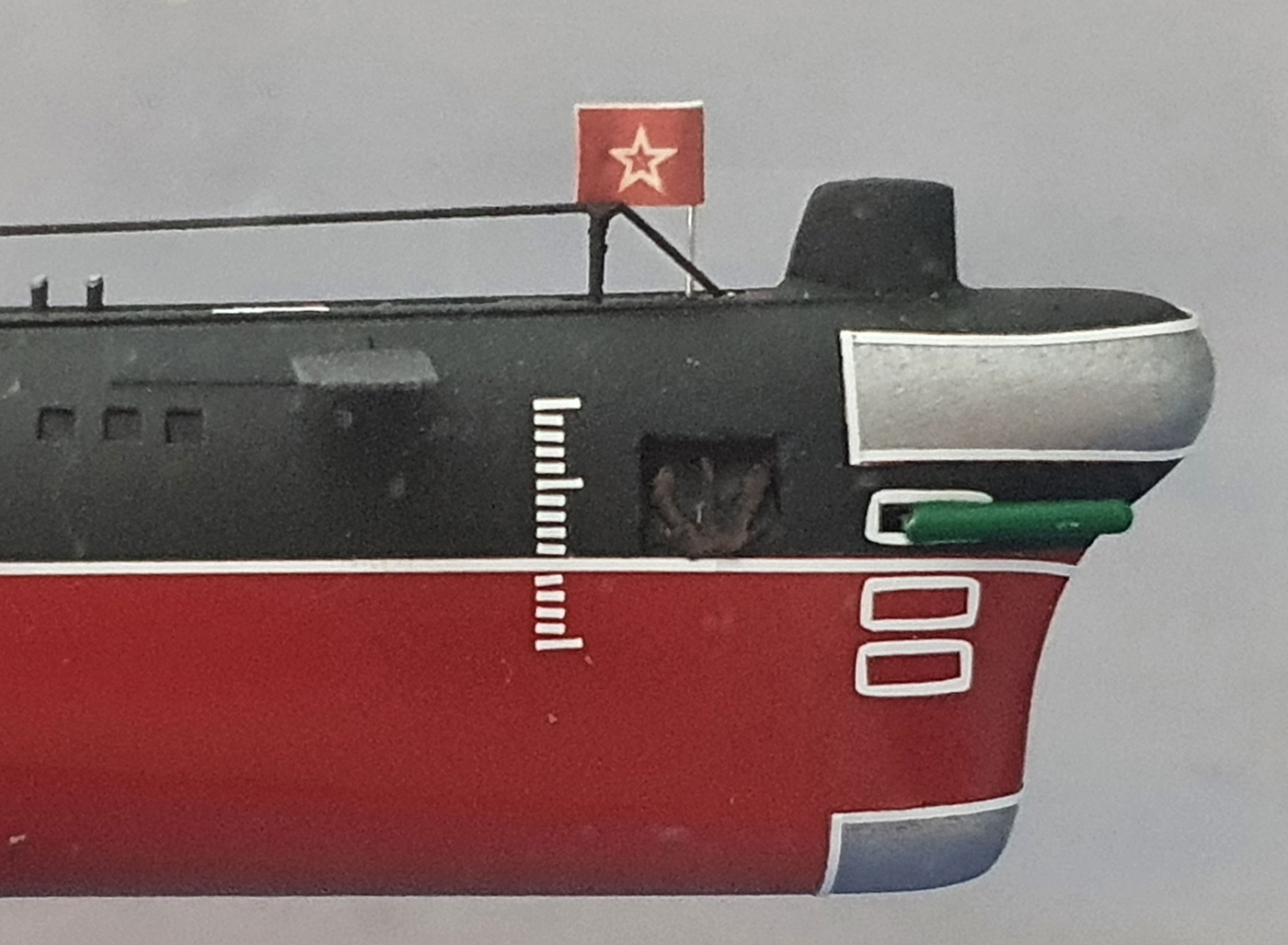 29 октября 2017 года модель получил и испытал шок!!! Модель сделана наспех, коряво и не соответствует оригиналу. Наиболее чудовищные ошибки: отсутствует заваливаемая антенна дальней связи "Ива", отсутствует аварийно-спасительный буй в носу, отсутствует крепление заваленной антенны "Ива" в корме легкого корпуса за рубкой, закрашен, якобы кузбаслаком (в случае модели – чернью) "Петух" ГАС звукоподводной связи, а антенна ГАС "Плутоний" очень узкая, закрашены не намеченные на ограждении рубки прямоугольные антенны ГАС звукоподводной связи, отсутствует в составе выдвижных устройств рамка штурманского радиопеленгатора, зато куча какой-то изогнутой всячины, якорный ящик весьма корявый, якорь медный, шпигаты прорезаны криво. Передние крышки торпедных аппаратов не прорезаны, а просто нарисованы, торпеды - простые палочки, наклеенные сверху на корпус модели в районе не открытых передних крышек носовых и кормовых торпедных аппаратов («дополнительная услуга» за 1000 рублей), передние крышки носовых и кормовых торпедных аппаратов находятся выше ватерлинии, рубочная дверь не прорезана, а нарисована белой краской, перископы ужасные, леера неестественно большого диаметра, ходовые огни просто накрашены, ограждение рубки сделано недостоверно и топорно. Неверно размещены флаги (гибрид «ходового» и «швартового - базового» вариантов. Эту модель уже не переделать, её можно только "втюхать" кому-нибудь, кто в глаза не видел ДиПЛ 641 проекта, не ходил на ней в море и собирает все подряд.