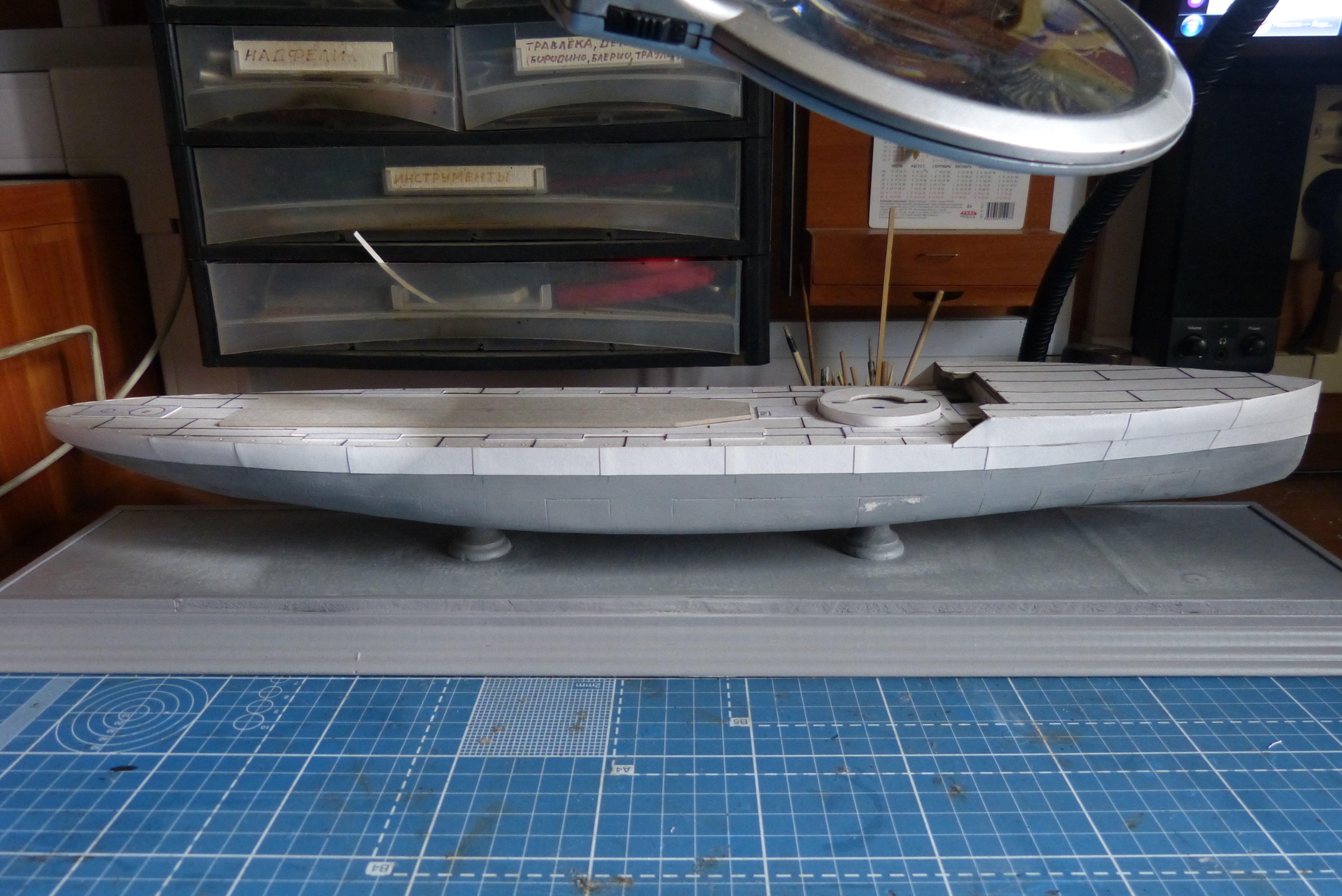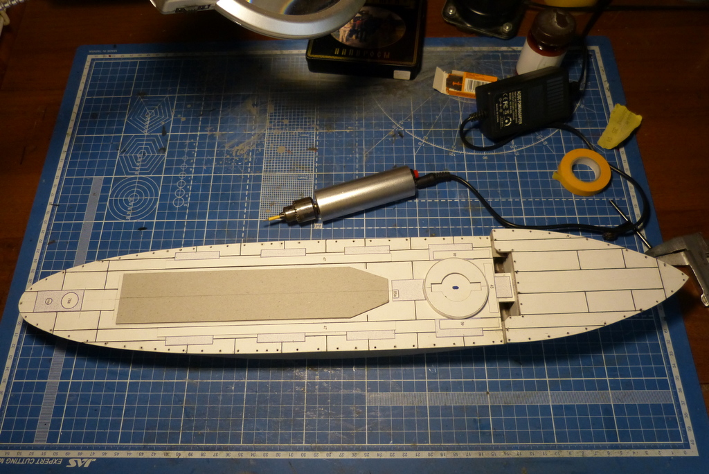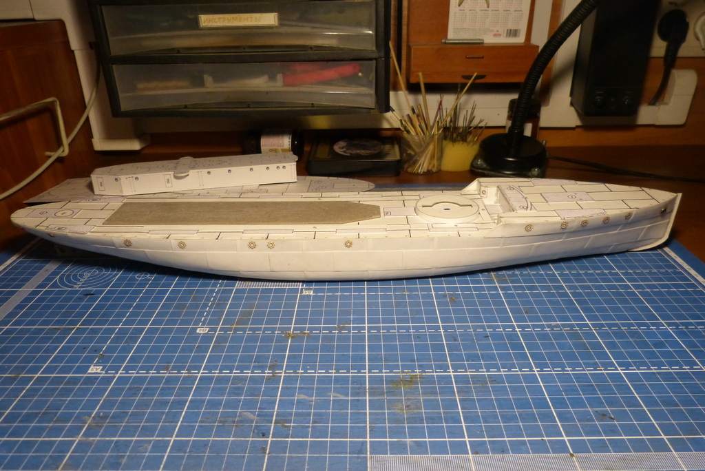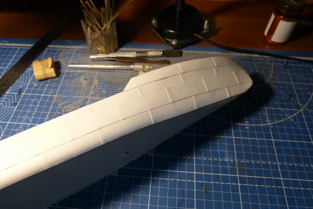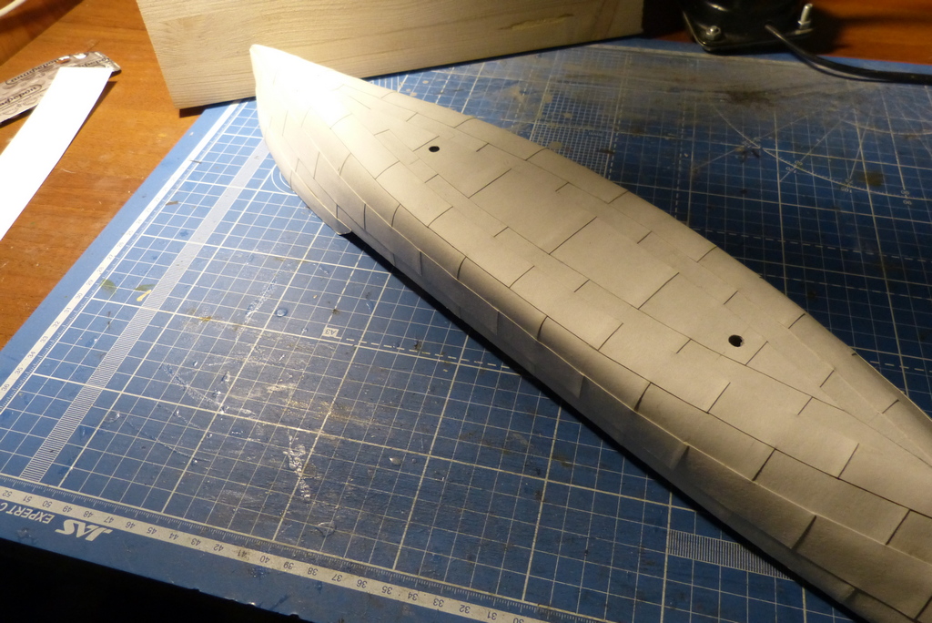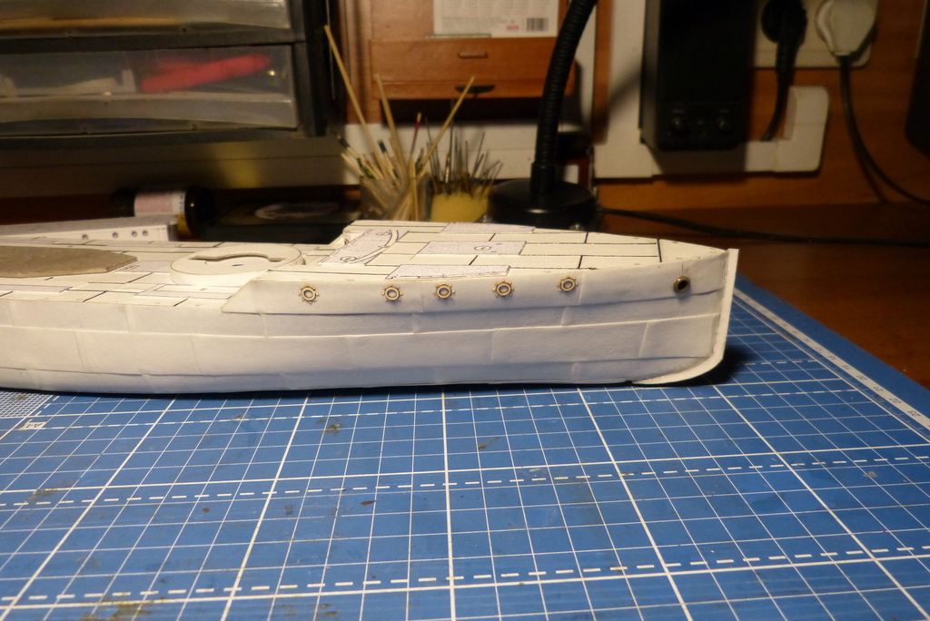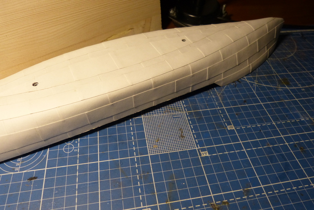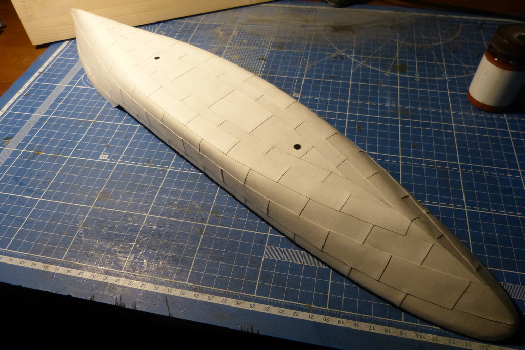 После обшивки корпус был зашкурен чтобы уменьшить и чуть сгладить края листов обшивки,потом пролачено обильно,лак поднимает бумажный ворс,потом мелким наждаком отшлифовано,ну и попытался изобразить иллюминаторы