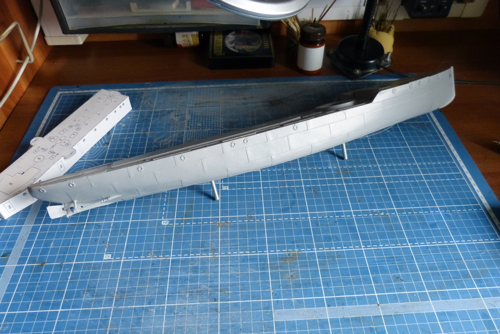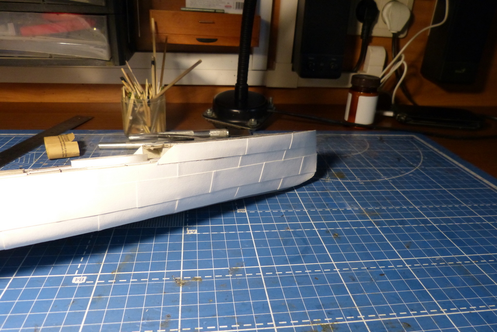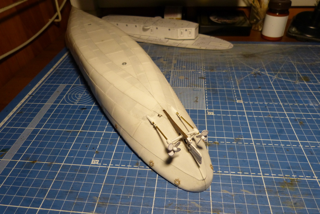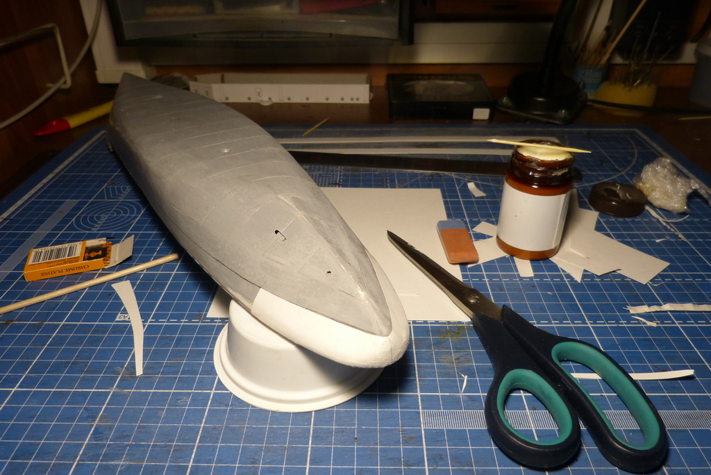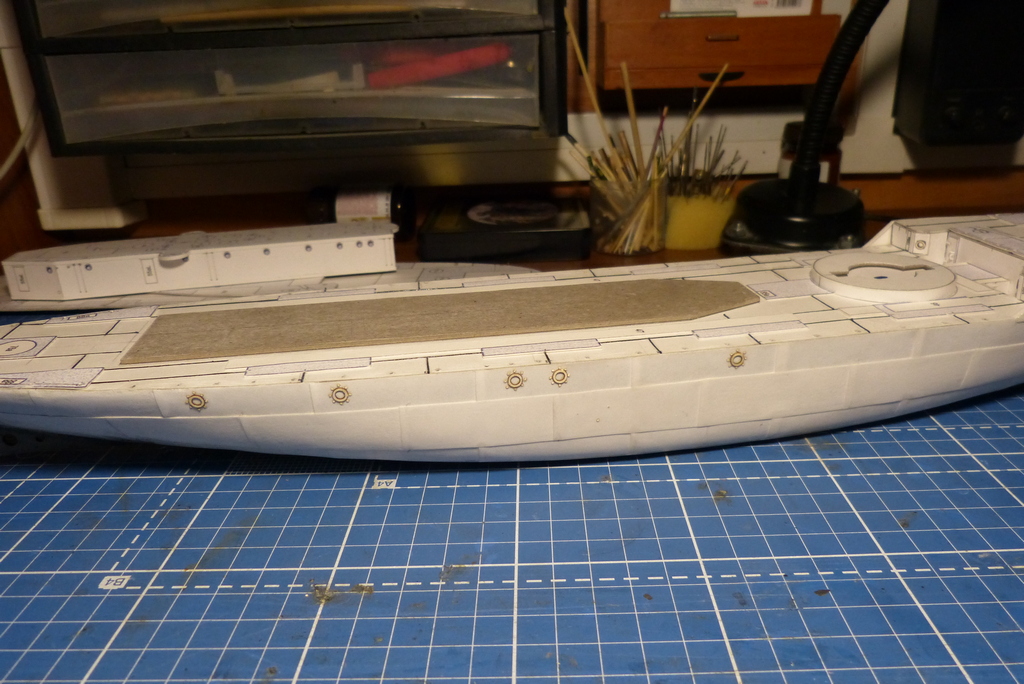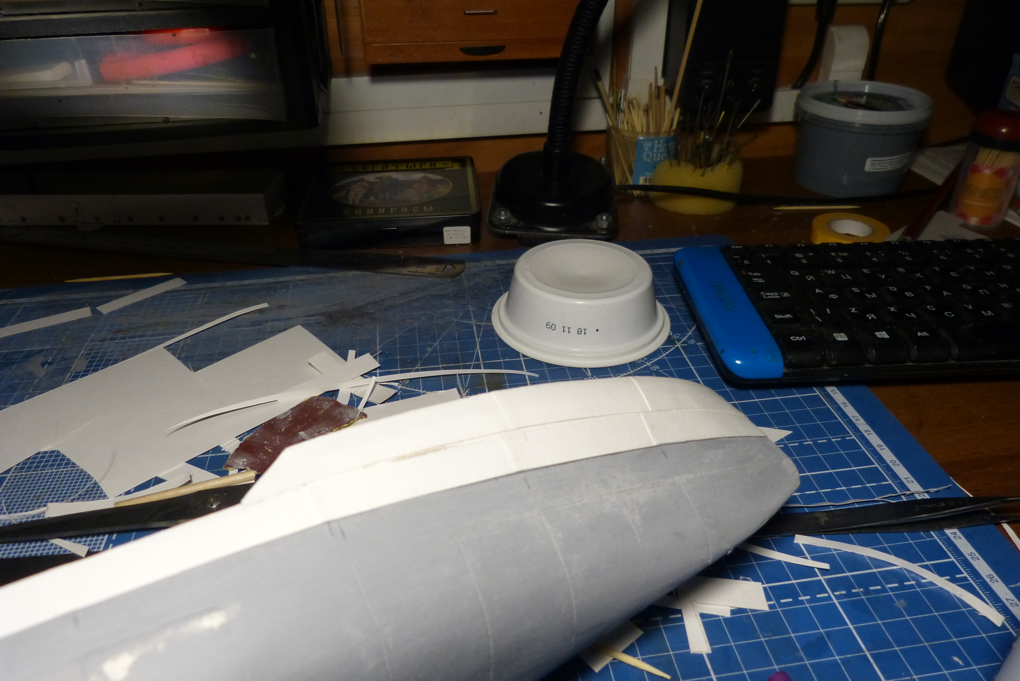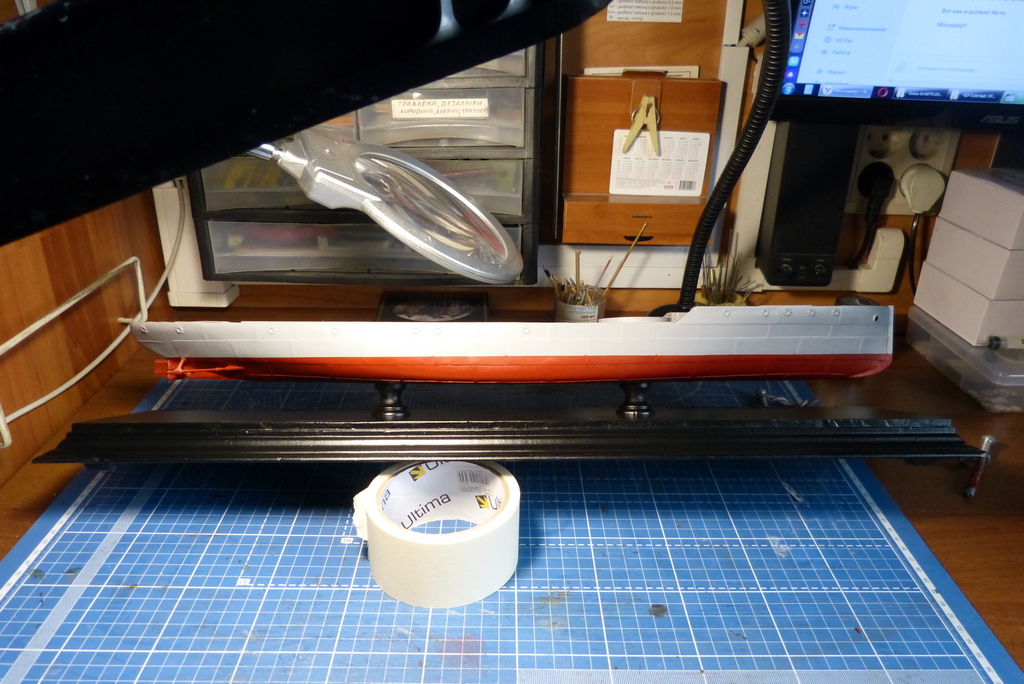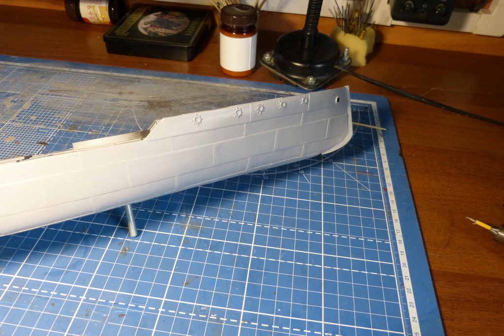 После обшивки корпус был зашкурен чтобы уменьшить и чуть сгладить края листов обшивки,потом пролачено обильно,лак поднимает бумажный ворс,потом мелким наждаком отшлифовано,ну и попытался изобразить иллюминаторы