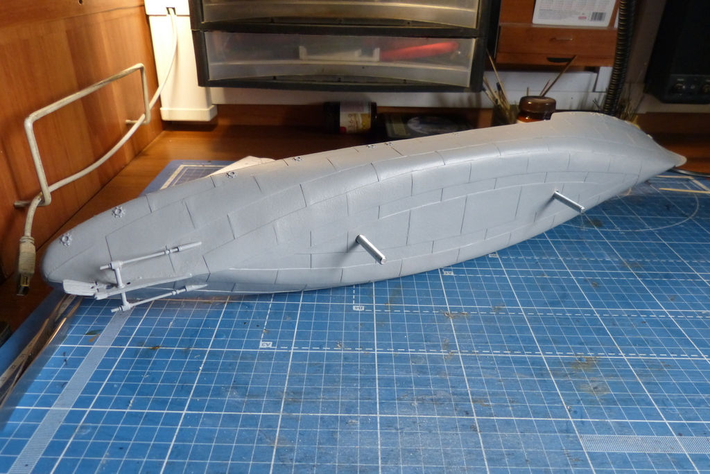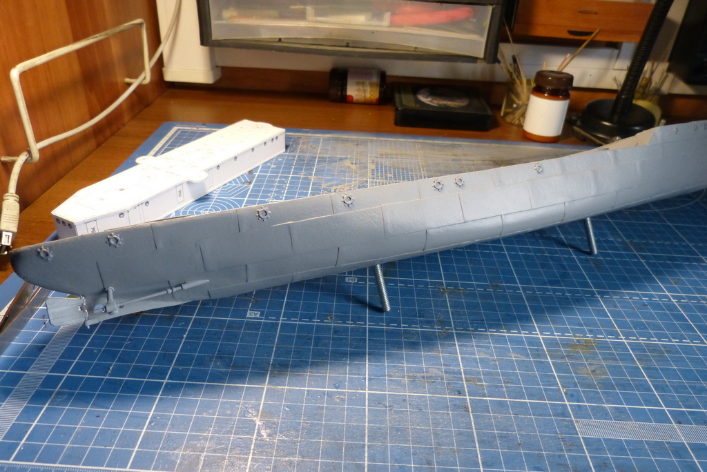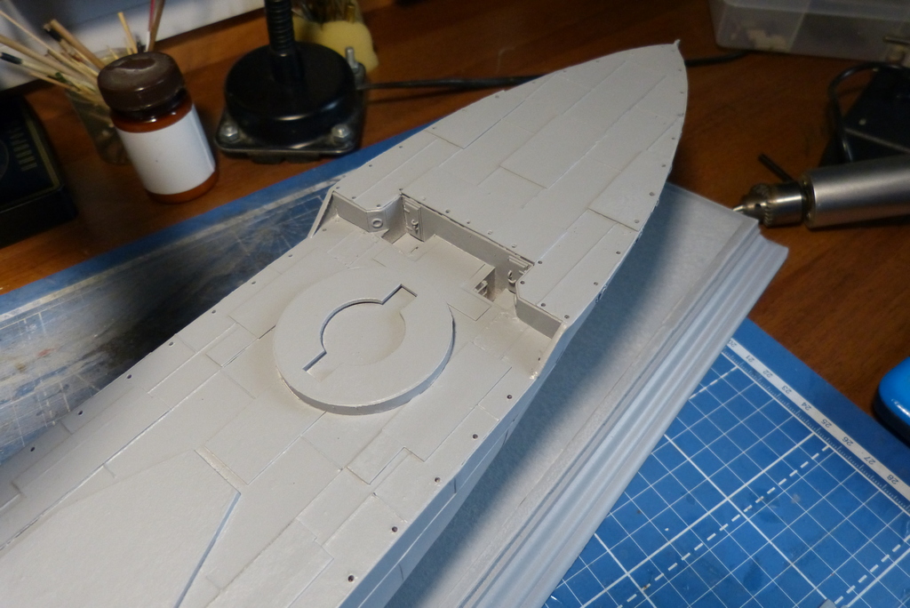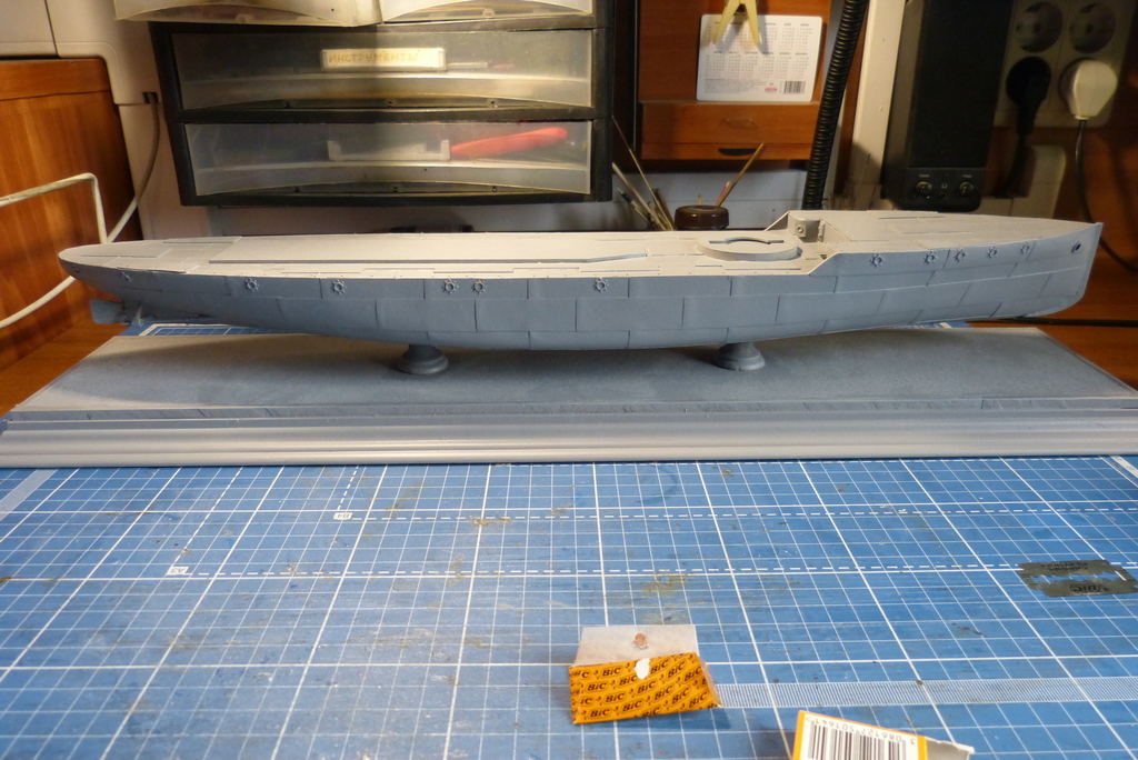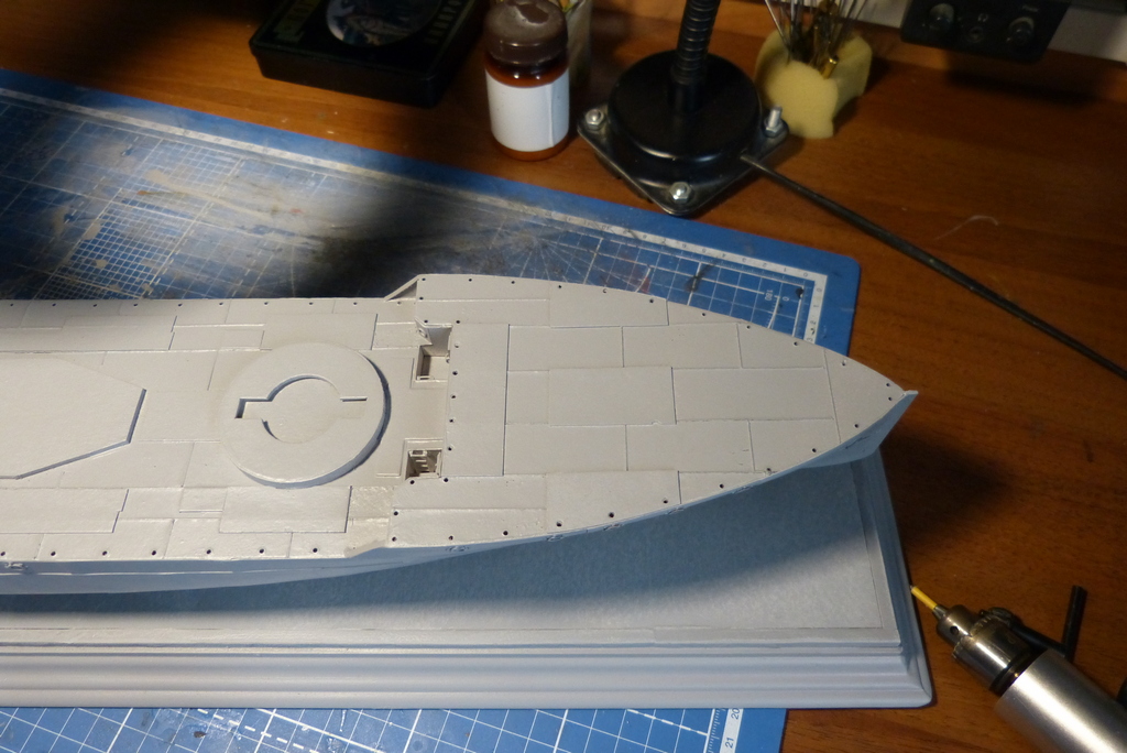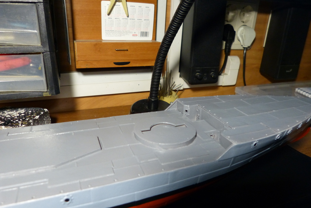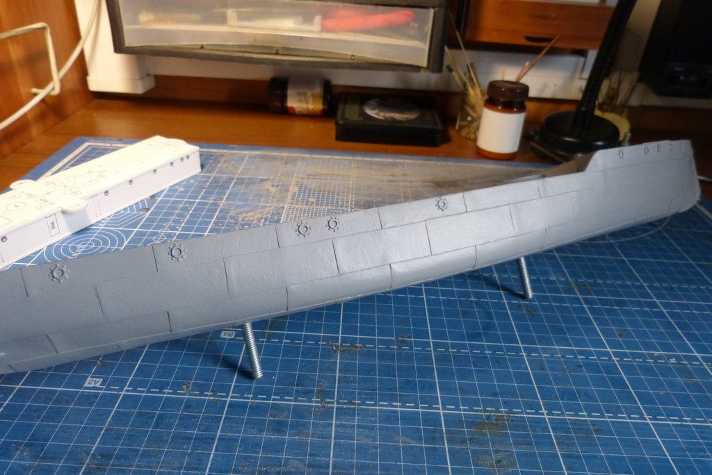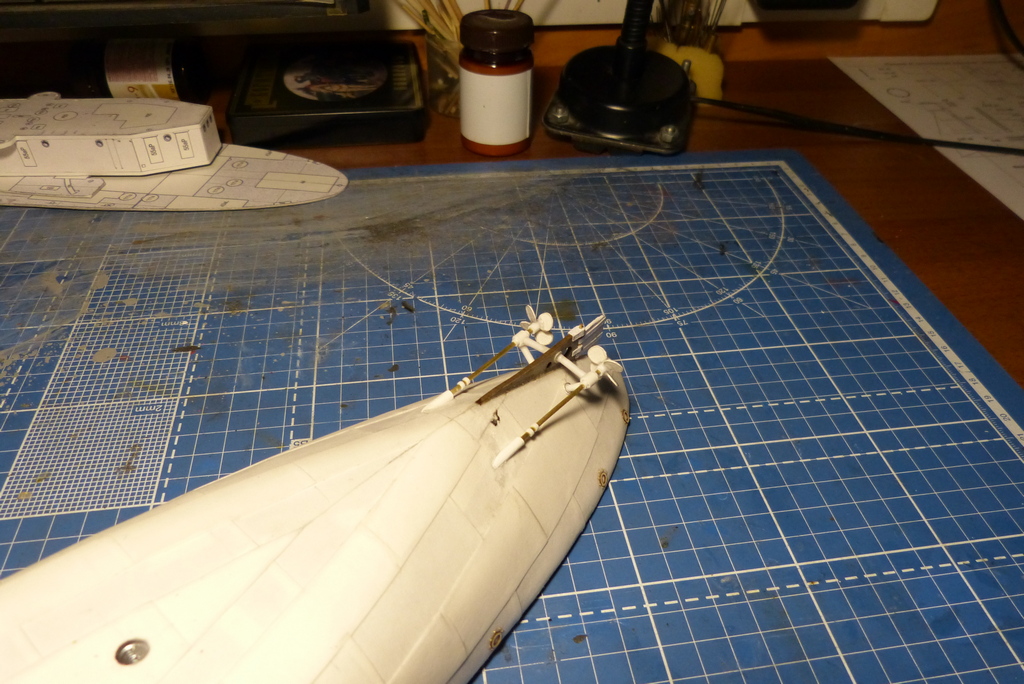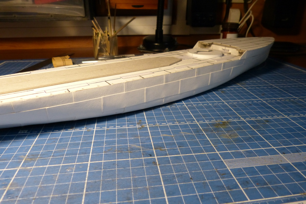 После обшивки корпус был зашкурен чтобы уменьшить и чуть сгладить края листов обшивки,потом пролачено обильно,лак поднимает бумажный ворс,потом мелким наждаком отшлифовано,ну и попытался изобразить иллюминаторы