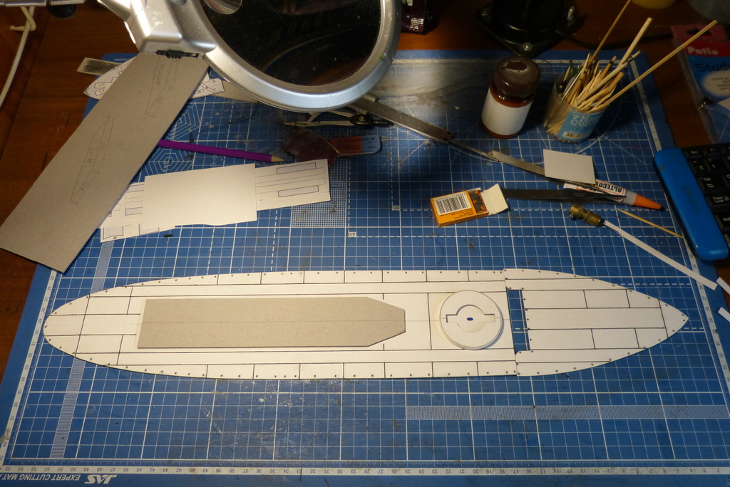 Палубу тоже вычертил новую,решил тоже попробовать под расшивку,надрезал по линиям расшивки,продавил иглой и в полученную канавку уложил натянутую прококлееную нить