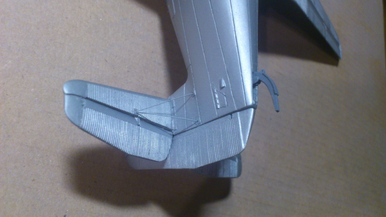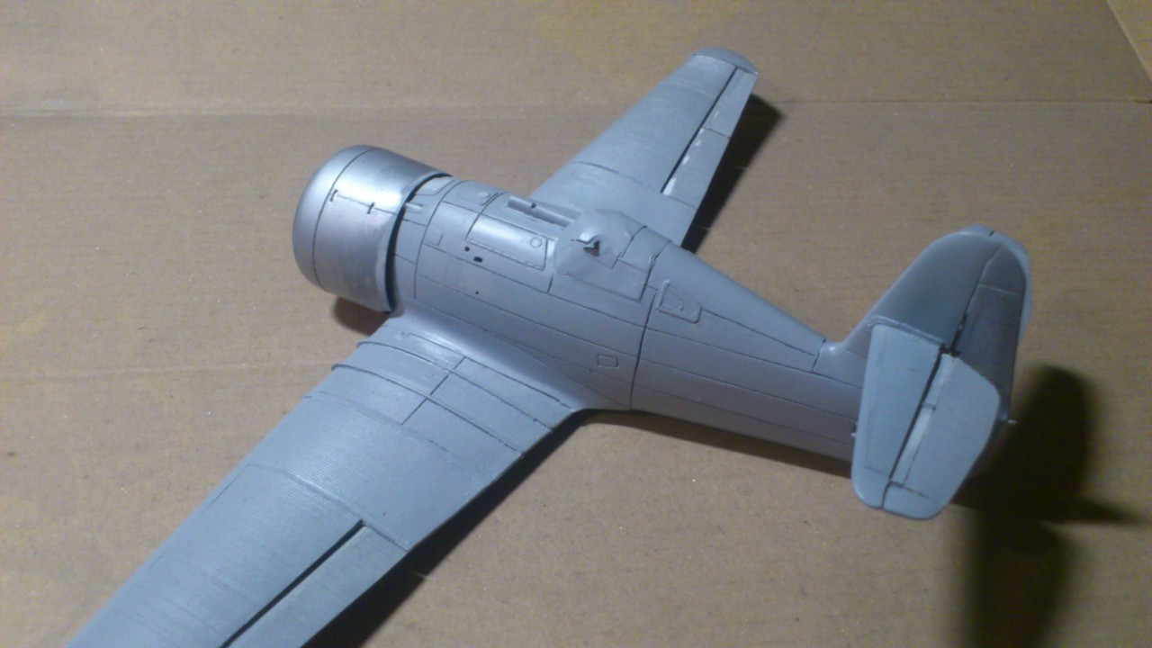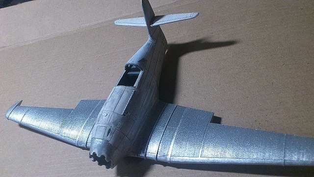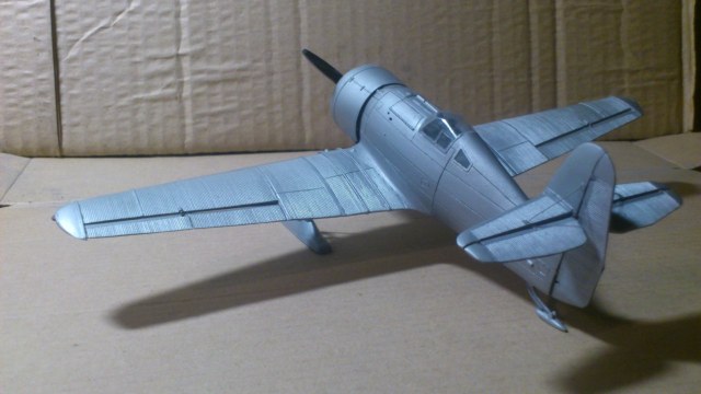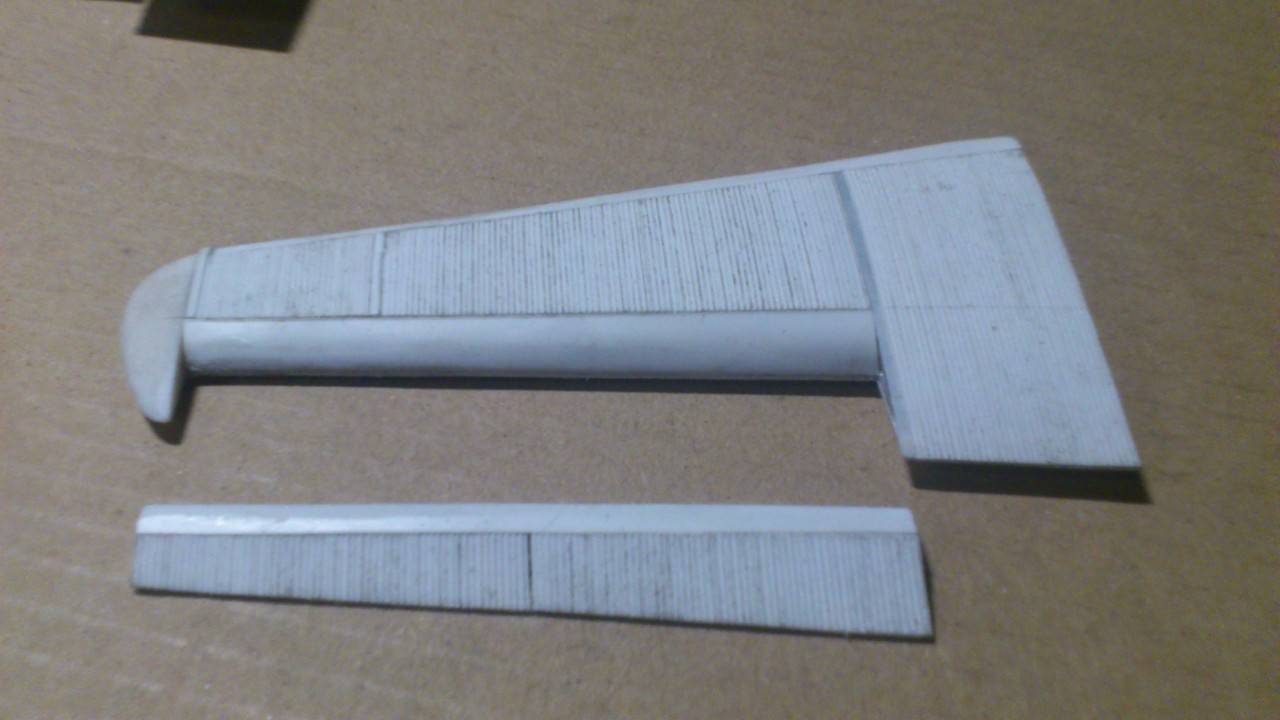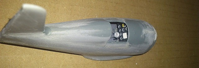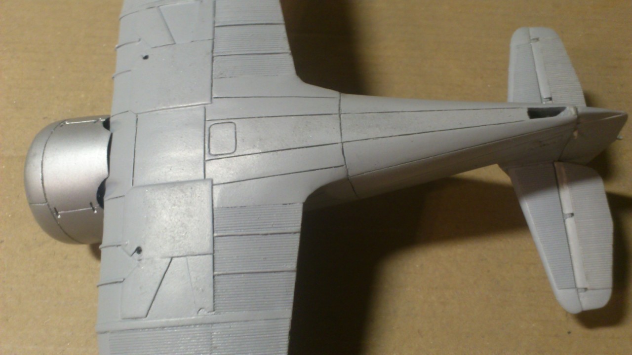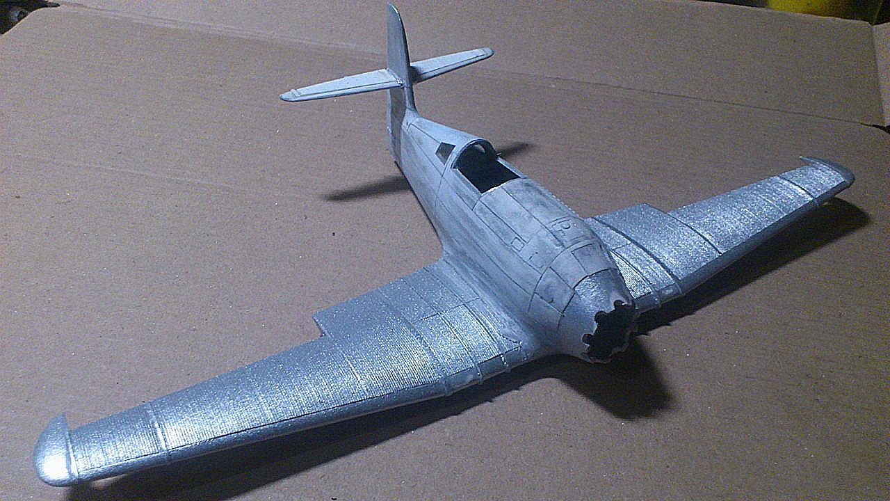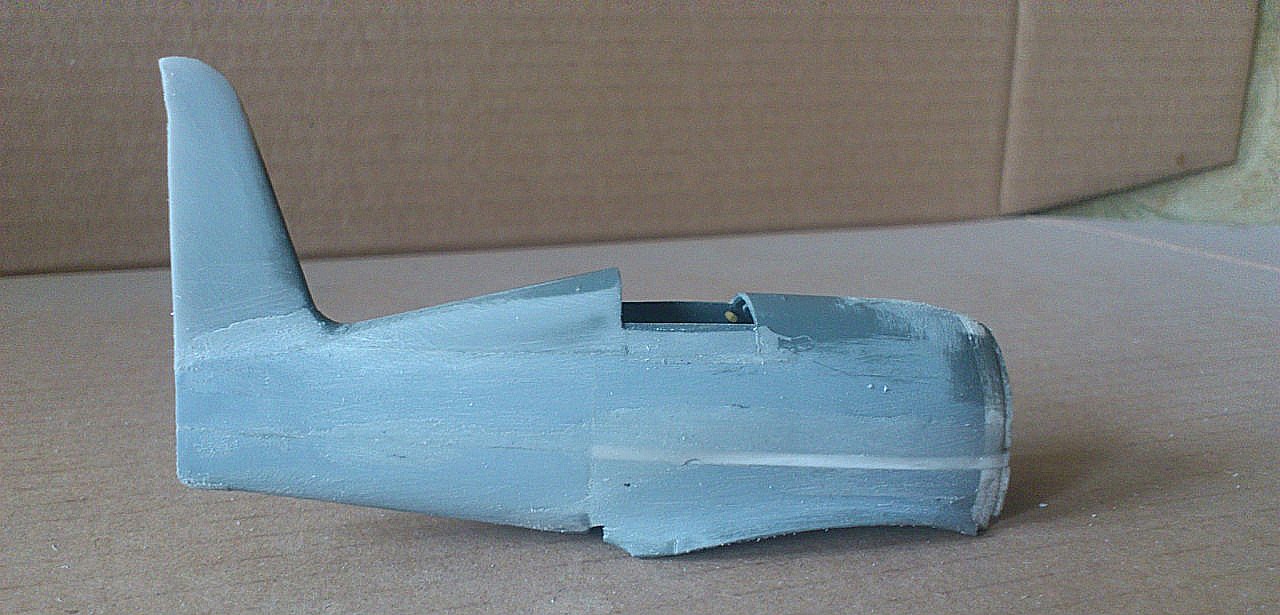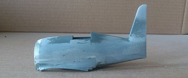 Установил стабилизатор. Задул модель серебрянкой для выявления дефектов. Прорезал окошки и вклеил стёкла, специально зделал переразмеренные что бы проще было вышкуривать зашпаклёванные швы. Обрезал капот, вырезал углубления под цилиндры.