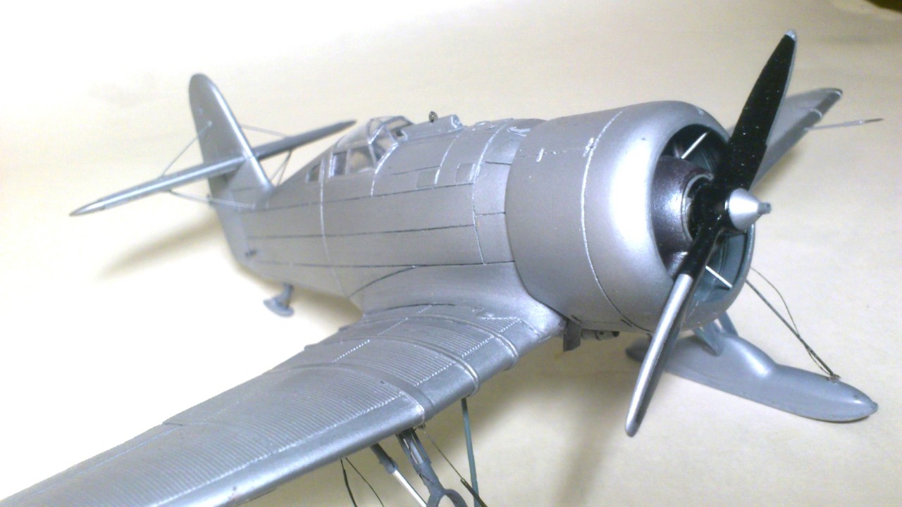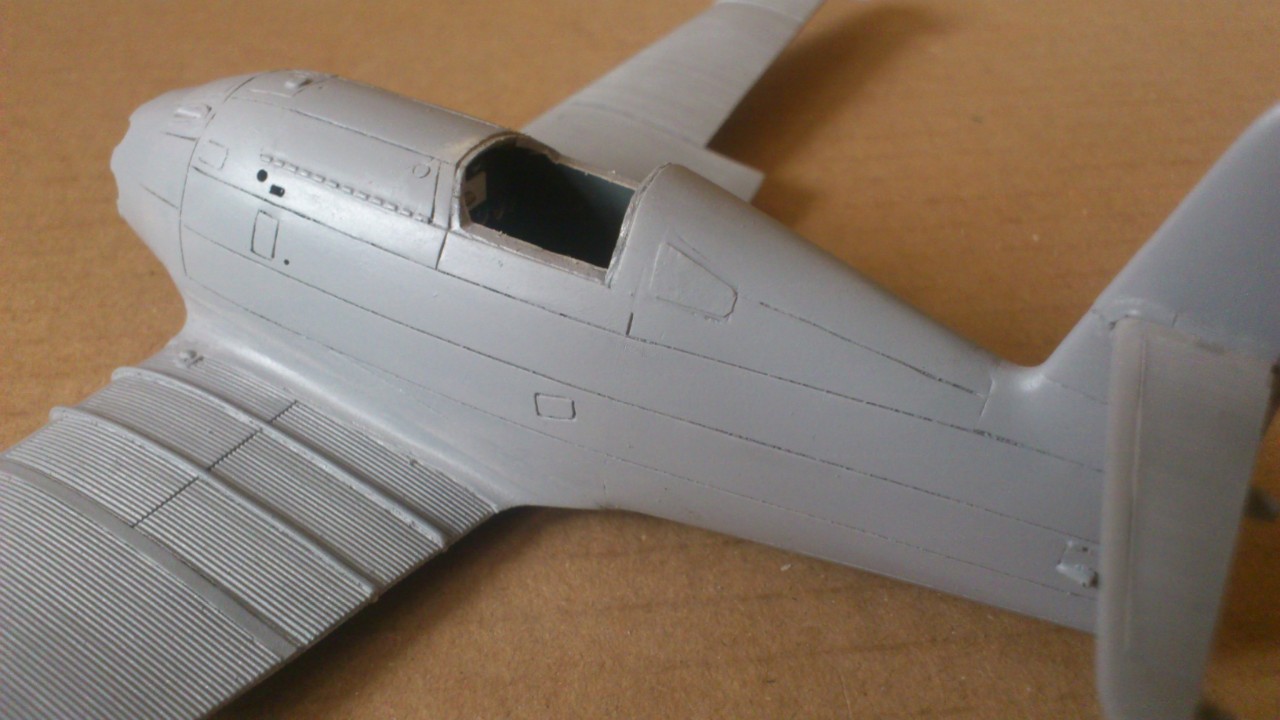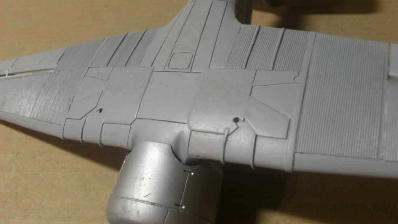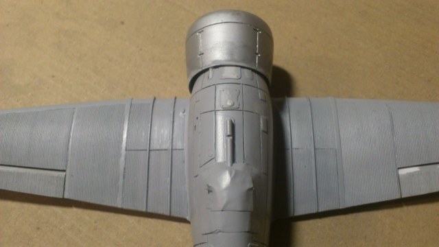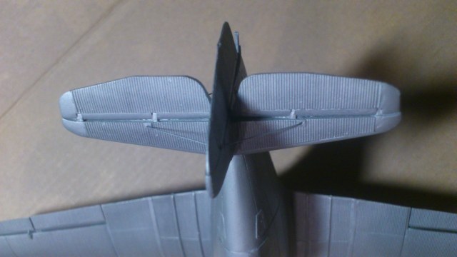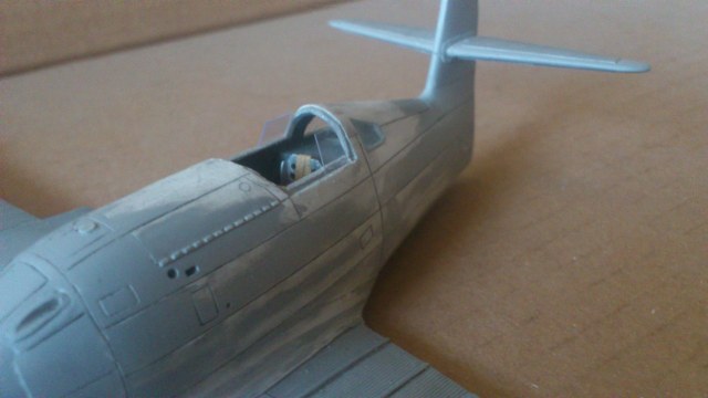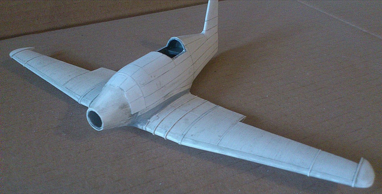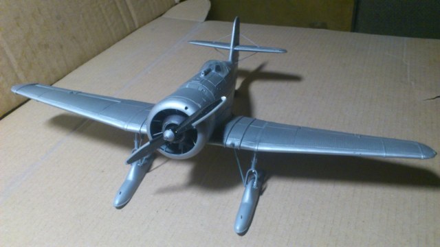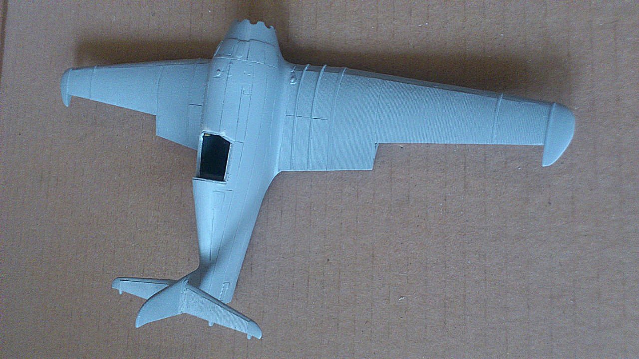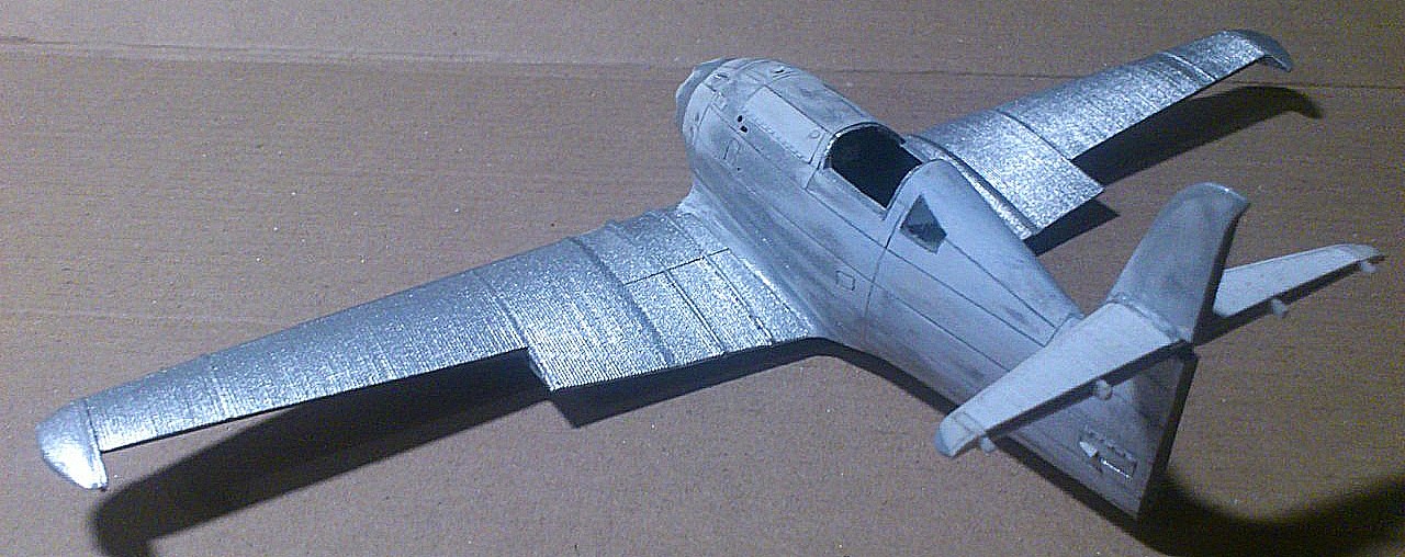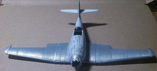 Установил стабилизатор. Задул модель серебрянкой для выявления дефектов. Прорезал окошки и вклеил стёкла, специально зделал переразмеренные что бы проще было вышкуривать зашпаклёванные швы. Обрезал капот, вырезал углубления под цилиндры.