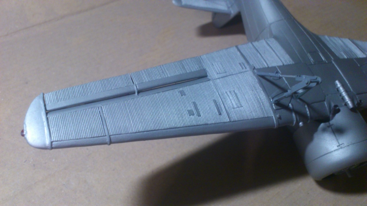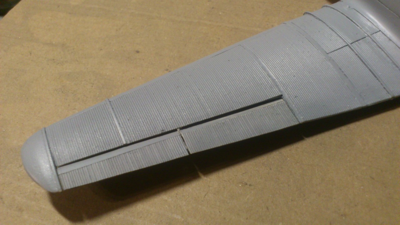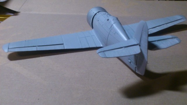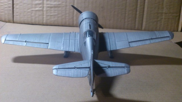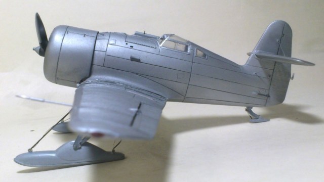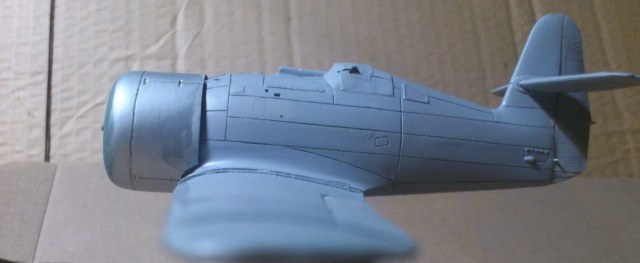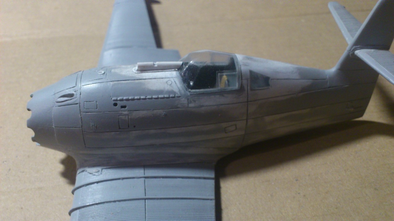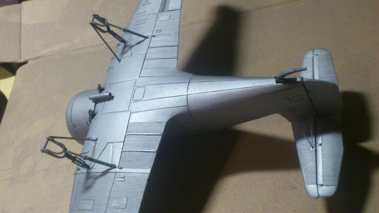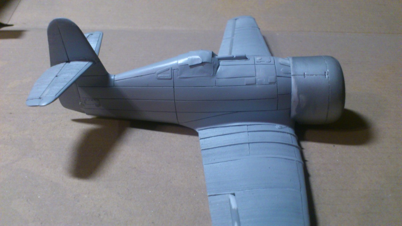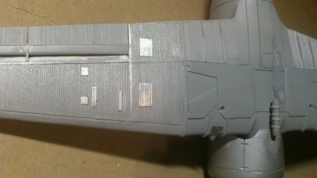 Установил стабилизатор. Задул модель серебрянкой для выявления дефектов. Прорезал окошки и вклеил стёкла, специально зделал переразмеренные что бы проще было вышкуривать зашпаклёванные швы. Обрезал капот, вырезал углубления под цилиндры.