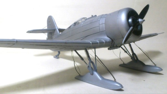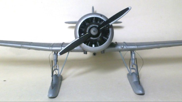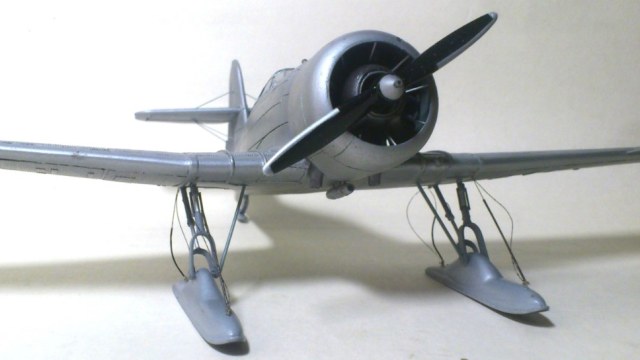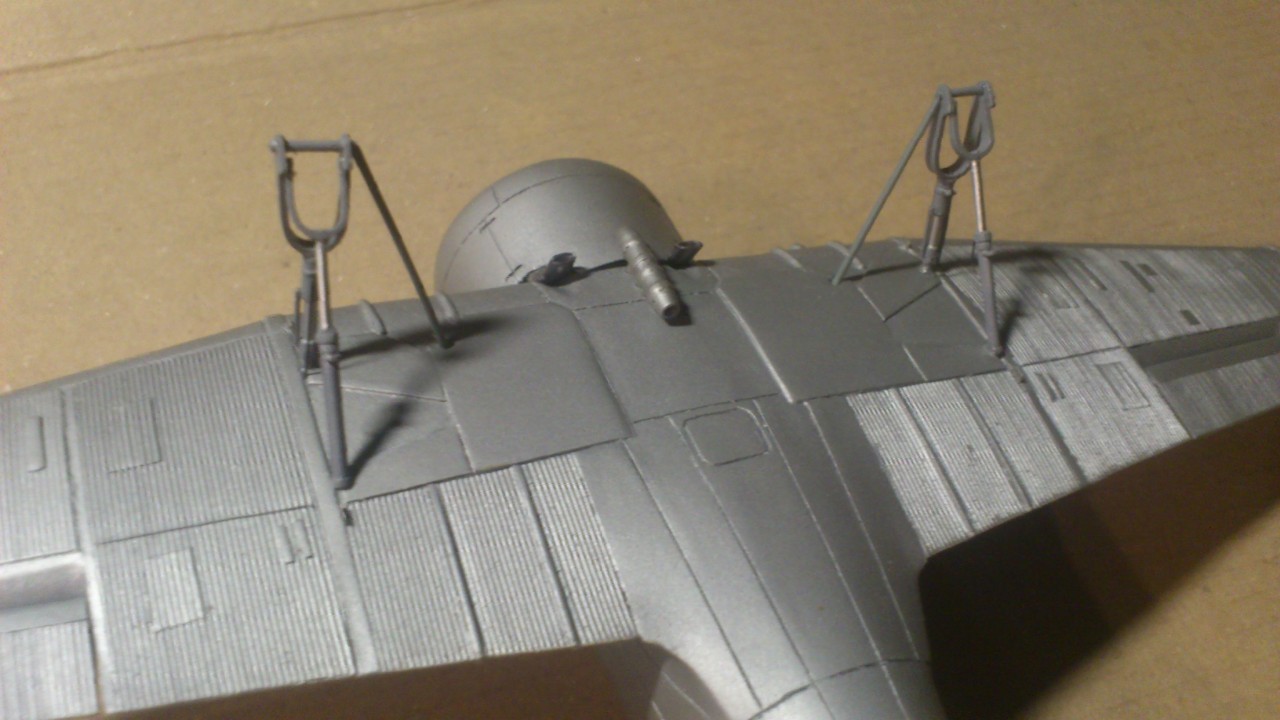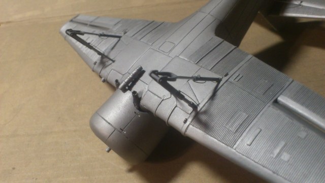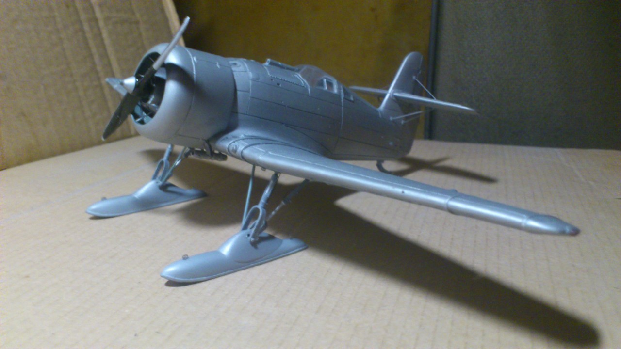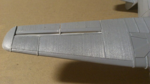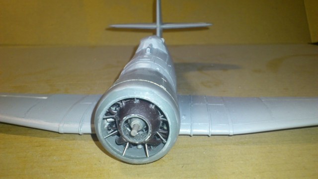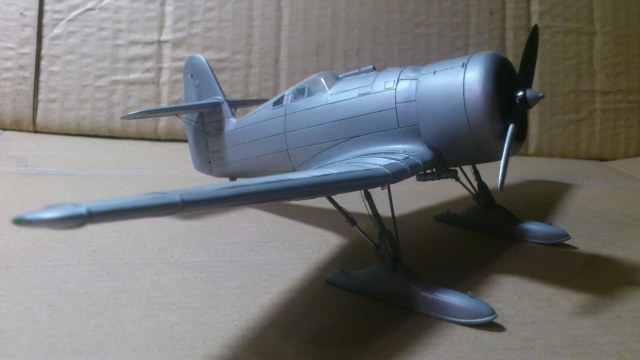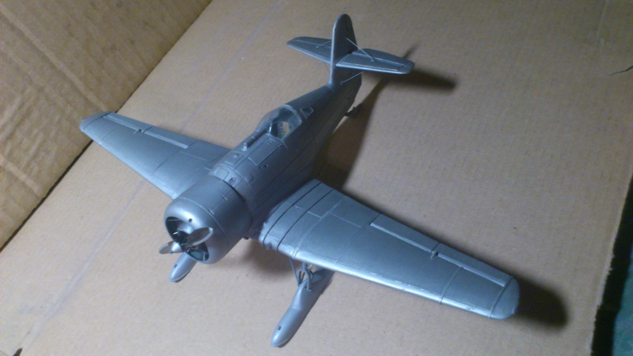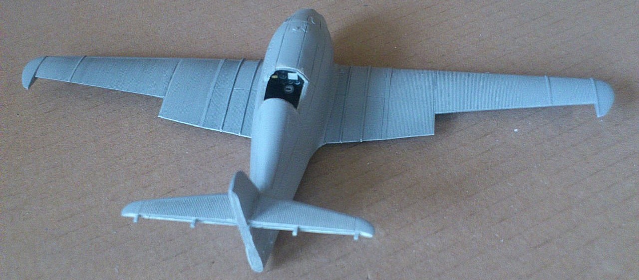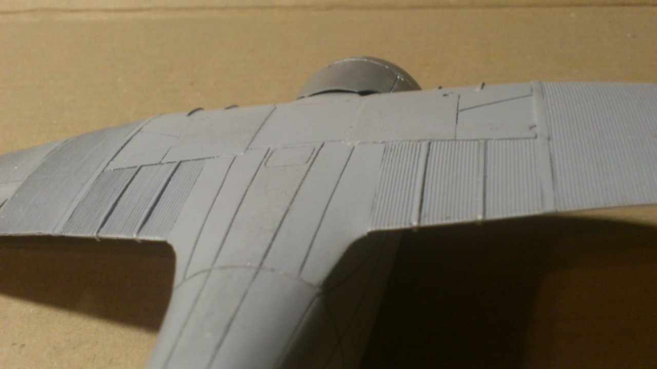 Установил стабилизатор. Задул модель серебрянкой для выявления дефектов. Прорезал окошки и вклеил стёкла, специально зделал переразмеренные что бы проще было вышкуривать зашпаклёванные швы. Обрезал капот, вырезал углубления под цилиндры.