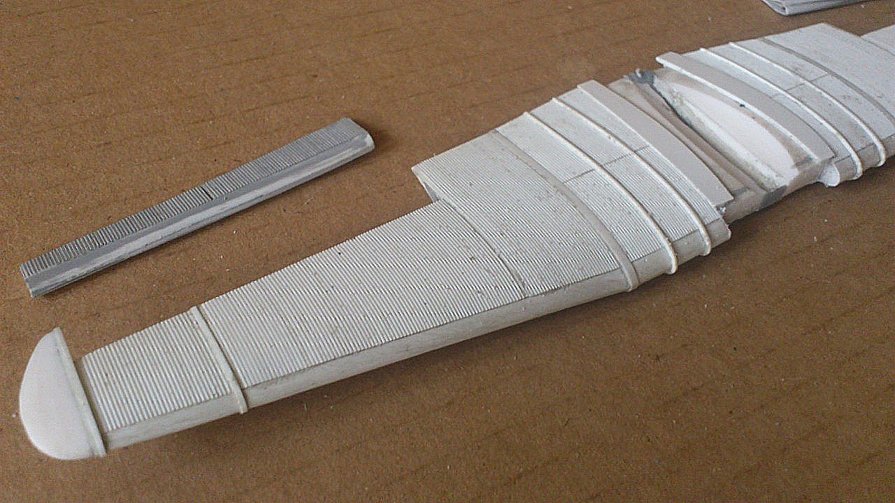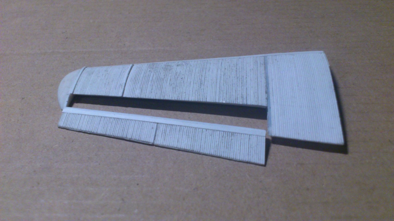 Обычно я начинаю работу с фюзеляжа, тут начал с крыла. Если гофр не получится то и Fokker D-XXI цел останется, для фюзеляжа подобрал. Крыло в принципе получилось с первого раза, но не понравилось оно мне, вроде всё как надо, но что-то не то, не знаю... Переделал. Содрал весь гофр до основы которая из крыла СБ. ( основа центроплана самодельная ). Пластик для гофра 0,5 мм, из этого расчёта делалась и основа тоесть передняя кромка, верхние и нижние поверхности занимались на ту же толщину, задняя кромка на 3 мм. Да, гофр тоже самодельный. Ну потом стабилизатор и рули управления как по маслу. Вот что вышло.